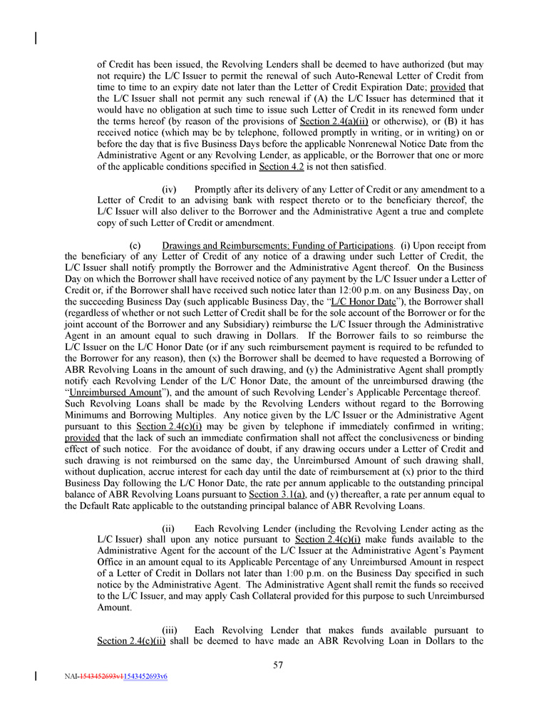 of Credit has been issued, the Revolving Lenders shall be deemed to have authorized (but may not require) the L/C Issuer to permit the renewal of such Auto - Renewal Letter of Credit from time to time to an expiry date not later than the Letter of Credit Expiration Date ; provided that the L/C Issuer shall not permit any such renewal if (A) the L/C Issuer has determined that it would have no obligation at such time to issue such Letter of Credit in its renewed form under the terms hereof (by reason of the provisions of Section 2 . 4 (a)(ii) or otherwise), or (B) it has received notice (which may be by telephone, followed promptly in writing, or in writing) on or before the day that is five Business Days before the applicable Nonrenewal Notice Date from the Administrative Agent or any Revolving Lender, as applicable, or the Borrower that one or more of the applicable conditions specified in Section 4 . 2 is not then satisfied . (iv) Promptly after its delivery of any Letter of Credit or any amendment to a Letter of Credit to an advising bank with respect thereto or to the beneficiary thereof, the L/C Issuer will also deliver to the Borrower and the Administrative Agent a true and complete copy of such Letter of Credit or amendment . (c) Drawings and Reimbursements; Funding of Participations . (i) Upon receipt from the beneficiary of any Letter of Credit of any notice of a drawing under such Letter of Credit, the L/C Issuer shall notify promptly the Borrower and the Administrative Agent thereof. On the Business Day on which the Borrower shall have received notice of any payment by the L/C Issuer under a Letter of Credit or, if the Borrower shall have received such notice later than 12:00 p.m. on any Business Day, on the succeeding Business Day (such applicable Business Day, the “ L/C Honor Date ”), the Borrower shall (regardless of whether or not such Letter of Credit shall be for the sole account of the Borrower or for the joint account of the Borrower and any Subsidiary) reimburse the L/C Issuer through the Administrative Agent in an amount equal to such drawing in Dollars. If the Borrower fails to so reimburse the L/C Issuer on the L/C Honor Date (or if any such reimbursement payment is required to be refunded to the Borrower for any reason), then (x) the Borrower shall be deemed to have requested a Borrowing of ABR Revolving Loans in the amount of such drawing, and (y) the Administrative Agent shall promptly notify each Revolving Lender of the L/C Honor Date, the amount of the unreimbursed drawing (the “ Unreimbursed Amount ”), and the amount of such Revolving Lender’s Applicable Percentage thereof. Such Revolving Loans shall be made by the Revolving Lenders without regard to the Borrowing Minimums and Borrowing Multiples. Any notice given by the L/C Issuer or the Administrative Agent pursuant to this Section 2.4(c)(i) may be given by telephone if immediately confirmed in writing; provided that the lack of such an immediate confirmation shall not affect the conclusiveness or binding effect of such notice. For the avoidance of doubt, if any drawing occurs under a Letter of Credit and such drawing is not reimbursed on the same day, the Unreimbursed Amount of such drawing shall, without duplication, accrue interest for each day until the date of reimbursement at (x) prior to the third Business Day following the L/C Honor Date, the rate per annum applicable to the outstanding principal balance of ABR Revolving Loans pursuant to Section 3.1(a) , and (y) thereafter, a rate per annum equal to the Default Rate applicable to the outstanding principal balance of ABR Revolving Loans. (ii) Each Revolving Lender (including the Revolving Lender acting as the L/C Issuer) shall upon any notice pursuant to Section 2 . 4 (c)(i) make funds available to the Administrative Agent for the account of the L/C Issuer at the Administrative Agent’s Payment Office in an amount equal to its Applicable Percentage of any Unreimbursed Amount in respect of a Letter of Credit in Dollars not later than 1 : 00 p . m . on the Business Day specified in such notice by the Administrative Agent . The Administrative Agent shall remit the funds so received to the L/C Issuer, and may apply Cash Collateral provided for this purpose to such Unreimbursed Amount . (iii) Each Revolving Lender that makes funds available pursuant to Section 2 . 4 (c)(ii) shall be deemed to have made an ABR Revolving Loan in Dollars to the 57 NAI - 1543452693v1 1543452693v6