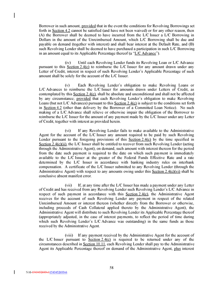 Borrower in such amount, provided that in the event the conditions for Revolving Borrowings set forth in Section 4 . 2 cannot be satisfied (and have not been waived) or for any other reason, then (A) the Borrower shall be deemed to have incurred from the L/C Issuer a L/C Borrowing in Dollars in the amount of the Unreimbursed Amount, which L/C Borrowing shall be due and payable on demand (together with interest) and shall bear interest at the Default Rate, and (B) such Revolving Lender shall be deemed to have purchased a participation in such L/C Borrowing in an amount equal to its Applicable Percentage thereof (a “ L/C Advance ”) . (iv) Until each Revolving Lender funds its Revolving Loan or L/C Advance pursuant to this Section 2 . 4 (c) to reimburse the L/C Issuer for any amount drawn under any Letter of Credit, interest in respect of such Revolving Lender’s Applicable Percentage of such amount shall be solely for the account of the L/C Issuer . (v) Each Revolving Lender’s obligation to make Revolving Loans or L/C Advances to reimburse the L/C Issuer for amounts drawn under Letters of Credit, as contemplated by this Section 2 . 4 (c) , shall be absolute and unconditional and shall not be affected by any circumstance ; provided that each Revolving Lender’s obligation to make Revolving Loans (but not L/C Advances) pursuant to this Section 2 . 4 (c) is subject to the conditions set forth in Section 4 . 2 (other than delivery by the Borrower of a Committed Loan Notice) . No such making of a L/C Advance shall relieve or otherwise impair the obligation of the Borrower to reimburse the L/C Issuer for the amount of any payment made by the L/C Issuer under any Letter of Credit, together with interest as provided herein . (vi) If any Revolving Lender fails to make available to the Administrative Agent for the account of the L/C Issuer any amount required to be paid by such Revolving Lender pursuant to the foregoing provisions of this Section 2 . 4 (c) by the time specified in Section 2 . 4 (c)(ii) , the L/C Issuer shall be entitled to recover from such Revolving Lender (acting through the Administrative Agent), on demand, such amount with interest thereon for the period from the date such payment is required to the date on which such payment is immediately available to the L/C Issuer at the greater of the Federal Funds Effective Rate and a rate determined by the L/C Issuer in accordance with banking industry rules on interbank compensation . A certificate of the L/C Issuer submitted to any Revolving Lender (through the Administrative Agent) with respect to any amounts owing under this Section 2 . 4 (c)(vi) shall be conclusive absent manifest error . (vii) If, at any time after the L/C Issuer has made a payment under any Letter of Credit and has received from any Revolving Lender such Revolving Lender’s L/C Advance in respect of such payment in accordance with this Section 2 . 4 (c) , the Administrative Agent receives for the account of such Revolving Lender any payment in respect of the related Unreimbursed Amount or interest thereon (whether directly from the Borrower or otherwise, including proceeds of Cash Collateral applied thereto by the Administrative Agent), the Administrative Agent will distribute to such Revolving Lender its Applicable Percentage thereof (appropriately adjusted, in the case of interest payments, to reflect the period of time during which such Revolving Lender’s L/C Advance was outstanding) in the same funds as those received by the Administrative Agent . (viii) If any payment received by the Administrative Agent for the account of the L/C Issuer pursuant to Section 2 . 4 (c) is required to be returned under any of the circumstances described in Section 10 . 11 , each Revolving Lender shall pay to the Administrative Agent its Applicable Percentage thereof on demand of the Administrative Agent, plus interest 58 NAI - 1543452693v1 1543452693v6
