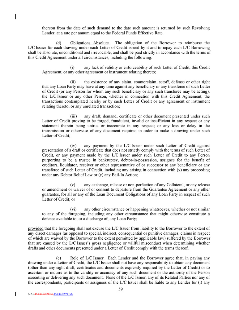 thereon from the date of such demand to the date such amount is returned by such Revolving Lender, at a rate per annum equal to the Federal Funds Effective Rate. (d) Obligations Absolute . The obligation of the Borrower to reimburse the L/C Issuer for each drawing under each Letter of Credit issued by it and to repay each L/C Borrowing shall be absolute, unconditional and irrevocable, and shall be paid strictly in accordance with the terms of this Credit Agreement under all circumstances, including the following : (i) any lack of validity or enforceability of such Letter of Credit, this Credit Agreement, or any other agreement or instrument relating thereto ; (ii) the existence of any claim, counterclaim, setoff, defense or other right that any Loan Party may have at any time against any beneficiary or any transferee of such Letter of Credit (or any Person for whom any such beneficiary or any such transferee may be acting), the L/C Issuer or any other Person, whether in connection with this Credit Agreement, the transactions contemplated hereby or by such Letter of Credit or any agreement or instrument relating thereto, or any unrelated transaction ; (iii) any draft, demand, certificate or other document presented under such Letter of Credit proving to be forged, fraudulent, invalid or insufficient in any respect or any statement therein being untrue or inaccurate in any respect ; or any loss or delay in the transmission or otherwise of any document required in order to make a drawing under such Letter of Credit ; (iv) any payment by the L/C Issuer under such Letter of Credit against presentation of a draft or certificate that does not strictly comply with the terms of such Letter of Credit, or any payment made by the L/C Issuer under such Letter of Credit to any Person purporting to be a trustee in bankruptcy, debtor - in - possession, assignee for the benefit of creditors, liquidator, receiver or other representative of or successor to any beneficiary or any transferee of such Letter of Credit, including any arising in connection with (x) any proceeding under any Debtor Relief Law or (y) any Bail - In Action ; (v) any exchange, release or non - perfection of any Collateral, or any release or amendment or waiver of or consent to departure from the Guarantee Agreement or any other guarantee, for all or any of the Loan Document Obligations of any Loan Party in respect of such Letter of Credit ; or (vi) any other circumstance or happening whatsoever, whether or not similar to any of the foregoing, including any other circumstance that might otherwise constitute a defense available to, or a discharge of, any Loan Party ; provided that the foregoing shall not excuse the L/C Issuer from liability to the Borrower to the extent of any direct damages (as opposed to special, indirect, consequential or punitive damages, claims in respect of which are waived by the Borrower to the extent permitted by applicable law) suffered by the Borrower that are caused by the L/C Issuer’s gross negligence or willful misconduct when determining whether drafts and other documents presented under a Letter of Credit comply with the terms thereof . (e) Role of L/C Issuer . Each Lender and the Borrower agree that, in paying any drawing under a Letter of Credit, the L/C Issuer shall not have any responsibility to obtain any document (other than any sight draft, certificates and documents expressly required by the Letter of Credit) or to ascertain or inquire as to the validity or accuracy of any such document or the authority of the Person executing or delivering any such document . None of the L/C Issuer, any of its Related Parties nor any of the correspondents, participants or assignees of the L/C Issuer shall be liable to any Lender for (i) any 59 NAI - 1543452693v1 1543452693v6