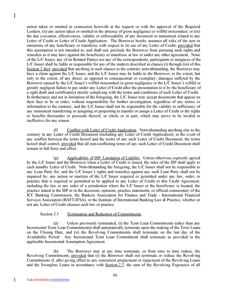 action taken or omitted in connection herewith at the request or with the approval of the Required Lenders, (ii) any action taken or omitted in the absence of gross negligence or willful misconduct; or (iii) the due execution, effectiveness, validity or enforceability of any document or instrument related to any Letter of Credit or Letter of Credit Application. The Borrower hereby assumes all risks of the acts or omissions of any beneficiary or transferee with respect to its use of any Letter of Credit; provided that this assumption is not intended to, and shall not, preclude the Borrower from pursuing such rights and remedies as it may have against the beneficiary or transferee at law or under any other agreement. None of the L/C Issuer, any of its Related Parties nor any of the correspondents, participants or assignees of the L/C Issuer shall be liable or responsible for any of the matters described in clauses (i) through (iii) of this Section 2.4(e) ; provided that anything in such clauses to the contrary notwithstanding, the Borrower may have a claim against the L/C Issuer, and the L/C Issuer may be liable to the Borrower, to the extent, but only to the extent, of any direct, as opposed to consequential or exemplary, damages suffered by the Borrower caused by the L/C Issuer’s willful misconduct or gross negligence or the L/C Issuer’s willful or grossly negligent failure to pay under any Letter of Credit after the presentation to it by the beneficiary of a sight draft and certificate(s) strictly complying with the terms and conditions of such Letter of Credit. In furtherance and not in limitation of the foregoing, the L/C Issuer may accept documents that appear on their face to be in order, without responsibility for further investigation, regardless of any notice or information to the contrary, and the L/C Issuer shall not be responsible for the validity or sufficiency of any instrument transferring or assigning or purporting to transfer or assign a Letter of Credit or the rights or benefits thereunder or proceeds thereof, in whole or in part, which may prove to be invalid or ineffective for any reason. (f) Conflict with Letter of Credit Application . Notwithstanding anything else to the contrary in any Letter of Credit Document (including any Letter of Credit Application), in the event of any conflict between the terms hereof and the terms of any such Letter of Credit Document, the terms hereof shall control, provided that all non - conflicting terms of any such Letter of Credit Document shall remain in full force and effect . (g) Applicability of ISP ; Limitation of Liability . Unless otherwise expressly agreed by the L/C Issuer and the Borrower when a Letter of Credit is issued, the rules of the ISP shall apply to each standby Letter of Credit . Notwithstanding the foregoing, the L/C Issuer shall not be responsible to any Loan Party for, and the L/C Issuer’s rights and remedies against any such Loan Party shall not be impaired by, any action or inaction of the L/C Issuer required or permitted under any law, order, or practice that is required or permitted to be applied to any Letter of Credit or this Credit Agreement, including the law or any order of a jurisdiction where the L/C Issuer or the beneficiary is located, the practice stated in the ISP or in the decisions, opinions, practice statements, or official commentary of the ICC Banking Commission, the Bankers Association for Finance and Trade - International Financial Services Association (BAFT - IFSA), or the Institute of International Banking Law & Practice, whether or not any Letter of Credit chooses such law or practice . Section 2.5 Termination and Reduction of Commitments . (a) Unless previously terminated, (i) the Term Loan Commitments (other than any Incremental Term Loan Commitments) shall automatically terminate upon the making of the Term Loans on the Closing Date, and (ii) the Revolving Commitments shall terminate on the last day of the Availability Period . Any Incremental Term Loan Commitment shall terminate as provided in the applicable Incremental Assumption Agreement . (b) The Borrower may at any time terminate, or from time to time reduce, the Revolving Commitments, provided that (i) the Borrower shall not terminate or reduce the Revolving Commitments if, after giving effect to any concurrent prepayment or repayment of the Revolving Loans and the Swingline Loans in accordance with Section 2 . 7 , the sum of the Revolving Exposures of all 60 NAI - 1543452693v1 1543452693v6