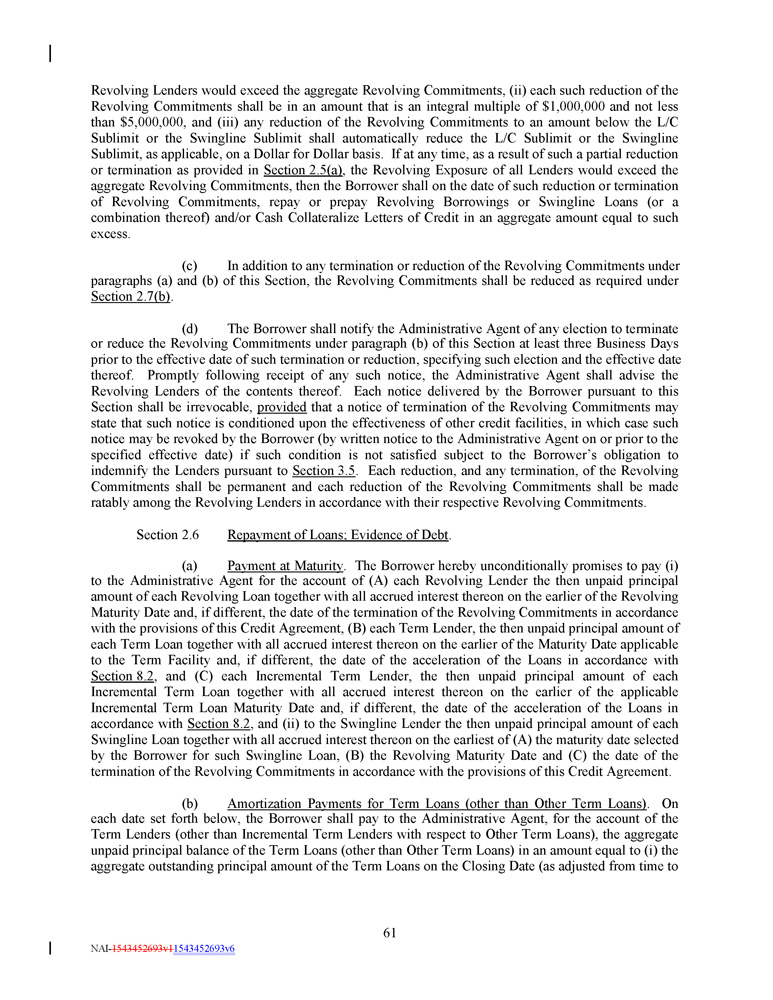 Revolving Lenders would exceed the aggregate Revolving Commitments, (ii) each such reduction of the Revolving Commitments shall be in an amount that is an integral multiple of $ 1 , 000 , 000 and not less than $ 5 , 000 , 000 , and (iii) any reduction of the Revolving Commitments to an amount below the L/C Sublimit or the Swingline Sublimit shall automatically reduce the L/C Sublimit or the Swingline Sublimit, as applicable, on a Dollar for Dollar basis . If at any time, as a result of such a partial reduction or termination as provided in Section 2 . 5 (a) , the Revolving Exposure of all Lenders would exceed the aggregate Revolving Commitments, then the Borrower shall on the date of such reduction or termination of Revolving Commitments, repay or prepay Revolving Borrowings or Swingline Loans (or a combination thereof) and/or Cash Collateralize Letters of Credit in an aggregate amount equal to such excess . (c) In addition to any termination or reduction of the Revolving Commitments under paragraphs (a) and (b) of this Section, the Revolving Commitments shall be reduced as required under Section 2 . 7 (b) . (d) The Borrower shall notify the Administrative Agent of any election to terminate or reduce the Revolving Commitments under paragraph (b) of this Section at least three Business Days prior to the effective date of such termination or reduction, specifying such election and the effective date thereof . Promptly following receipt of any such notice, the Administrative Agent shall advise the Revolving Lenders of the contents thereof . Each notice delivered by the Borrower pursuant to this Section shall be irrevocable, provided that a notice of termination of the Revolving Commitments may state that such notice is conditioned upon the effectiveness of other credit facilities, in which case such notice may be revoked by the Borrower (by written notice to the Administrative Agent on or prior to the specified effective date) if such condition is not satisfied subject to the Borrower’s obligation to indemnify the Lenders pursuant to Section 3 . 5 . Each reduction, and any termination, of the Revolving Commitments shall be permanent and each reduction of the Revolving Commitments shall be made ratably among the Revolving Lenders in accordance with their respective Revolving Commitments . Section 2.6 Repayment of Loans; Evidence of Debt . (a) Payment at Maturity . The Borrower hereby unconditionally promises to pay (i) to the Administrative Agent for the account of (A) each Revolving Lender the then unpaid principal amount of each Revolving Loan together with all accrued interest thereon on the earlier of the Revolving Maturity Date and, if different, the date of the termination of the Revolving Commitments in accordance with the provisions of this Credit Agreement, (B) each Term Lender, the then unpaid principal amount of each Term Loan together with all accrued interest thereon on the earlier of the Maturity Date applicable to the Term Facility and, if different, the date of the acceleration of the Loans in accordance with Section 8 . 2 , and (C) each Incremental Term Lender, the then unpaid principal amount of each Incremental Term Loan together with all accrued interest thereon on the earlier of the applicable Incremental Term Loan Maturity Date and, if different, the date of the acceleration of the Loans in accordance with Section 8 . 2 , and (ii) to the Swingline Lender the then unpaid principal amount of each Swingline Loan together with all accrued interest thereon on the earliest of (A) the maturity date selected by the Borrower for such Swingline Loan, (B) the Revolving Maturity Date and (C) the date of the termination of the Revolving Commitments in accordance with the provisions of this Credit Agreement . (b) Amortization Payments for Term Loans (other than Other Term Loans) . On each date set forth below, the Borrower shall pay to the Administrative Agent, for the account of the Term Lenders (other than Incremental Term Lenders with respect to Other Term Loans), the aggregate unpaid principal balance of the Term Loans (other than Other Term Loans) in an amount equal to (i) the aggregate outstanding principal amount of the Term Loans on the Closing Date (as adjusted from time to 61 NAI - 1543452693v1 1543452693v6