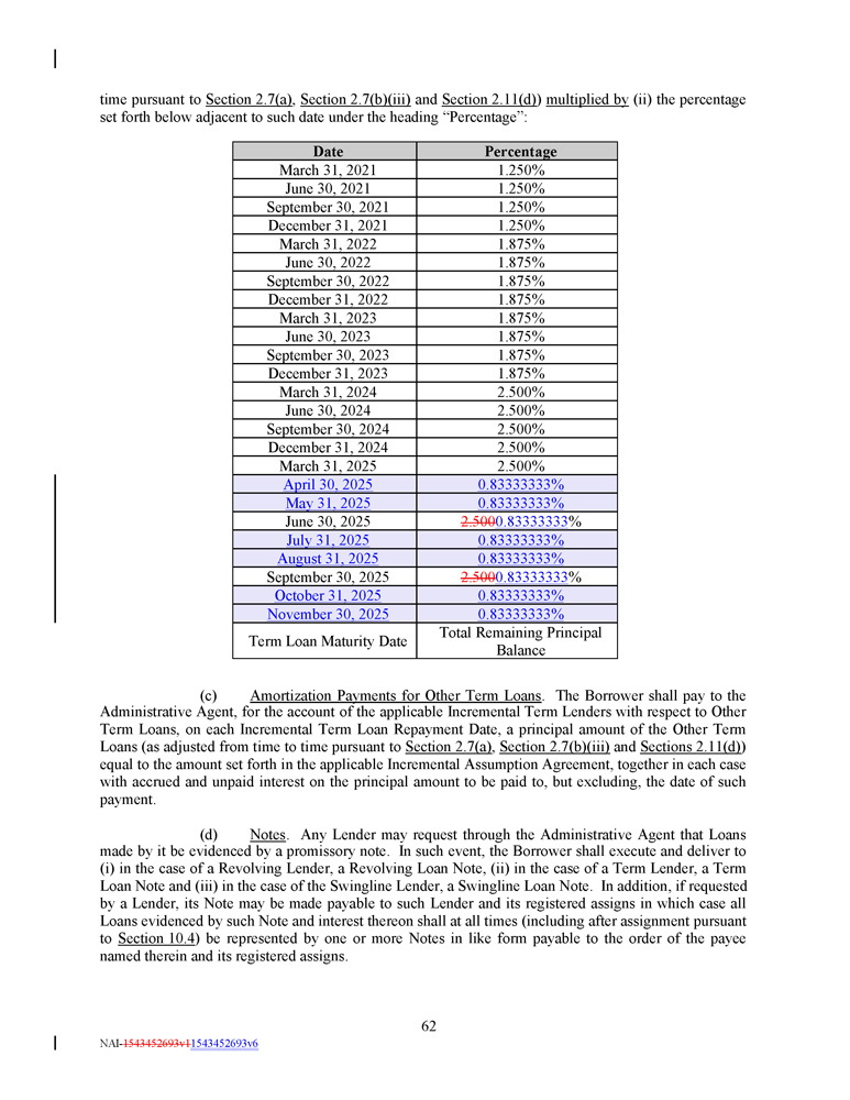 Percentage Date 1.250% March 31, 2021 1.250% June 30, 2021 1.250% September 30, 2021 1.250% December 31, 2021 1.875% March 31, 2022 1.875% June 30, 2022 1.875% September 30, 2022 1.875% December 31, 2022 1.875% March 31, 2023 1.875% June 30, 2023 1.875% September 30, 2023 1.875% December 31, 2023 2.500% March 31, 2024 2.500% June 30, 2024 2.500% September 30, 2024 2.500% December 31, 2024 2.500% March 31, 2025 0.83333333% April 30, 2025 0.83333333% May 31, 2025 2.500 0.83333333 % June 30, 2025 0.83333333% July 31, 2025 0.83333333% August 31, 2025 2.500 0.83333333 % September 30, 2025 0.83333333% October 31, 2025 0.83333333% November 30, 2025 Total Remaining Principal Balance Term Loan Maturity Date time pursuant to Section 2.7(a) , Section 2.7(b)(iii) and Section 2.11(d) ) multiplied by (ii) the percentage set forth below adjacent to such date under the heading “Percentage”: (c) Amortization Payments for Other Term Loans . The Borrower shall pay to the Administrative Agent, for the account of the applicable Incremental Term Lenders with respect to Other Term Loans, on each Incremental Term Loan Repayment Date, a principal amount of the Other Term Loans (as adjusted from time to time pursuant to Section 2 . 7 (a) , Section 2 . 7 (b)(iii) and Sections 2 . 11 (d) ) equal to the amount set forth in the applicable Incremental Assumption Agreement, together in each case with accrued and unpaid interest on the principal amount to be paid to, but excluding, the date of such payment . (d) Notes . Any Lender may request through the Administrative Agent that Loans made by it be evidenced by a promissory note . In such event, the Borrower shall execute and deliver to (i) in the case of a Revolving Lender, a Revolving Loan Note, (ii) in the case of a Term Lender, a Term Loan Note and (iii) in the case of the Swingline Lender, a Swingline Loan Note . In addition, if requested by a Lender, its Note may be made payable to such Lender and its registered assigns in which case all Loans evidenced by such Note and interest thereon shall at all times (including after assignment pursuant to Section 10 . 4 ) be represented by one or more Notes in like form payable to the order of the payee named therein and its registered assigns . 62 NAI - 1543452693v1 1543452693v6
