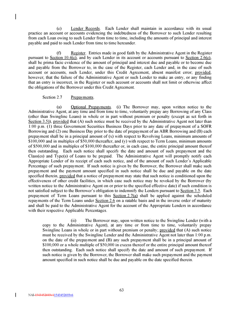 (e) Lender Records . Each Lender shall maintain in accordance with its usual practice an account or accounts evidencing the indebtedness of the Borrower to such Lender resulting from each Loan owing to such Lender from time to time, including the amounts of principal and interest payable and paid to such Lender from time to time hereunder . (f) Register . Entries made in good faith by the Administrative Agent in the Register pursuant to Section 10 . 4 (c) , and by each Lender in its account or accounts pursuant to Section 2 . 6 (e) , shall be prima facie evidence of the amount of principal and interest due and payable or to become due and payable from the Borrower to, in the case of the Register, each Lender and, in the case of such account or accounts, such Lender, under this Credit Agreement, absent manifest error ; provided , however, that the failure of the Administrative Agent or such Lender to make an entry, or any finding that an entry is incorrect, in the Register or such account or accounts shall not limit or otherwise affect the obligations of the Borrower under this Credit Agreement . Section 2 . 7 Prepayments . (a) Optional Prepayments . (i) The Borrower may, upon written notice to the Administrative Agent, at any time and from time to time, voluntarily prepay any Borrowing of any Class (other than Swingline Loans) in whole or in part without premium or penalty (except as set forth in Section 3 . 5 ) ), provided that (A) such notice must be received by the Administrative Agent not later than 1 : 00 p . m . ( 1 ) three Government Securities Business Days prior to any date of prepayment of a SOFR Borrowing and ( 2 ) one Business Day prior to the date of prepayment of an ABR Borrowing and (B) each prepayment shall be in a principal amount of (x) with respect to Revolving Loans, minimum amounts of $ 100 , 000 and in multiples of $ 50 , 000 thereafter, and (y) with respect to Term Loans, minimum amounts of $ 500 , 000 and in multiples of $ 100 , 000 thereafter or, in each case, the entire principal amount thereof then outstanding . Each such notice shall specify the date and amount of such prepayment and the Class(es) and Type(s) of Loans to be prepaid . The Administrative Agent will promptly notify each Appropriate Lender of its receipt of each such notice, and of the amount of such Lender’s Applicable Percentage of such prepayment . If such notice is given by the Borrower, the Borrower shall make such prepayment and the payment amount specified in such notice shall be due and payable on the date specified therein, provided that a notice of prepayment may state that such notice is conditioned upon the effectiveness of other credit facilities, in which case such notice may be revoked by the Borrower (by written notice to the Administrative Agent on or prior to the specified effective date) if such condition is not satisfied subject to the Borrower’s obligation to indemnify the Lenders pursuant to Section 3 . 5 . Each prepayment of Term Loans pursuant to this Section 2 . 7 (a) shall be applied against the scheduled repayments of the Term Loans under Section 2 . 6 on a ratable basis and in the inverse order of maturity and shall be paid to the Administrative Agent for the account of the Appropriate Lenders in accordance with their respective Applicable Percentages . (ii) The Borrower may, upon written notice to the Swingline Lender (with a copy to the Administrative Agent), at any time or from time to time, voluntarily prepay Swingline Loans in whole or in part without premium or penalty ; provided that (A) such notice must be received by the Swingline Lender and the Administrative Agent not later than 1 : 00 p . m . on the date of the prepayment and (B) any such prepayment shall be in a principal amount of $ 100 , 000 or a whole multiple of $ 50 , 000 in excess thereof or the entire principal amount thereof then outstanding . Each such notice shall specify the date and amount of such prepayment . If such notice is given by the Borrower, the Borrower shall make such prepayment and the payment amount specified in such notice shall be due and payable on the date specified therein . 63 NAI - 1543452693v1 1543452693v6