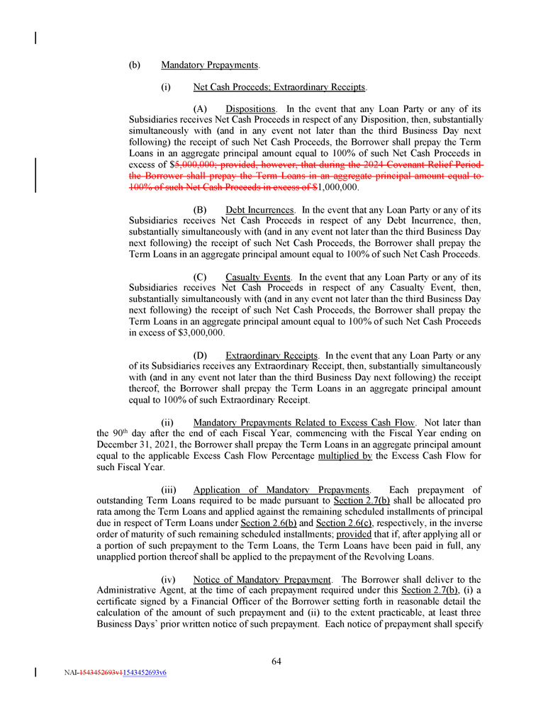 (b) Mandatory Prepayments . (i) Net Cash Proceeds; Extraordinary Receipts . (A) Dispositions . In the event that any Loan Party or any of its Subsidiaries receives Net Cash Proceeds in respect of any Disposition, then, substantially simultaneously with (and in any event not later than the third Business Day next following) the receipt of such Net Cash Proceeds, the Borrower shall prepay the Term Loans in an aggregate principal amount equal to 100 % of such Net Cash Proceeds in excess of $ 5 , 000 , 000 ; provided, however, that during the 2024 Covenant Relief Period the Borrower shall prepay the Term Loans in an aggregate principal amount equal to 100 % of such Net Cash Proceeds in excess of $ 1 , 000 , 000 . (B) Debt Incurrences . In the event that any Loan Party or any of its Subsidiaries receives Net Cash Proceeds in respect of any Debt Incurrence, then, substantially simultaneously with (and in any event not later than the third Business Day next following) the receipt of such Net Cash Proceeds, the Borrower shall prepay the Term Loans in an aggregate principal amount equal to 100 % of such Net Cash Proceeds . (C) Casualty Events . In the event that any Loan Party or any of its Subsidiaries receives Net Cash Proceeds in respect of any Casualty Event, then, substantially simultaneously with (and in any event not later than the third Business Day next following) the receipt of such Net Cash Proceeds, the Borrower shall prepay the Term Loans in an aggregate principal amount equal to 100 % of such Net Cash Proceeds in excess of $ 3 , 000 , 000 . (D) Extraordinary Receipts . In the event that any Loan Party or any of its Subsidiaries receives any Extraordinary Receipt, then, substantially simultaneously with (and in any event not later than the third Business Day next following) the receipt thereof, the Borrower shall prepay the Term Loans in an aggregate principal amount equal to 100 % of such Extraordinary Receipt . (ii) Mandatory Prepayments Related to Excess Cash Flow . Not later than the 90 th day after the end of each Fiscal Year, commencing with the Fiscal Year ending on December 31 , 2021 , the Borrower shall prepay the Term Loans in an aggregate principal amount equal to the applicable Excess Cash Flow Percentage multiplied by the Excess Cash Flow for such Fiscal Year . (iii) Application of Mandatory Prepayments . Each prepayment of outstanding Term Loans required to be made pursuant to Section 2 . 7 (b) shall be allocated pro rata among the Term Loans and applied against the remaining scheduled installments of principal due in respect of Term Loans under Section 2 . 6 (b) and Section 2 . 6 (c) , respectively, in the inverse order of maturity of such remaining scheduled installments ; provided that if, after applying all or a portion of such prepayment to the Term Loans, the Term Loans have been paid in full, any unapplied portion thereof shall be applied to the prepayment of the Revolving Loans . (iv) Notice of Mandatory Prepayment . The Borrower shall deliver to the Administrative Agent, at the time of each prepayment required under this Section 2 . 7 (b) , (i) a certificate signed by a Financial Officer of the Borrower setting forth in reasonable detail the calculation of the amount of such prepayment and (ii) to the extent practicable, at least three Business Days’ prior written notice of such prepayment . Each notice of prepayment shall specify 64 NAI - 1543452693v1 1543452693v6