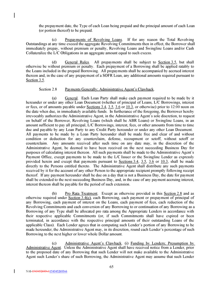 the prepayment date, the Type of each Loan being prepaid and the principal amount of each Loan (or portion thereof) to be prepaid. (c) Prepayments of Revolving Loans . If for any reason the Total Revolving Outstandings at any time exceed the aggregate Revolving Commitments then in effect, the Borrower shall immediately prepay, without premium or penalty, Revolving Loans and Swingline Loans and/or Cash Collateralize the L/C Obligations in an aggregate amount equal to such excess . (d) General Rules . All prepayments shall be subject to Section 3 . 5 , but shall otherwise be without premium or penalty . Each prepayment of a Borrowing shall be applied ratably to the Loans included in the prepaid Borrowing . All prepayments shall be accompanied by accrued interest thereon and, in the case of any prepayment of a SOFR Loan, any additional amounts required pursuant to Section 3 . 5 . Section 2.8 Payments Generally; Administrative Agent’s Clawback . (a) General . Each Loan Party shall make each payment required to be made by it hereunder or under any other Loan Document (whether of principal of Loans, L/C Borrowings, interest or fees, or of amounts payable under Sections 3.4 , 3.5 , 3.6 or 10.3 , or otherwise) prior to 12:00 noon on the date when due, in immediately available funds. In furtherance of the foregoing, the Borrower hereby irrevocably authorizes the Administrative Agent, in the Administrative Agent’s sole discretion, to request on behalf of the Borrower, Revolving Loans (which shall be ABR Loans) or Swingline Loans, in an amount sufficient to pay all principal, L/C Borrowings, interest, fees, or other amounts from time to time due and payable by any Loan Party to any Credit Party hereunder or under any other Loan Document. All payments to be made by a Loan Party hereunder shall be made free and clear of and without condition or deduction for any counterclaim, defense, recoupment or setoff, without setoff or counterclaim. Any amounts received after such time on any date may, in the discretion of the Administrative Agent, be deemed to have been received on the next succeeding Business Day for purposes of calculating interest thereon. All such payments shall be made to the Administrative Agent’s Payment Office, except payments to be made to the L/C Issuer or the Swingline Lender as expressly provided herein and except that payments pursuant to Sections 3.4 , 3.5 , 3.6 or 10.3 , shall be made directly to the Persons entitled thereto. The Administrative Agent shall distribute any such payments received by it for the account of any other Person to the appropriate recipient promptly following receipt thereof. If any payment hereunder shall be due on a day that is not a Business Day, the date for payment shall be extended to the next succeeding Business Day, and, in the case of any payment accruing interest, interest thereon shall be payable for the period of such extension. (b) Pro Rata Treatment . Except as otherwise provided in this Section 2 . 8 and as otherwise required under Section 3 . 4 (e) , each Borrowing, each payment or prepayment of principal of any Borrowing, each payment of interest on the Loans, each payment of fees, each reduction of the Revolving Commitments and each conversion of any Borrowing to or continuation of any Borrowing as a Borrowing of any Type shall be allocated pro rata among the Appropriate Lenders in accordance with their respective applicable Commitments (or, if such Commitments shall have expired or been terminated, in accordance with the respective principal amounts of their outstanding Loans of the applicable Class) . Each Lender agrees that in computing such Lender’s portion of any Borrowing to be made hereunder, the Administrative Agent may, in its discretion, round each Lender’s percentage of such Borrowing to the next higher or lower whole Dollar amount . (c) Administrative Agent’s Clawback . (i) Funding by Lenders ; Presumption by Administrative Agent . Unless the Administrative Agent shall have received notice from a Lender, prior to the proposed date of any Borrowing that such Lender will not make available to the Administrative Agent such Lender’s share of such Borrowing, the Administrative Agent may assume that such Lender 65 NAI - 1543452693v1 1543452693v6