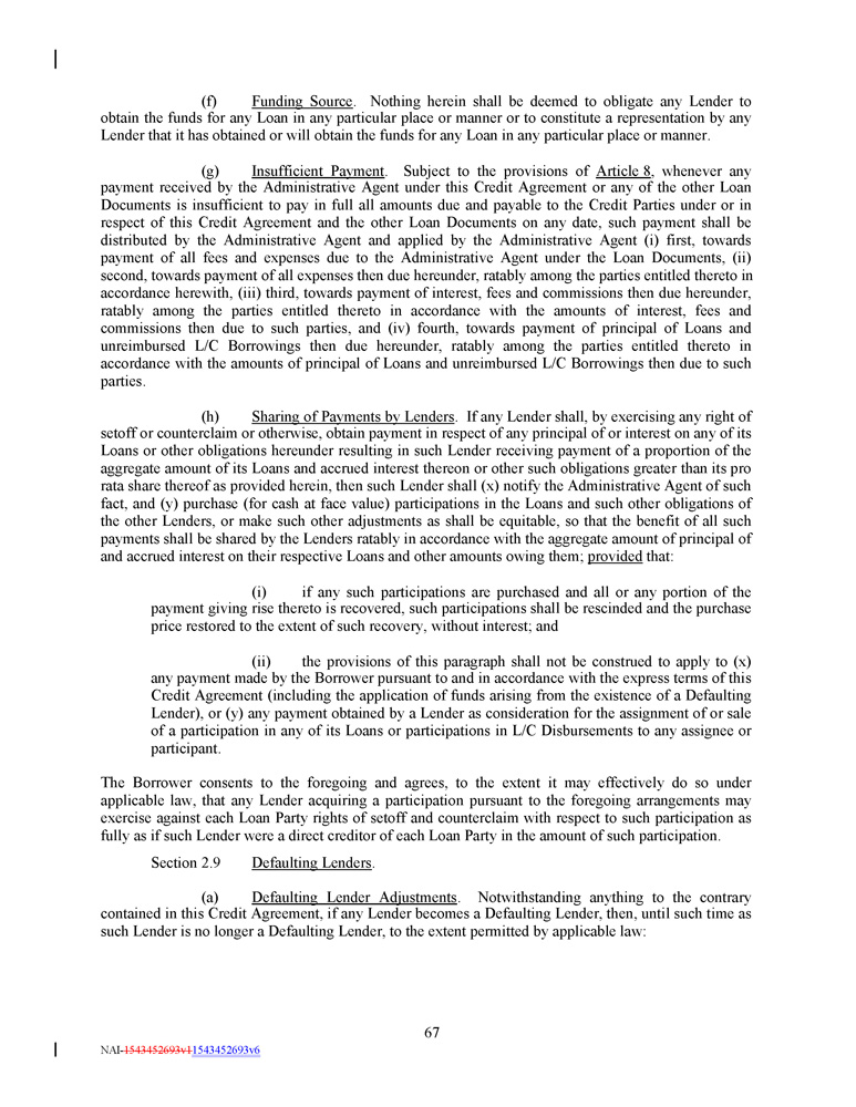 (f) Funding Source . Nothing herein shall be deemed to obligate any Lender to obtain the funds for any Loan in any particular place or manner or to constitute a representation by any Lender that it has obtained or will obtain the funds for any Loan in any particular place or manner . (g) Insufficient Payment . Subject to the provisions of Article 8 , whenever any payment received by the Administrative Agent under this Credit Agreement or any of the other Loan Documents is insufficient to pay in full all amounts due and payable to the Credit Parties under or in respect of this Credit Agreement and the other Loan Documents on any date, such payment shall be distributed by the Administrative Agent and applied by the Administrative Agent (i) first, towards payment of all fees and expenses due to the Administrative Agent under the Loan Documents, (ii) second, towards payment of all expenses then due hereunder, ratably among the parties entitled thereto in accordance herewith, (iii) third, towards payment of interest, fees and commissions then due hereunder, ratably among the parties entitled thereto in accordance with the amounts of interest, fees and commissions then due to such parties, and (iv) fourth, towards payment of principal of Loans and unreimbursed L/C Borrowings then due hereunder, ratably among the parties entitled thereto in accordance with the amounts of principal of Loans and unreimbursed L/C Borrowings then due to such parties . (h) Sharing of Payments by Lenders . If any Lender shall, by exercising any right of setoff or counterclaim or otherwise, obtain payment in respect of any principal of or interest on any of its Loans or other obligations hereunder resulting in such Lender receiving payment of a proportion of the aggregate amount of its Loans and accrued interest thereon or other such obligations greater than its pro rata share thereof as provided herein, then such Lender shall (x) notify the Administrative Agent of such fact, and (y) purchase (for cash at face value) participations in the Loans and such other obligations of the other Lenders, or make such other adjustments as shall be equitable, so that the benefit of all such payments shall be shared by the Lenders ratably in accordance with the aggregate amount of principal of and accrued interest on their respective Loans and other amounts owing them ; provided that : (i) if any such participations are purchased and all or any portion of the payment giving rise thereto is recovered, such participations shall be rescinded and the purchase price restored to the extent of such recovery, without interest ; and (ii) the provisions of this paragraph shall not be construed to apply to (x) any payment made by the Borrower pursuant to and in accordance with the express terms of this Credit Agreement (including the application of funds arising from the existence of a Defaulting Lender), or (y) any payment obtained by a Lender as consideration for the assignment of or sale of a participation in any of its Loans or participations in L/C Disbursements to any assignee or participant . The Borrower consents to the foregoing and agrees, to the extent it may effectively do so under applicable law, that any Lender acquiring a participation pursuant to the foregoing arrangements may exercise against each Loan Party rights of setoff and counterclaim with respect to such participation as fully as if such Lender were a direct creditor of each Loan Party in the amount of such participation . Section 2 . 9 Defaulting Lenders . (a) Defaulting Lender Adjustments . Notwithstanding anything to the contrary contained in this Credit Agreement, if any Lender becomes a Defaulting Lender, then, until such time as such Lender is no longer a Defaulting Lender, to the extent permitted by applicable law : 67 NAI - 1543452693v1 1543452693v6