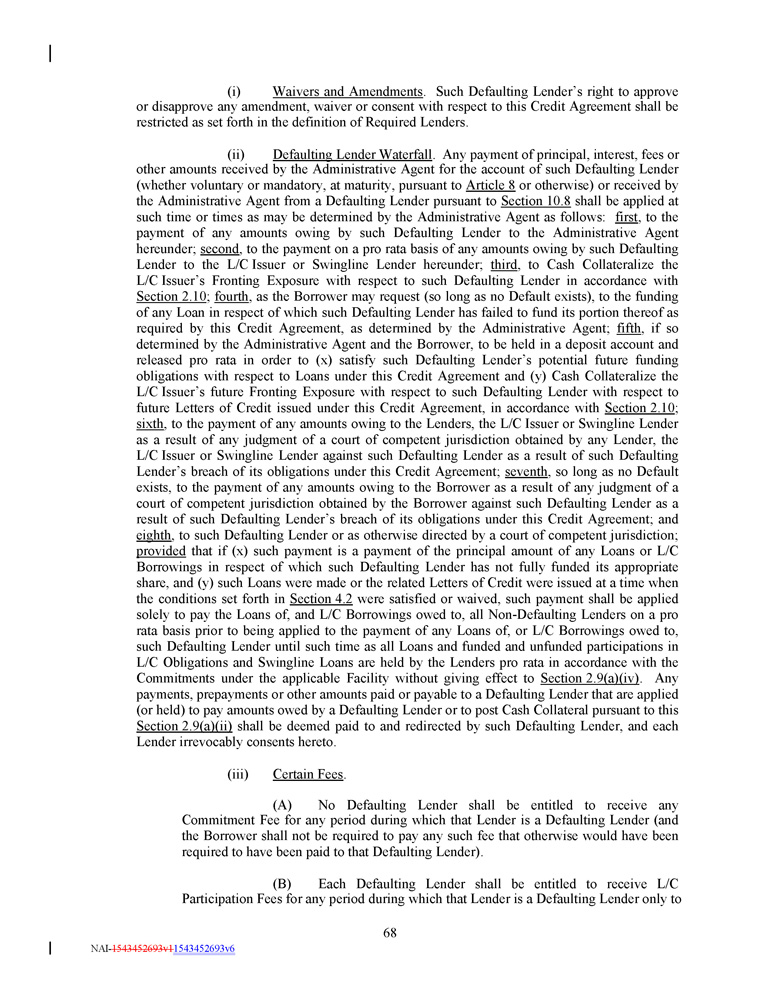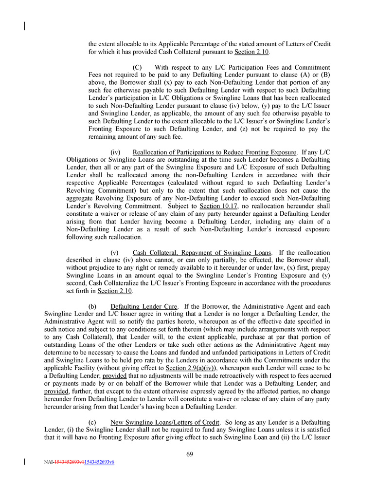 the extent allocable to its Applicable Percentage of the stated amount of Letters of Credit for which it has provided Cash Collateral pursuant to Section 2.10 . (C) With respect to any L/C Participation Fees and Commitment Fees not required to be paid to any Defaulting Lender pursuant to clause (A) or (B) above, the Borrower shall (x) pay to each Non - Defaulting Lender that portion of any such fee otherwise payable to such Defaulting Lender with respect to such Defaulting Lender’s participation in L/C Obligations or Swingline Loans that has been reallocated to such Non - Defaulting Lender pursuant to clause (iv) below, (y) pay to the L/C Issuer and Swingline Lender, as applicable, the amount of any such fee otherwise payable to such Defaulting Lender to the extent allocable to the L/C Issuer’s or Swingline Lender’s Fronting Exposure to such Defaulting Lender, and (z) not be required to pay the remaining amount of any such fee . (iv) Reallocation of Participations to Reduce Fronting Exposure . If any L/C Obligations or Swingline Loans are outstanding at the time such Lender becomes a Defaulting Lender, then all or any part of the Swingline Exposure and L/C Exposure of such Defaulting Lender shall be reallocated among the non - Defaulting Lenders in accordance with their respective Applicable Percentages (calculated without regard to such Defaulting Lender’s Revolving Commitment) but only to the extent that such reallocation does not cause the aggregate Revolving Exposure of any Non - Defaulting Lender to exceed such Non - Defaulting Lender’s Revolving Commitment . Subject to Section 10 . 17 , no reallocation hereunder shall constitute a waiver or release of any claim of any party hereunder against a Defaulting Lender arising from that Lender having become a Defaulting Lender, including any claim of a Non - Defaulting Lender as a result of such Non - Defaulting Lender’s increased exposure following such reallocation . (v) Cash Collateral, Repayment of Swingline Loans . If the reallocation described in clause (iv) above cannot, or can only partially, be effected, the Borrower shall, without prejudice to any right or remedy available to it hereunder or under law, (x) first, prepay Swingline Loans in an amount equal to the Swingline Lender’s Fronting Exposure and (y) second, Cash Collateralize the L/C Issuer’s Fronting Exposure in accordance with the procedures set forth in Section 2 . 10 . (b) Defaulting Lender Cure . If the Borrower, the Administrative Agent and each Swingline Lender and L/C Issuer agree in writing that a Lender is no longer a Defaulting Lender, the Administrative Agent will so notify the parties hereto, whereupon as of the effective date specified in such notice and subject to any conditions set forth therein (which may include arrangements with respect to any Cash Collateral), that Lender will, to the extent applicable, purchase at par that portion of outstanding Loans of the other Lenders or take such other actions as the Administrative Agent may determine to be necessary to cause the Loans and funded and unfunded participations in Letters of Credit and Swingline Loans to be held pro rata by the Lenders in accordance with the Commitments under the applicable Facility (without giving effect to Section 2 . 9 (a)(iv) ), whereupon such Lender will cease to be a Defaulting Lender ; provided that no adjustments will be made retroactively with respect to fees accrued or payments made by or on behalf of the Borrower while that Lender was a Defaulting Lender ; and provided , further, that except to the extent otherwise expressly agreed by the affected parties, no change hereunder from Defaulting Lender to Lender will constitute a waiver or release of any claim of any party hereunder arising from that Lender’s having been a Defaulting Lender . (c) New Swingline Loans/Letters of Credit . So long as any Lender is a Defaulting Lender, (i) the Swingline Lender shall not be required to fund any Swingline Loans unless it is satisfied that it will have no Fronting Exposure after giving effect to such Swingline Loan and (ii) the L/C Issuer 69 NAI - 1543452693v1 1543452693v6