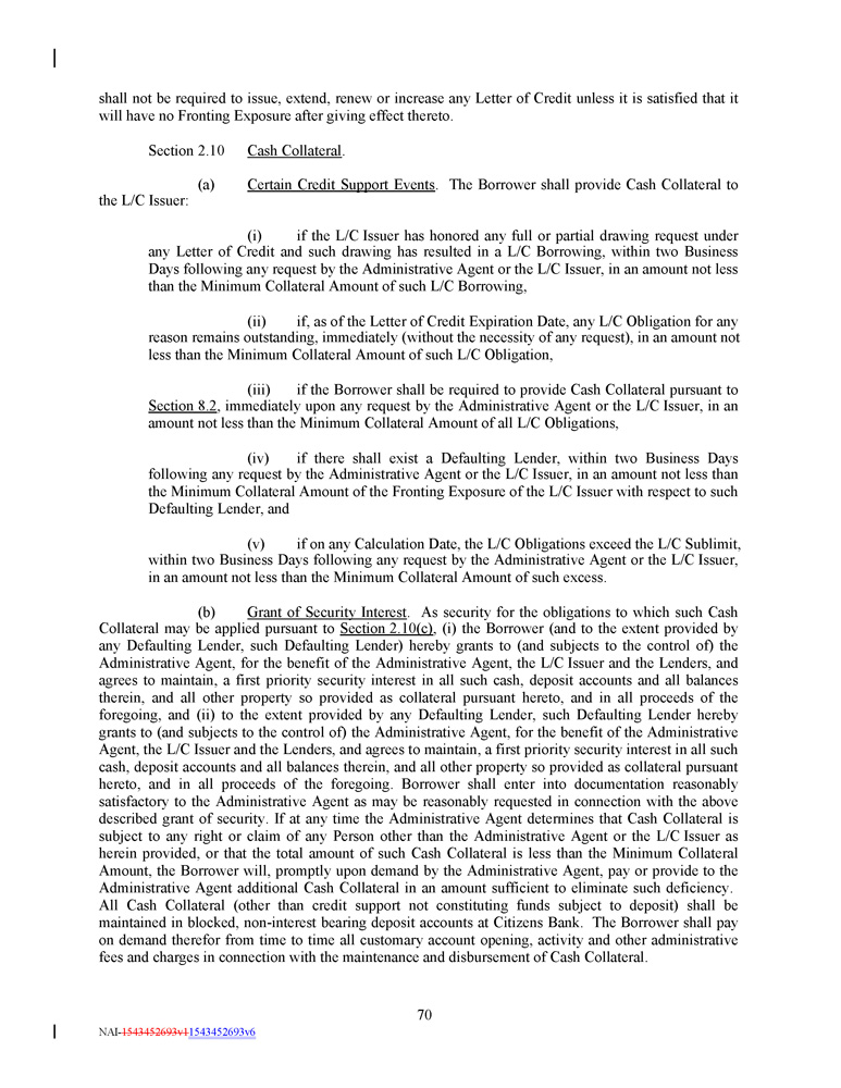 shall not be required to issue, extend, renew or increase any Letter of Credit unless it is satisfied that it will have no Fronting Exposure after giving effect thereto. Section 2.10 Cash Collateral . (a) Certain Credit Support Events . The Borrower shall provide Cash Collateral to the L/C Issuer: (i) if the L/C Issuer has honored any full or partial drawing request under any Letter of Credit and such drawing has resulted in a L/C Borrowing, within two Business Days following any request by the Administrative Agent or the L/C Issuer, in an amount not less than the Minimum Collateral Amount of such L/C Borrowing, (ii) if, as of the Letter of Credit Expiration Date, any L/C Obligation for any reason remains outstanding, immediately (without the necessity of any request), in an amount not less than the Minimum Collateral Amount of such L/C Obligation, (iii) if the Borrower shall be required to provide Cash Collateral pursuant to Section 8 . 2 , immediately upon any request by the Administrative Agent or the L/C Issuer, in an amount not less than the Minimum Collateral Amount of all L/C Obligations, (iv) if there shall exist a Defaulting Lender, within two Business Days following any request by the Administrative Agent or the L/C Issuer, in an amount not less than the Minimum Collateral Amount of the Fronting Exposure of the L/C Issuer with respect to such Defaulting Lender, and (v) if on any Calculation Date, the L/C Obligations exceed the L/C Sublimit, within two Business Days following any request by the Administrative Agent or the L/C Issuer, in an amount not less than the Minimum Collateral Amount of such excess . (b) Grant of Security Interest . As security for the obligations to which such Cash Collateral may be applied pursuant to Section 2.10(c) , (i) the Borrower (and to the extent provided by any Defaulting Lender, such Defaulting Lender) hereby grants to (and subjects to the control of) the Administrative Agent, for the benefit of the Administrative Agent, the L/C Issuer and the Lenders, and agrees to maintain, a first priority security interest in all such cash, deposit accounts and all balances therein, and all other property so provided as collateral pursuant hereto, and in all proceeds of the foregoing, and (ii) to the extent provided by any Defaulting Lender, such Defaulting Lender hereby grants to (and subjects to the control of) the Administrative Agent, for the benefit of the Administrative Agent, the L/C Issuer and the Lenders, and agrees to maintain, a first priority security interest in all such cash, deposit accounts and all balances therein, and all other property so provided as collateral pursuant hereto, and in all proceeds of the foregoing. Borrower shall enter into documentation reasonably satisfactory to the Administrative Agent as may be reasonably requested in connection with the above described grant of security. If at any time the Administrative Agent determines that Cash Collateral is subject to any right or claim of any Person other than the Administrative Agent or the L/C Issuer as herein provided, or that the total amount of such Cash Collateral is less than the Minimum Collateral Amount, the Borrower will, promptly upon demand by the Administrative Agent, pay or provide to the Administrative Agent additional Cash Collateral in an amount sufficient to eliminate such deficiency. All Cash Collateral (other than credit support not constituting funds subject to deposit) shall be maintained in blocked, non - interest bearing deposit accounts at Citizens Bank. The Borrower shall pay on demand therefor from time to time all customary account opening, activity and other administrative fees and charges in connection with the maintenance and disbursement of Cash Collateral. 70 NAI - 1543452693v1 1543452693v6