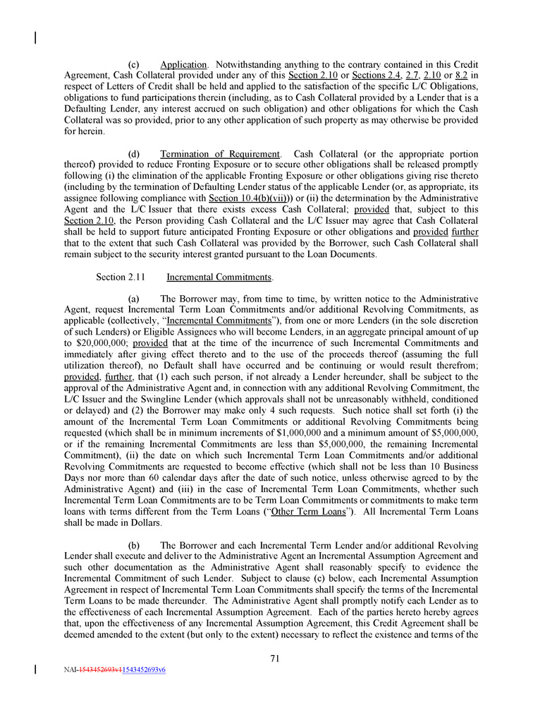 (c) Application . Notwithstanding anything to the contrary contained in this Credit Agreement, Cash Collateral provided under any of this Section 2 . 10 or Sections 2 . 4 , 2 . 7 , 2 . 10 or 8 . 2 in respect of Letters of Credit shall be held and applied to the satisfaction of the specific L/C Obligations, obligations to fund participations therein (including, as to Cash Collateral provided by a Lender that is a Defaulting Lender, any interest accrued on such obligation) and other obligations for which the Cash Collateral was so provided, prior to any other application of such property as may otherwise be provided for herein . (d) Termination of Requirement . Cash Collateral (or the appropriate portion thereof) provided to reduce Fronting Exposure or to secure other obligations shall be released promptly following (i) the elimination of the applicable Fronting Exposure or other obligations giving rise thereto (including by the termination of Defaulting Lender status of the applicable Lender (or, as appropriate, its assignee following compliance with Section 10 . 4 (b)(vii) )) or (ii) the determination by the Administrative Agent and the L/C Issuer that there exists excess Cash Collateral ; provided that, subject to this Section 2 . 10 , the Person providing Cash Collateral and the L/C Issuer may agree that Cash Collateral shall be held to support future anticipated Fronting Exposure or other obligations and provided further that to the extent that such Cash Collateral was provided by the Borrower, such Cash Collateral shall remain subject to the security interest granted pursuant to the Loan Documents . Section 2.11 Incremental Commitments . (a) The Borrower may, from time to time, by written notice to the Administrative Agent, request Incremental Term Loan Commitments and/or additional Revolving Commitments, as applicable (collectively, “ Incremental Commitments ”), from one or more Lenders (in the sole discretion of such Lenders) or Eligible Assignees who will become Lenders, in an aggregate principal amount of up to $ 20 , 000 , 000 ; provided that at the time of the incurrence of such Incremental Commitments and immediately after giving effect thereto and to the use of the proceeds thereof (assuming the full utilization thereof), no Default shall have occurred and be continuing or would result therefrom ; provided , further , that ( 1 ) each such person, if not already a Lender hereunder, shall be subject to the approval of the Administrative Agent and, in connection with any additional Revolving Commitment, the L/C Issuer and the Swingline Lender (which approvals shall not be unreasonably withheld, conditioned or delayed) and ( 2 ) the Borrower may make only 4 such requests . Such notice shall set forth (i) the amount of the Incremental Term Loan Commitments or additional Revolving Commitments being requested (which shall be in minimum increments of $ 1 , 000 , 000 and a minimum amount of $ 5 , 000 , 000 , or if the remaining Incremental Commitments are less than $ 5 , 000 , 000 , the remaining Incremental Commitment), (ii) the date on which such Incremental Term Loan Commitments and/or additional Revolving Commitments are requested to become effective (which shall not be less than 10 Business Days nor more than 60 calendar days after the date of such notice, unless otherwise agreed to by the Administrative Agent) and (iii) in the case of Incremental Term Loan Commitments, whether such Incremental Term Loan Commitments are to be Term Loan Commitments or commitments to make term loans with terms different from the Term Loans (“ Other Term Loans ”) . All Incremental Term Loans shall be made in Dollars . (b) The Borrower and each Incremental Term Lender and/or additional Revolving Lender shall execute and deliver to the Administrative Agent an Incremental Assumption Agreement and such other documentation as the Administrative Agent shall reasonably specify to evidence the Incremental Commitment of such Lender . Subject to clause (c) below, each Incremental Assumption Agreement in respect of Incremental Term Loan Commitments shall specify the terms of the Incremental Term Loans to be made thereunder . The Administrative Agent shall promptly notify each Lender as to the effectiveness of each Incremental Assumption Agreement . Each of the parties hereto hereby agrees that, upon the effectiveness of any Incremental Assumption Agreement, this Credit Agreement shall be deemed amended to the extent (but only to the extent) necessary to reflect the existence and terms of the 71 NAI - 1543452693v1 1543452693v6