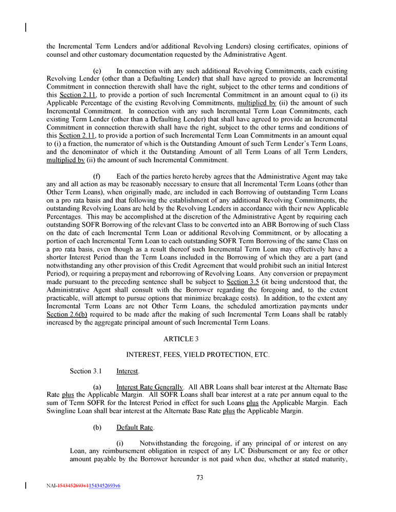 the Incremental Term Lenders and/or additional Revolving Lenders) closing certificates, opinions of counsel and other customary documentation requested by the Administrative Agent. (e) In connection with any such additional Revolving Commitments, each existing Revolving Lender (other than a Defaulting Lender) that shall have agreed to provide an Incremental Commitment in connection therewith shall have the right, subject to the other terms and conditions of this Section 2 . 11 , to provide a portion of such Incremental Commitment in an amount equal to (i) its Applicable Percentage of the existing Revolving Commitments, multiplied by (ii) the amount of such Incremental Commitment . In connection with any such Incremental Term Loan Commitments, each existing Term Lender (other than a Defaulting Lender) that shall have agreed to provide an Incremental Commitment in connection therewith shall have the right, subject to the other terms and conditions of this Section 2 . 11 , to provide a portion of such Incremental Term Loan Commitments in an amount equal to (i) a fraction, the numerator of which is the Outstanding Amount of such Term Lender’s Term Loans, and the denominator of which it the Outstanding Amount of all Term Loans of all Term Lenders, multiplied by (ii) the amount of such Incremental Commitment . (f) Each of the parties hereto hereby agrees that the Administrative Agent may take any and all action as may be reasonably necessary to ensure that all Incremental Term Loans (other than Other Term Loans), when originally made, are included in each Borrowing of outstanding Term Loans on a pro rata basis and that following the establishment of any additional Revolving Commitments, the outstanding Revolving Loans are held by the Revolving Lenders in accordance with their new Applicable Percentages . This may be accomplished at the discretion of the Administrative Agent by requiring each outstanding SOFR Borrowing of the relevant Class to be converted into an ABR Borrowing of such Class on the date of each Incremental Term Loan or additional Revolving Commitment, or by allocating a portion of each Incremental Term Loan to each outstanding SOFR Term Borrowing of the same Class on a pro rata basis, even though as a result thereof such Incremental Term Loan may effectively have a shorter Interest Period than the Term Loans included in the Borrowing of which they are a part (and notwithstanding any other provision of this Credit Agreement that would prohibit such an initial Interest Period), or requiring a prepayment and reborrowing of Revolving Loans . Any conversion or prepayment made pursuant to the preceding sentence shall be subject to Section 3 . 5 (it being understood that, the Administrative Agent shall consult with the Borrower regarding the foregoing and, to the extent practicable, will attempt to pursue options that minimize breakage costs) . In addition, to the extent any Incremental Term Loans are not Other Term Loans, the scheduled amortization payments under Section 2 . 6 (b) required to be made after the making of such Incremental Term Loans shall be ratably increased by the aggregate principal amount of such Incremental Term Loans . ARTICLE 3 INTEREST, FEES, YIELD PROTECTION, ETC. amount payable by the Borrower hereunder is not paid when due, whether at stated maturity, 73 NAI - 1543452693v1 1543452693v6 Section 3.1 Interest . (a) Interest Rate Generally . All ABR Loans shall bear interest at the Alternate Base Rate plus the Applicable Margin . All SOFR Loans shall bear interest at a rate per annum equal to the sum of Term SOFR for the Interest Period in effect for such Loans plus the Applicable Margin . Each Swingline Loan shall bear interest at the Alternate Base Rate plus the Applicable Margin . (b) Default Rate . (i) Notwithstanding the foregoing, if any principal of or interest on any Loan, any reimbursement obligation in respect of any L/C Disbursement or any fee or other