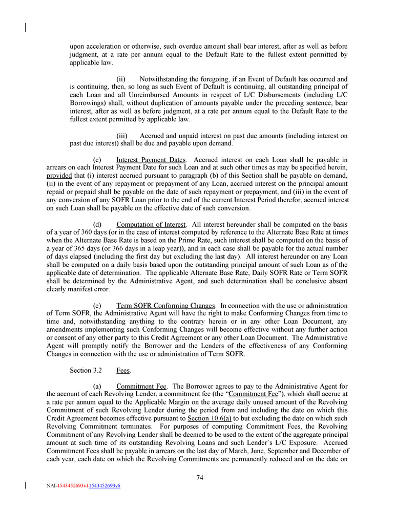 upon acceleration or otherwise, such overdue amount shall bear interest, after as well as before judgment, at a rate per annum equal to the Default Rate to the fullest extent permitted by applicable law . (ii) Notwithstanding the foregoing, if an Event of Default has occurred and is continuing, then, so long as such Event of Default is continuing, all outstanding principal of each Loan and all Unreimbursed Amounts in respect of L/C Disbursements (including L/C Borrowings) shall, without duplication of amounts payable under the preceding sentence, bear interest, after as well as before judgment, at a rate per annum equal to the Default Rate to the fullest extent permitted by applicable law . (iii) Accrued and unpaid interest on past due amounts (including interest on past due interest) shall be due and payable upon demand . (c) Interest Payment Dates . Accrued interest on each Loan shall be payable in arrears on each Interest Payment Date for such Loan and at such other times as may be specified herein, provided that (i) interest accrued pursuant to paragraph (b) of this Section shall be payable on demand, (ii) in the event of any repayment or prepayment of any Loan, accrued interest on the principal amount repaid or prepaid shall be payable on the date of such repayment or prepayment, and (iii) in the event of any conversion of any SOFR Loan prior to the end of the current Interest Period therefor, accrued interest on such Loan shall be payable on the effective date of such conversion . (d) Computation of Interest . All interest hereunder shall be computed on the basis of a year of 360 days (or in the case of interest computed by reference to the Alternate Base Rate at times when the Alternate Base Rate is based on the Prime Rate, such interest shall be computed on the basis of a year of 365 days (or 366 days in a leap year)), and in each case shall be payable for the actual number of days elapsed (including the first day but excluding the last day) . All interest hereunder on any Loan shall be computed on a daily basis based upon the outstanding principal amount of such Loan as of the applicable date of determination . The applicable Alternate Base Rate, Daily SOFR Rate or Term SOFR shall be determined by the Administrative Agent, and such determination shall be conclusive absent clearly manifest error . (e) Term SOFR Conforming Changes . In connection with the use or administration of Term SOFR, the Administrative Agent will have the right to make Conforming Changes from time to time and, notwithstanding anything to the contrary herein or in any other Loan Document, any amendments implementing such Conforming Changes will become effective without any further action or consent of any other party to this Credit Agreement or any other Loan Document . The Administrative Agent will promptly notify the Borrower and the Lenders of the effectiveness of any Conforming Changes in connection with the use or administration of Term SOFR . Section 3 . 2 Fees . (a) Commitment Fee . The Borrower agrees to pay to the Administrative Agent for the account of each Revolving Lender, a commitment fee (the “ Commitment Fee ”), which shall accrue at a rate per annum equal to the Applicable Margin on the average daily unused amount of the Revolving Commitment of such Revolving Lender during the period from and including the date on which this Credit Agreement becomes effective pursuant to Section 10 . 6 (a) to but excluding the date on which such Revolving Commitment terminates . For purposes of computing Commitment Fees, the Revolving Commitment of any Revolving Lender shall be deemed to be used to the extent of the aggregate principal amount at such time of its outstanding Revolving Loans and such Lender’s L/C Exposure . Accrued Commitment Fees shall be payable in arrears on the last day of March, June, September and December of each year, each date on which the Revolving Commitments are permanently reduced and on the date on 74 NAI - 1543452693v1 1543452693v6