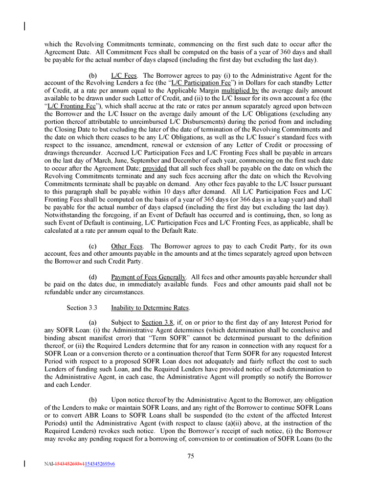 which the Revolving Commitments terminate, commencing on the first such date to occur after the Agreement Date . All Commitment Fees shall be computed on the basis of a year of 360 days and shall be payable for the actual number of days elapsed (including the first day but excluding the last day) . (b) L/C Fees . The Borrower agrees to pay (i) to the Administrative Agent for the account of the Revolving Lenders a fee (the “ L/C Participation Fee ”) in Dollars for each standby Letter of Credit, at a rate per annum equal to the Applicable Margin multiplied by the average daily amount available to be drawn under such Letter of Credit, and (ii) to the L/C Issuer for its own account a fee (the “ L/C Fronting Fee ”), which shall accrue at the rate or rates per annum separately agreed upon between the Borrower and the L/C Issuer on the average daily amount of the L/C Obligations (excluding any portion thereof attributable to unreimbursed L/C Disbursements) during the period from and including the Closing Date to but excluding the later of the date of termination of the Revolving Commitments and the date on which there ceases to be any L/C Obligations, as well as the L/C Issuer’s standard fees with respect to the issuance, amendment, renewal or extension of any Letter of Credit or processing of drawings thereunder. Accrued L/C Participation Fees and L/C Fronting Fees shall be payable in arrears on the last day of March, June, September and December of each year, commencing on the first such date to occur after the Agreement Date; provided that all such fees shall be payable on the date on which the Revolving Commitments terminate and any such fees accruing after the date on which the Revolving Commitments terminate shall be payable on demand. Any other fees payable to the L/C Issuer pursuant to this paragraph shall be payable within 10 days after demand. All L/C Participation Fees and L/C Fronting Fees shall be computed on the basis of a year of 365 days (or 366 days in a leap year) and shall be payable for the actual number of days elapsed (including the first day but excluding the last day). Notwithstanding the foregoing, if an Event of Default has occurred and is continuing , then, so long as such Event of Default is continuing, L/C Participation Fees and L/C Fronting Fees, as applicable, shall be calculated at a rate per annum equal to the Default Rate. (c) Other Fees . The Borrower agrees to pay to each Credit Party, for its own account, fees and other amounts payable in the amounts and at the times separately agreed upon between the Borrower and such Credit Party . (d) Payment of Fees Generally . All fees and other amounts payable hereunder shall be paid on the dates due, in immediately available funds . Fees and other amounts paid shall not be refundable under any circumstances . Section 3.3 Inability to Determine Rates . (a) Subject to Section 3 . 8 , if, on or prior to the first day of any Interest Period for any SOFR Loan : (i) the Administrative Agent determines (which determination shall be conclusive and binding absent manifest error) that “Term SOFR” cannot be determined pursuant to the definition thereof, or (ii) t he Required Lenders determine that for any reason in connection with any request for a SOFR Loan or a conversion thereto or a continuation thereof that Term SOFR for any requested Interest Period with respect to a proposed SOFR Loan does not adequately and fairly reflect the cost to such Lenders of funding such Loan, and the Required Lenders have provided notice of such determination to the Administrative Agent, in each case, the Administrative Agent will promptly so notify the Borrower and each Lender . (b) Upon notice thereof by the Administrative Agent to the Borrower, any obligation of the Lenders to make or maintain SOFR Loans, and any right of the Borrower to continue SOFR Loans or to convert ABR Loans to SOFR Loans shall be suspended (to the extent of the affected Interest Periods) until the Administrative Agent (with respect to clause (a)(ii) above, at the instruction of the Required Lenders) revokes such notice . Upon the Borrower’s receipt of such notice, (i) the Borrower may revoke any pending request for a borrowing of, conversion to or continuation of SOFR Loans (to the 75 NAI - 1543452693v1 1543452693v6