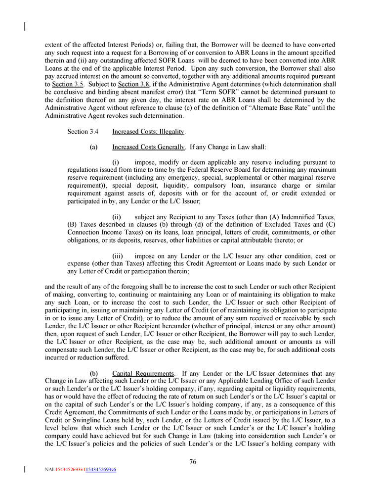 extent of the affected Interest Periods) or, failing that, the Borrower will be deemed to have converted any such request into a request for a Borrowing of or conversion to ABR Loans in the amount specified therein and (ii) any outstanding affected SOFR Loans will be deemed to have been converted into ABR Loans at the end of the applicable Interest Period . Upon any such conversion, the Borrower shall also pay accrued interest on the amount so converted, together with any additional amounts required pursuant to Section 3 . 5 . Subject to Section 3 . 8 , if the Administrative Agent determines (which determination shall be conclusive and binding absent manifest error) that “Term SOFR” cannot be determined pursuant to the definition thereof on any given day, the interest rate on ABR Loans shall be determined by the Administrative Agent without reference to clause (c) of the definition of “Alternate Base Rate” until the Administrative Agent revokes such determination . Section 3.4 Increased Costs; Illegality . (a) Increased Costs Generally . If any Change in Law shall: (i) impose, modify or deem applicable any reserve including pursuant to regulations issued from time to time by the Federal Reserve Board for determining any maximum reserve requirement (including any emergency, special, supplemental or other marginal reserve requirement)), special deposit, liquidity, compulsory loan, insurance charge or similar requirement against assets of, deposits with or for the account of, or credit extended or participated in by, any Lender or the L/C Issuer ; (ii) subject any Recipient to any Taxes (other than (A) Indemnified Taxes, (B) Taxes described in clauses (b) through (d) of the definition of Excluded Taxes and (C) Connection Income Taxes) on its loans, loan principal, letters of credit, commitments, or other obligations, or its deposits, reserves, other liabilities or capital attributable thereto ; or (iii) impose on any Lender or the L/C Issuer any other condition, cost or expense (other than Taxes) affecting this Credit Agreement or Loans made by such Lender or any Letter of Credit or participation therein ; and the result of any of the foregoing shall be to increase the cost to such Lender or such other Recipient of making, converting to, continuing or maintaining any Loan or of maintaining its obligation to make any such Loan, or to increase the cost to such Lender, the L/C Issuer or such other Recipient of participating in, issuing or maintaining any Letter of Credit (or of maintaining its obligation to participate in or to issue any Letter of Credit), or to reduce the amount of any sum received or receivable by such Lender, the L/C Issuer or other Recipient hereunder (whether of principal, interest or any other amount) then, upon request of such Lender, L/C Issuer or other Recipient, the Borrower will pay to such Lender, the L/C Issuer or other Recipient, as the case may be, such additional amount or amounts as will compensate such Lender, the L/C Issuer or other Recipient, as the case may be, for such additional costs incurred or reduction suffered . (b) Capital Requirements . If any Lender or the L/C Issuer determines that any Change in Law affecting such Lender or the L/C Issuer or any Applicable Lending Office of such Lender or such Lender’s or the L/C Issuer’s holding company, if any, regarding capital or liquidity requirements, has or would have the effect of reducing the rate of return on such Lender’s or the L/C Issuer’s capital or on the capital of such Lender’s or the L/C Issuer’s holding company, if any, as a consequence of this Credit Agreement, the Commitments of such Lender or the Loans made by, or participations in Letters of Credit or Swingline Loans held by, such Lender, or the Letters of Credit issued by the L/C Issuer, to a level below that which such Lender or the L/C Issuer or such Lender’s or the L/C Issuer’s holding company could have achieved but for such Change in Law (taking into consideration such Lender’s or the L/C Issuer’s policies and the policies of such Lender’s or the L/C Issuer’s holding company with 76 NAI - 1543452693v1 1543452693v6