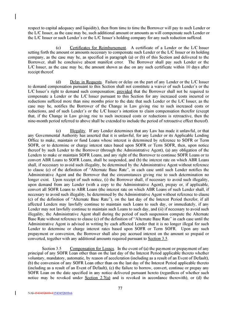respect to capital adequacy and liquidity), then from time to time the Borrower will pay to such Lender or the L/C Issuer, as the case may be, such additional amount or amounts as will compensate such Lender or the L/C Issuer or such Lender’s or the L/C Issuer’s holding company for any such reduction suffered . (c) Certificates for Reimbursement . A certificate of a Lender or the L/C Issuer setting forth the amount or amounts necessary to compensate such Lender or the L/C Issuer or its holding company, as the case may be, as specified in paragraph (a) or (b) of this Section and delivered to the Borrower, shall be conclusive absent manifest error . The Borrower shall pay such Lender or the L/C Issuer, as the case may be, the amount shown as due on any such certificate within 10 days after receipt thereof . (d) Delay in Requests . Failure or delay on the part of any Lender or the L/C Issuer to demand compensation pursuant to this Section shall not constitute a waiver of such Lender’s or the L/C Issuer’s right to demand such compensation ; provided that the Borrower shall not be required to compensate a Lender or the L/C Issuer pursuant to this Section for any increased costs incurred or reductions suffered more than nine months prior to the date that such Lender or the L/C Issuer, as the case may be, notifies the Borrower of the Change in Law giving rise to such increased costs or reductions, and of such Lender’s or the L/C Issuer’s intention to claim compensation therefor (except that, if the Change in Law giving rise to such increased costs or reductions is retroactive, then the nine - month period referred to above shall be extended to include the period of retroactive effect thereof) . (e) Illegality . If any Lender determines that any Law has made it unlawful, or that any Governmental Authority has asserted that it is unlawful, for any Lender or its Applicable Lending Office to make, maintain or fund Loans whose interest is determined by reference to SOFR or Term SOFR, or to determine or charge interest rates based upon SOFR or Term SOFR, then, upon notice thereof by such Lender to the Borrower (through the Administrative Agent), (a) any obligation of the Lenders to make or maintain SOFR Loans, and any right of the Borrower to continue SOFR Loans or to convert ABR Loans to SOFR Loans, shall be suspended, and (b) the interest rate on which ABR Loans shall, if necessary to avoid such illegality, be determined by the Administrative Agent without reference to clause (c) of the definition of “Alternate Base Rate”, in each case until such Lender notifies the Administrative Agent and the Borrower that the circumstances giving rise to such determination no longer exist . Upon receipt of such notice, (i) the Borrower shall, if necessary to avoid such illegality, upon demand from any Lender (with a copy to the Administrative Agent), prepay or, if applicable, convert all SOFR Loans to ABR Loans (the interest rate on which ABR Loans of such Lender shall, if necessary to avoid such illegality, be determined by the Administrative Agent without reference to clause (c) of the definition of “Alternate Base Rate”), on the last day of the Interest Period therefor, if all affected Lenders may lawfully continue to maintain such Loans to such day, or immediately, if any Lender may not lawfully continue to maintain such Loans to such day, and (ii) if necessary to avoid such illegality, the Administrative Agent shall during the period of such suspension compute the Alternate Base Rate without reference to clause (c) of the definition of “Alternate Base Rate” in each case until the Administrative Agent is advised in writing by each affected Lender that it is no longer illegal for such Lender to determine or charge interest rates based upon SOFR or Term SOFR . Upon any such prepayment or conversion, the Borrower shall also pay accrued interest on the amount so prepaid or converted, together with any additional amounts required pursuant to Section 3 . 5 . Section 3 . 5 Compensation for Losses . In the event of (a) the payment or prepayment of any principal of any SOFR Loan other than on the last day of the Interest Period applicable thereto whether voluntary, mandatory, automatic, by reason of acceleration (including as a result of an Event of Default), (b) the conversion of any SOFR Loan other than on the last day of the Interest Period applicable thereto (including as a result of an Event of Default), (c) the failure to borrow, convert, continue or prepay any SOFR Loan on the date specified in any notice delivered pursuant hereto (regardless of whether such notice may be revoked under Section 2.7(a) and is revoked in accordance therewith), or (d) the 77 NAI - 1543452693v1 1543452693v6