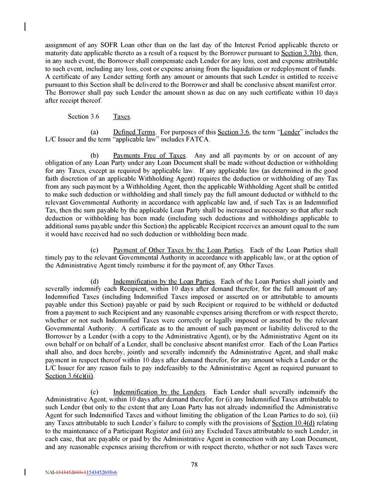 assignment of any SOFR Loan other than on the last day of the Interest Period applicable thereto or maturity date applicable thereto as a result of a request by the Borrower pursuant to Section 3 . 7 (b) , then, in any such event, the Borrower shall compensate each Lender for any loss, cost and expense attributable to such event, including any loss, cost or expense arising from the liquidation or redeployment of funds . A certificate of any Lender setting forth any amount or amounts that such Lender is entitled to receive pursuant to this Section shall be delivered to the Borrower and shall be conclusive absent manifest error . The Borrower shall pay such Lender the amount shown as due on any such certificate within 10 days after receipt thereof . Section 3.6 Taxes . (a) Defined Terms . For purposes of this Section 3 . 6 , the term “ Lender ” includes the L/C Issuer and the term “applicable law” includes FATCA . (b) Payments Free of Taxes . Any and all payments by or on account of any obligation of any Loan Party under any Loan Document shall be made without deduction or withholding for any Taxes, except as required by applicable law . If any applicable law (as determined in the good faith discretion of an applicable Withholding Agent) requires the deduction or withholding of any Tax from any such payment by a Withholding Agent, then the applicable Withholding Agent shall be entitled to make such deduction or withholding and shall timely pay the full amount deducted or withheld to the relevant Governmental Authority in accordance with applicable law and, if such Tax is an Indemnified Tax, then the sum payable by the applicable Loan Party shall be increased as necessary so that after such deduction or withholding has been made (including such deductions and withholdings applicable to additional sums payable under this Section) the applicable Recipient receives an amount equal to the sum it would have received had no such deduction or withholding been made . (c) Payment of Other Taxes by the Loan Parties . Each of the Loan Parties shall timely pay to the relevant Governmental Authority in accordance with applicable law, or at the option of the Administrative Agent timely reimburse it for the payment of, any Other Taxes . (d) Indemnification by the Loan Parties . Each of the Loan Parties shall jointly and severally indemnify each Recipient, within 10 days after demand therefor, for the full amount of any Indemnified Taxes (including Indemnified Taxes imposed or asserted on or attributable to amounts payable under this Section) payable or paid by such Recipient or required to be withheld or deducted from a payment to such Recipient and any reasonable expenses arising therefrom or with respect thereto, whether or not such Indemnified Taxes were correctly or legally imposed or asserted by the relevant Governmental Authority . A certificate as to the amount of such payment or liability delivered to the Borrower by a Lender (with a copy to the Administrative Agent), or by the Administrative Agent on its own behalf or on behalf of a Lender, shall be conclusive absent manifest error . Each of the Loan Parties shall also, and does hereby, jointly and severally indemnify the Administrative Agent, and shall make payment in respect thereof within 10 days after demand therefor, for any amount which a Lender or the L/C Issuer for any reason fails to pay indefeasibly to the Administrative Agent as required pursuant to Section 3 . 6 (e)(ii) . (e) Indemnification by the Lenders . Each Lender shall severally indemnify the Administrative Agent, within 10 days after demand therefor, for (i) any Indemnified Taxes attributable to such Lender (but only to the extent that any Loan Party has not already indemnified the Administrative Agent for such Indemnified Taxes and without limiting the obligation of the Loan Parties to do so), (ii) any Taxes attributable to such Lender’s failure to comply with the provisions of Section 10 . 4 (d) relating to the maintenance of a Participant Register and (iii) any Excluded Taxes attributable to such Lender, in each case, that are payable or paid by the Administrative Agent in connection with any Loan Document, and any reasonable expenses arising therefrom or with respect thereto, whether or not such Taxes were 78 NAI - 1543452693v1 1543452693v6