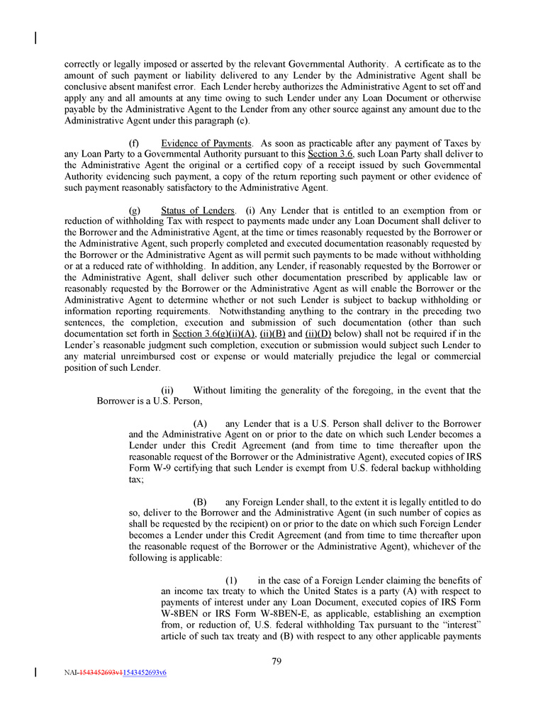 correctly or legally imposed or asserted by the relevant Governmental Authority . A certificate as to the amount of such payment or liability delivered to any Lender by the Administrative Agent shall be conclusive absent manifest error . Each Lender hereby authorizes the Administrative Agent to set off and apply any and all amounts at any time owing to such Lender under any Loan Document or otherwise payable by the Administrative Agent to the Lender from any other source against any amount due to the Administrative Agent under this paragraph (e) . (f) Evidence of Payments . As soon as practicable after any payment of Taxes by any Loan Party to a Governmental Authority pursuant to this Section 3 . 6 , such Loan Party shall deliver to the Administrative Agent the original or a certified copy of a receipt issued by such Governmental Authority evidencing such payment, a copy of the return reporting such payment or other evidence of such payment reasonably satisfactory to the Administrative Agent . (g) Status of Lenders . (i) Any Lender that is entitled to an exemption from or reduction of withholding Tax with respect to payments made under any Loan Document shall deliver to the Borrower and the Administrative Agent, at the time or times reasonably requested by the Borrower or the Administrative Agent, such properly completed and executed documentation reasonably requested by the Borrower or the Administrative Agent as will permit such payments to be made without withholding or at a reduced rate of withholding . In addition, any Lender, if reasonably requested by the Borrower or the Administrative Agent, shall deliver such other documentation prescribed by applicable law or reasonably requested by the Borrower or the Administrative Agent as will enable the Borrower or the Administrative Agent to determine whether or not such Lender is subject to backup withholding or information reporting requirements . Notwithstanding anything to the contrary in the preceding two sentences, the completion, execution and submission of such documentation (other than such documentation set forth in Section 3 . 6 (g)(ii)(A) , (ii)(B) and (ii)(D) below) shall not be required if in the Lender’s reasonable judgment such completion, execution or submission would subject such Lender to any material unreimbursed cost or expense or would materially prejudice the legal or commercial position of such Lender . (ii) Without limiting the generality of the foregoing, in the event that the Borrower is a U.S. Person, (A) any Lender that is a U . S . Person shall deliver to the Borrower and the Administrative Agent on or prior to the date on which such Lender becomes a Lender under this Credit Agreement (and from time to time thereafter upon the reasonable request of the Borrower or the Administrative Agent), executed copies of IRS Form W - 9 certifying that such Lender is exempt from U . S . federal backup withholding tax ; (B) any Foreign Lender shall, to the extent it is legally entitled to do so, deliver to the Borrower and the Administrative Agent (in such number of copies as shall be requested by the recipient) on or prior to the date on which such Foreign Lender becomes a Lender under this Credit Agreement (and from time to time thereafter upon the reasonable request of the Borrower or the Administrative Agent), whichever of the following is applicable : (1) in the case of a Foreign Lender claiming the benefits of an income tax treaty to which the United States is a party (A) with respect to payments of interest under any Loan Document, executed copies of IRS Form W - 8 BEN or IRS Form W - 8 BEN - E, as applicable, establishing an exemption from, or reduction of, U . S . federal withholding Tax pursuant to the “interest” article of such tax treaty and (B) with respect to any other applicable payments 79 NAI - 1543452693v1 1543452693v6