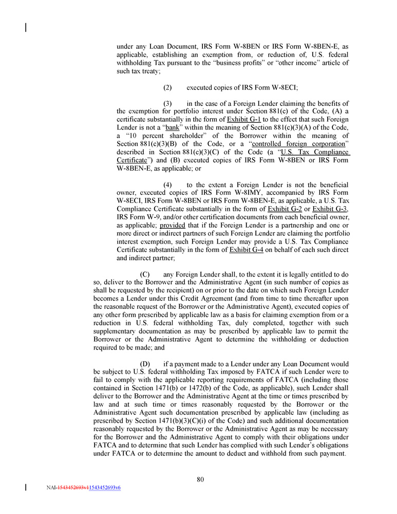 under any Loan Document, IRS Form W - 8 BEN or IRS Form W - 8 BEN - E, as applicable, establishing an exemption from, or reduction of, U . S . federal withholding Tax pursuant to the “business profits” or “other income” article of such tax treaty ; (2) executed copies of IRS Form W - 8ECI; (3) in the case of a Foreign Lender claiming the benefits of the exemption for portfolio interest under Section 881 (c) of the Code, (A) a certificate substantially in the form of Exhibit G - 1 to the effect that such Foreign Lender is not a “ bank ” within the meaning of Section 881 (c)( 3 )(A) of the Code, a “ 10 percent shareholder” of the Borrower within the meaning of Section 881 (c)( 3 )(B) of the Code, or a “ controlled foreign corporation ” described in Section 881 (c)( 3 )(C) of the Code (a “ U . S . Tax Compliance Certificate ”) and (B) executed copies of IRS Form W - 8 BEN or IRS Form W - 8 BEN - E, as applicable ; or (4) to the extent a Foreign Lender is not the beneficial owner, executed copies of IRS Form W - 8 IMY, accompanied by IRS Form W - 8 ECI, IRS Form W - 8 BEN or IRS Form W - 8 BEN - E, as applicable, a U . S . Tax Compliance Certificate substantially in the form of Exhibit G - 2 or Exhibit G - 3 , IRS Form W - 9 , and/or other certification documents from each beneficial owner, as applicable ; provided that if the Foreign Lender is a partnership and one or more direct or indirect partners of such Foreign Lender are claiming the portfolio interest exemption, such Foreign Lender may provide a U . S . Tax Compliance Certificate substantially in the form of Exhibit G - 4 on behalf of each such direct and indirect partner ; (C) any Foreign Lender shall, to the extent it is legally entitled to do so, deliver to the Borrower and the Administrative Agent (in such number of copies as shall be requested by the recipient) on or prior to the date on which such Foreign Lender becomes a Lender under this Credit Agreement (and from time to time thereafter upon the reasonable request of the Borrower or the Administrative Agent), executed copies of any other form prescribed by applicable law as a basis for claiming exemption from or a reduction in U . S . federal withholding Tax, duly completed, together with such supplementary documentation as may be prescribed by applicable law to permit the Borrower or the Administrative Agent to determine the withholding or deduction required to be made ; and (D) if a payment made to a Lender under any Loan Document would be subject to U . S . federal withholding Tax imposed by FATCA if such Lender were to fail to comply with the applicable reporting requirements of FATCA (including those contained in Section 1471 (b) or 1472 (b) of the Code, as applicable), such Lender shall deliver to the Borrower and the Administrative Agent at the time or times prescribed by law and at such time or times reasonably requested by the Borrower or the Administrative Agent such documentation prescribed by applicable law (including as prescribed by Section 1471 (b)( 3 )(C)(i) of the Code) and such additional documentation reasonably requested by the Borrower or the Administrative Agent as may be necessary for the Borrower and the Administrative Agent to comply with their obligations under FATCA and to determine that such Lender has complied with such Lender’s obligations under FATCA or to determine the amount to deduct and withhold from such payment . 80 NAI - 1543452693v1 1543452693v6