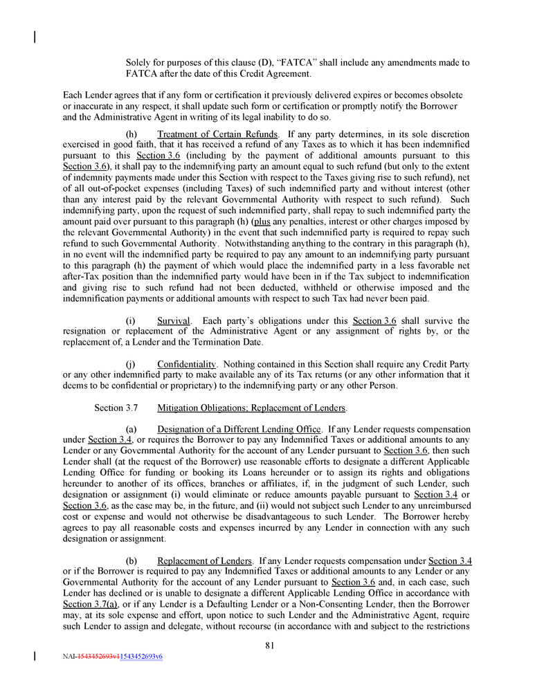 Solely for purposes of this clause (D), “FATCA” shall include any amendments made to FATCA after the date of this Credit Agreement. Each Lender agrees that if any form or certification it previously delivered expires or becomes obsolete or inaccurate in any respect, it shall update such form or certification or promptly notify the Borrower and the Administrative Agent in writing of its legal inability to do so. (h) Treatment of Certain Refunds . If any party determines, in its sole discretion exercised in good faith, that it has received a refund of any Taxes as to which it has been indemnified pursuant to this Section 3 . 6 (including by the payment of additional amounts pursuant to this Section 3 . 6 ), it shall pay to the indemnifying party an amount equal to such refund (but only to the extent of indemnity payments made under this Section with respect to the Taxes giving rise to such refund), net of all out - of - pocket expenses (including Taxes) of such indemnified party and without interest (other than any interest paid by the relevant Governmental Authority with respect to such refund) . Such indemnifying party, upon the request of such indemnified party, shall repay to such indemnified party the amount paid over pursuant to this paragraph (h) ( plus any penalties, interest or other charges imposed by the relevant Governmental Authority) in the event that such indemnified party is required to repay such refund to such Governmental Authority . Notwithstanding anything to the contrary in this paragraph (h), in no event will the indemnified party be required to pay any amount to an indemnifying party pursuant to this paragraph (h) the payment of which would place the indemnified party in a less favorable net after - Tax position than the indemnified party would have been in if the Tax subject to indemnification and giving rise to such refund had not been deducted, withheld or otherwise imposed and the indemnification payments or additional amounts with respect to such Tax had never been paid . (i) Survival . Each party’s obligations under this Section 3 . 6 shall survive the resignation or replacement of the Administrative Agent or any assignment of rights by, or the replacement of, a Lender and the Termination Date . (j) Confidentiality . Nothing contained in this Section shall require any Credit Party or any other indemnified party to make available any of its Tax returns (or any other information that it deems to be confidential or proprietary) to the indemnifying party or any other Person . Section 3.7 Mitigation Obligations; Replacement of Lenders . (a) Designation of a Different Lending Office . If any Lender requests compensation under Section 3 . 4 , or requires the Borrower to pay any Indemnified Taxes or additional amounts to any Lender or any Governmental Authority for the account of any Lender pursuant to Section 3 . 6 , then such Lender shall (at the request of the Borrower) use reasonable efforts to designate a different Applicable Lending Office for funding or booking its Loans hereunder or to assign its rights and obligations hereunder to another of its offices, branches or affiliates, if, in the judgment of such Lender, such designation or assignment (i) would eliminate or reduce amounts payable pursuant to Section 3 . 4 or Section 3 . 6 , as the case may be, in the future, and (ii) would not subject such Lender to any unreimbursed cost or expense and would not otherwise be disadvantageous to such Lender . The Borrower hereby agrees to pay all reasonable costs and expenses incurred by any Lender in connection with any such designation or assignment . (b) Replacement of Lenders . If any Lender requests compensation under Section 3 . 4 or if the Borrower is required to pay any Indemnified Taxes or additional amounts to any Lender or any Governmental Authority for the account of any Lender pursuant to Section 3 . 6 and, in each case, such Lender has declined or is unable to designate a different Applicable Lending Office in accordance with Section 3 . 7 (a) , or if any Lender is a Defaulting Lender or a Non - Consenting Lender, then the Borrower may, at its sole expense and effort, upon notice to such Lender and the Administrative Agent, require such Lender to assign and delegate, without recourse (in accordance with and subject to the restrictions 81 NAI - 1543452693v1 1543452693v6