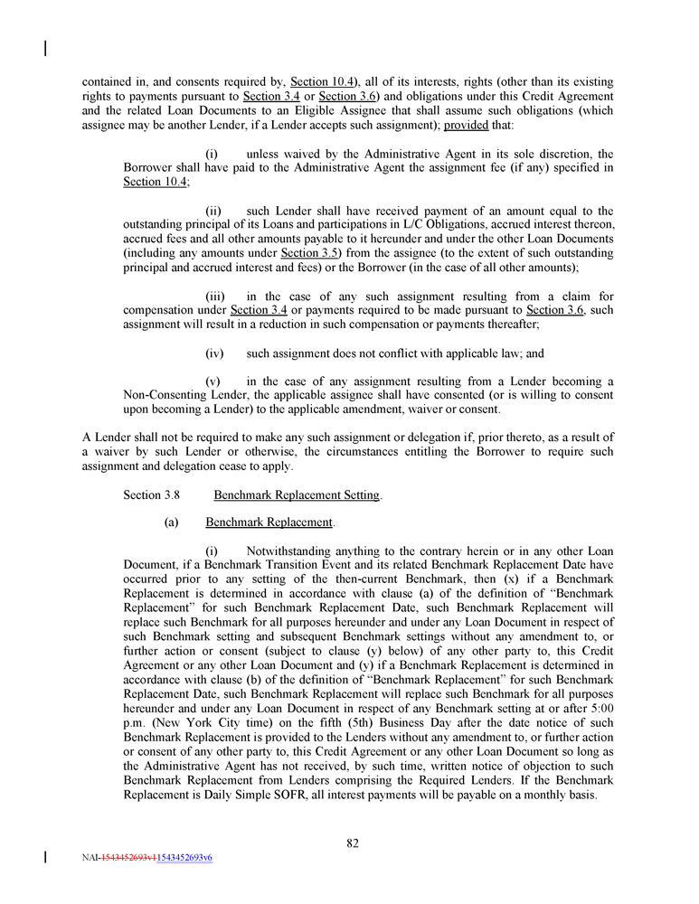 contained in, and consents required by, Section 10 . 4 ), all of its interests, rights (other than its existing rights to payments pursuant to Section 3 . 4 or Section 3 . 6 ) and obligations under this Credit Agreement and the related Loan Documents to an Eligible Assignee that shall assume such obligations (which assignee may be another Lender, if a Lender accepts such assignment) ; provided that : (i) unless waived by the Administrative Agent in its sole discretion, the Borrower shall have paid to the Administrative Agent the assignment fee (if any) specified in Section 10 . 4 ; (ii) such Lender shall have received payment of an amount equal to the outstanding principal of its Loans and participations in L/C Obligations, accrued interest thereon, accrued fees and all other amounts payable to it hereunder and under the other Loan Documents (including any amounts under Section 3 . 5 ) from the assignee (to the extent of such outstanding principal and accrued interest and fees) or the Borrower (in the case of all other amounts) ; (iii) in the case of any such assignment resulting from a claim for compensation under Section 3 . 4 or payments required to be made pursuant to Section 3 . 6 , such assignment will result in a reduction in such compensation or payments thereafter ; (iv) such assignment does not conflict with applicable law; and (v) in the case of any assignment resulting from a Lender becoming a Non - Consenting Lender, the applicable assignee shall have consented (or is willing to consent upon becoming a Lender) to the applicable amendment, waiver or consent . A Lender shall not be required to make any such assignment or delegation if, prior thereto, as a result of a waiver by such Lender or otherwise, the circumstances entitling the Borrower to require such assignment and delegation cease to apply . Section 3.8 Benchmark Replacement Setting . (a) Benchmark Replacement . (i) Notwithstanding anything to the contrary herein or in any other Loan Document, if a Benchmark Transition Event and its related Benchmark Replacement Date have occurred prior to any setting of the then - current Benchmark, then (x) if a Benchmark Replacement is determined in accordance with clause (a) of the definition of “Benchmark Replacement” for such Benchmark Replacement Date, such Benchmark Replacement will replace such Benchmark for all purposes hereunder and under any Loan Document in respect of such Benchmark setting and subsequent Benchmark settings without any amendment to, or further action or consent (subject to clause (y) below) of any other party to, this Credit Agreement or any other Loan Document and (y) if a Benchmark Replacement is determined in accordance with clause (b) of the definition of “Benchmark Replacement” for such Benchmark Replacement Date, such Benchmark Replacement will replace such Benchmark for all purposes hereunder and under any Loan Document in respect of any Benchmark setting at or after 5 : 00 p . m . (New York City time) on the fifth ( 5 th) Business Day after the date notice of such Benchmark Replacement is provided to the Lenders without any amendment to, or further action or consent of any other party to, this Credit Agreement or any other Loan Document so long as the Administrative Agent has not received, by such time, written notice of objection to such Benchmark Replacement from Lenders comprising the Required Lenders . If the Benchmark Replacement is Daily Simple SOFR, all interest payments will be payable on a monthly basis . 82 NAI - 1543452693v1 1543452693v6