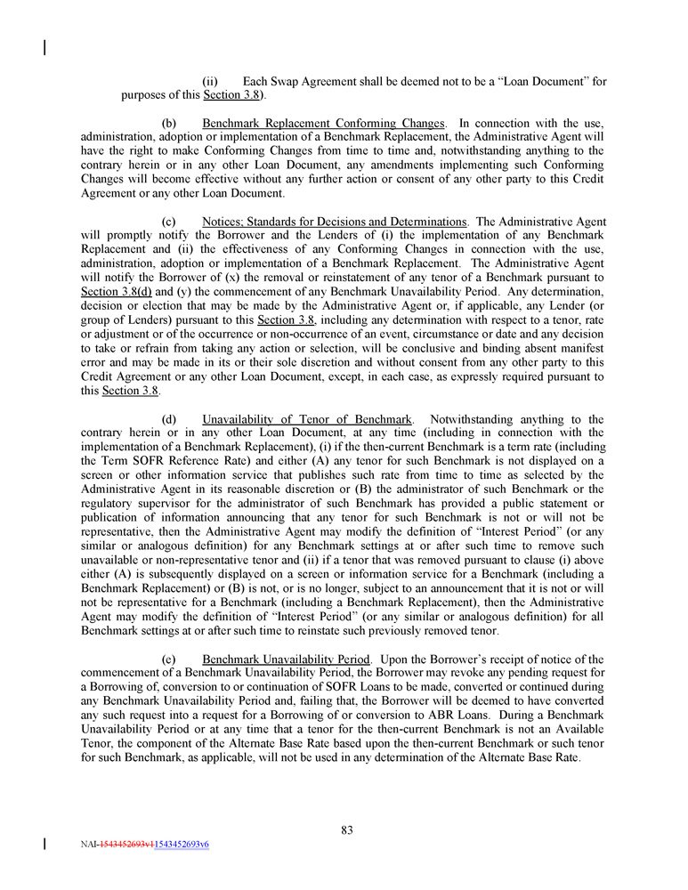 (ii) Each Swap Agreement shall be deemed not to be a “Loan Document” for purposes of this Section 3.8 ). (b) Benchmark Replacement Conforming Changes . In connection with the use, administration, adoption or implementation of a Benchmark Replacement, the Administrative Agent will have the right to make Conforming Changes from time to time and, notwithstanding anything to the contrary herein or in any other Loan Document, any amendments implementing such Conforming Changes will become effective without any further action or consent of any other party to this Credit Agreement or any other Loan Document . (c) Notices ; Standards for Decisions and Determinations . The Administrative Agent will promptly notify the Borrower and the Lenders of (i) the implementation of any Benchmark Replacement and (ii) the effectiveness of any Conforming Changes in connection with the use, administration, adoption or implementation of a Benchmark Replacement . The Administrative Agent will notify the Borrower of (x) the removal or reinstatement of any tenor of a Benchmark pursuant to Section 3 . 8 (d) and (y) the commencement of any Benchmark Unavailability Period . Any determination, decision or election that may be made by the Administrative Agent or, if applicable, any Lender (or group of Lenders) pursuant to this Section 3 . 8 , including any determination with respect to a tenor, rate or adjustment or of the occurrence or non - occurrence of an event, circumstance or date and any decision to take or refrain from taking any action or selection, will be conclusive and binding absent manifest error and may be made in its or their sole discretion and without consent from any other party to this Credit Agreement or any other Loan Document, except, in each case, as expressly required pursuant to this Section 3 . 8 . (d) Unavailability of Tenor of Benchmark . Notwithstanding anything to the contrary herein or in any other Loan Document, at any time (including in connection with the implementation of a Benchmark Replacement), (i) if the then - current Benchmark is a term rate (including the Term SOFR Reference Rate) and either (A) any tenor for such Benchmark is not displayed on a screen or other information service that publishes such rate from time to time as selected by the Administrative Agent in its reasonable discretion or (B) the administrator of such Benchmark or the regulatory supervisor for the administrator of such Benchmark has provided a public statement or publication of information announcing that any tenor for such Benchmark is not or will not be representative, then the Administrative Agent may modify the definition of “Interest Period” (or any similar or analogous definition) for any Benchmark settings at or after such time to remove such unavailable or non - representative tenor and (ii) if a tenor that was removed pursuant to clause (i) above either (A) is subsequently displayed on a screen or information service for a Benchmark (including a Benchmark Replacement) or (B) is not, or is no longer, subject to an announcement that it is not or will not be representative for a Benchmark (including a Benchmark Replacement), then the Administrative Agent may modify the definition of “Interest Period” (or any similar or analogous definition) for all Benchmark settings at or after such time to reinstate such previously removed tenor . (e) Benchmark Unavailability Period . Upon the Borrower’s receipt of notice of the commencement of a Benchmark Unavailability Period, the Borrower may revoke any pending request for a Borrowing of, conversion to or continuation of SOFR Loans to be made, converted or continued during any Benchmark Unavailability Period and, failing that, the Borrower will be deemed to have converted any such request into a request for a Borrowing of or conversion to ABR Loans . During a Benchmark Unavailability Period or at any time that a tenor for the then - current Benchmark is not an Available Tenor, the component of the Alternate Base Rate based upon the then - current Benchmark or such tenor for such Benchmark, as applicable, will not be used in any determination of the Alternate Base Rate . 83 NAI - 1543452693v1 1543452693v6