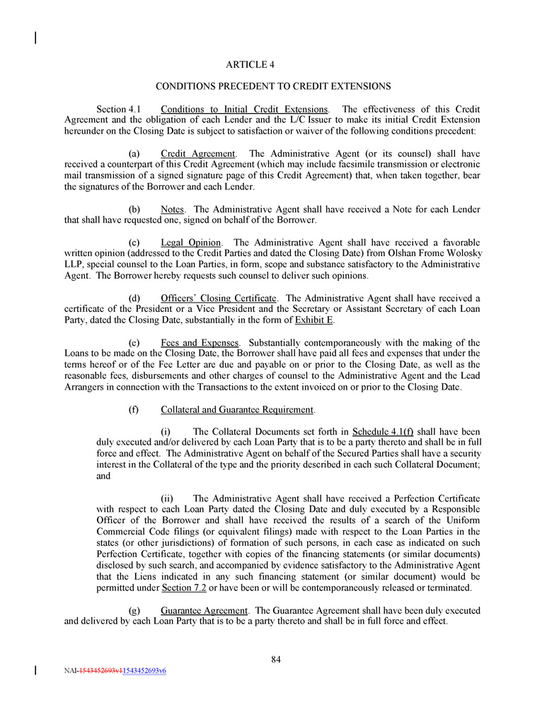 ARTICLE 4 CONDITIONS PRECEDENT TO CREDIT EXTENSIONS Section 4 . 1 Conditions to Initial Credit Extensions . The effectiveness of this Credit Agreement and the obligation of each Lender and the L/C Issuer to make its initial Credit Extension hereunder on the Closing Date is subject to satisfaction or waiver of the following conditions precedent : (a) Credit Agreement . The Administrative Agent (or its counsel) shall have received a counterpart of this Credit Agreement (which may include facsimile transmission or electronic mail transmission of a signed signature page of this Credit Agreement) that, when taken together, bear the signatures of the Borrower and each Lender . (b) Notes . The Administrative Agent shall have received a Note for each Lender that shall have requested one, signed on behalf of the Borrower . (c) Legal Opinion . The Administrative Agent shall have received a favorable written opinion (addressed to the Credit Parties and dated the Closing Date) from Olshan Frome Wolosky LLP, special counsel to the Loan Parties, in form, scope and substance satisfactory to the Administrative Agent . The Borrower hereby requests such counsel to deliver such opinions . (d) Officers’ Closing Certificate . The Administrative Agent shall have received a certificate of the President or a Vice President and the Secretary or Assistant Secretary of each Loan Party, dated the Closing Date, substantially in the form of Exhibit E . (e) Fees and Expenses . Substantially contemporaneously with the making of the Loans to be made on the Closing Date, the Borrower shall have paid all fees and expenses that under the terms hereof or of the Fee Letter are due and payable on or prior to the Closing Date, as well as the reasonable fees, disbursements and other charges of counsel to the Administrative Agent and the Lead Arrangers in connection with the Transactions to the extent invoiced on or prior to the Closing Date . (f) Collateral and Guarantee Requirement . (i) The Collateral Documents set forth in Schedule 4 . 1 (f) shall have been duly executed and/or delivered by each Loan Party that is to be a party thereto and shall be in full force and effect . The Administrative Agent on behalf of the Secured Parties shall have a security interest in the Collateral of the type and the priority described in each such Collateral Document ; and (ii) The Administrative Agent shall have received a Perfection Certificate with respect to each Loan Party dated the Closing Date and duly executed by a Responsible Officer of the Borrower and shall have received the results of a search of the Uniform Commercial Code filings (or equivalent filings) made with respect to the Loan Parties in the states (or other jurisdictions) of formation of such persons, in each case as indicated on such Perfection Certificate, together with copies of the financing statements (or similar documents) disclosed by such search, and accompanied by evidence satisfactory to the Administrative Agent that the Liens indicated in any such financing statement (or similar document) would be permitted under Section 7 . 2 or have been or will be contemporaneously released or terminated . (g) Guarantee Agreement . The Guarantee Agreement shall have been duly executed and delivered by each Loan Party that is to be a party thereto and shall be in full force and effect . 84 NAI - 1543452693v1 1543452693v6