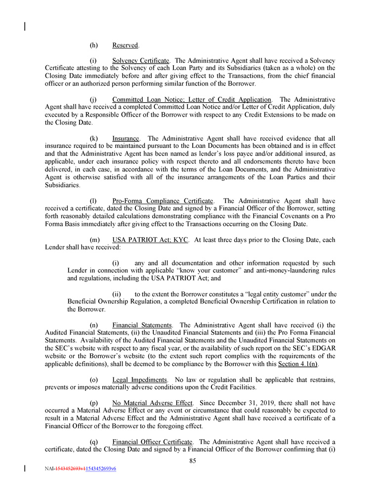 (h) 85 NAI - 1543452693v1 1543452693v6 Reserved . (i) Solvency Certificate . The Administrative Agent shall have received a Solvency Certificate attesting to the Solvency of each Loan Party and its Subsidiaries (taken as a whole) on the Closing Date immediately before and after giving effect to the Transactions, from the chief financial officer or an authorized person performing similar function of the Borrower . (j) Committed Loan Notice ; Letter of Credit Application . The Administrative Agent shall have received a completed Committed Loan Notice and/or Letter of Credit Application, duly executed by a Responsible Officer of the Borrower with respect to any Credit Extensions to be made on the Closing Date . (k) Insurance . The Administrative Agent shall have received evidence that all insurance required to be maintained pursuant to the Loan Documents has been obtained and is in effect and that the Administrative Agent has been named as lender’s loss payee and/or additional insured, as applicable, under each insurance policy with respect thereto and all endorsements thereto have been delivered, in each case, in accordance with the terms of the Loan Documents, and the Administrative Agent is otherwise satisfied with all of the insurance arrangements of the Loan Parties and their Subsidiaries . (l) Pro - Forma Compliance Certificate . The Administrative Agent shall have received a certificate, dated the Closing Date and signed by a Financial Officer of the Borrower, setting forth reasonably detailed calculations demonstrating compliance with the Financial Covenants on a Pro Forma Basis immediately after giving effect to the Transactions occurring on the Closing Date . (m) USA PATRIOT Act; KYC . At least three days prior to the Closing Date, each Lender shall have received: (i) any and all documentation and other information requested by such Lender in connection with applicable “know your customer” and anti - money - laundering rules and regulations, including the USA PATRIOT Act ; and (ii) to the extent the Borrower constitutes a “legal entity customer” under the Beneficial Ownership Regulation, a completed Beneficial Ownership Certification in relation to the Borrower . (n) Financial Statements . The Administrative Agent shall have received (i) the Audited Financial Statements, (ii) the Unaudited Financial Statements and (iii) the Pro Forma Financial Statements . Availability of the Audited Financial Statements and the Unaudited Financial Statements on the SEC’s website with respect to any fiscal year, or the availability of such report on the SEC’s EDGAR website or the Borrower’s website (to the extent such report complies with the requirements of the applicable definitions), shall be deemed to be compliance by the Borrower with this Section 4 . 1 (n) . (o) Legal Impediments . No law or regulation shall be applicable that restrains, prevents or imposes materially adverse conditions upon the Credit Facilities. (p) No Material Adverse Effect . Since December 31 , 2019 , there shall not have occurred a Material Adverse Effect or any event or circumstance that could reasonably be expected to result in a Material Adverse Effect and the Administrative Agent shall have received a certificate of a Financial Officer of the Borrower to the foregoing effect . (q) Financial Officer Certificate . The Administrative Agent shall have received a certificate, dated the Closing Date and signed by a Financial Officer of the Borrower confirming that (i)