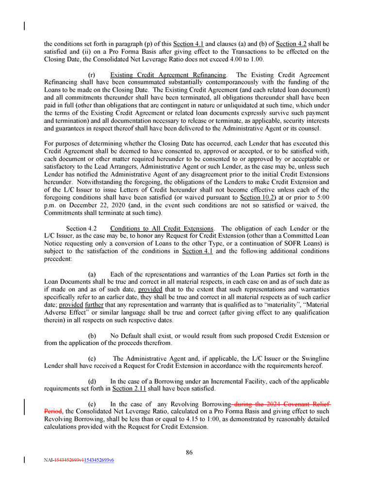 the conditions set forth in paragraph (p) of this Section 4 . 1 and clauses (a) and (b) of Section 4 . 2 shall be satisfied and (ii) on a Pro Forma Basis after giving effect to the Transactions to be effected on the Closing Date, the Consolidated Net Leverage Ratio does not exceed 4 . 00 to 1 . 00 . (r) Existing Credit Agreement Refinancing . The Existing Credit Agreement Refinancing shall have been consummated substantially contemporaneously with the funding of the Loans to be made on the Closing Date . The Existing Credit Agreement (and each related loan document) and all commitments thereunder shall have been terminated, all obligations thereunder shall have been paid in full (other than obligations that are contingent in nature or unliquidated at such time, which under the terms of the Existing Credit Agreement or related loan documents expressly survive such payment and termination) and all documentation necessary to release or terminate, as applicable, security interests and guarantees in respect thereof shall have been delivered to the Administrative Agent or its counsel . For purposes of determining whether the Closing Date has occurred, each Lender that has executed this Credit Agreement shall be deemed to have consented to, approved or accepted, or to be satisfied with, each document or other matter required hereunder to be consented to or approved by or acceptable or satisfactory to the Lead Arrangers, Administrative Agent or such Lender, as the case may be, unless such Lender has notified the Administrative Agent of any disagreement prior to the initial Credit Extensions hereunder . Notwithstanding the foregoing, the obligations of the Lenders to make Credit Extension and of the L/C Issuer to issue Letters of Credit hereunder shall not become effective unless each of the foregoing conditions shall have been satisfied (or waived pursuant to Section 10 . 2 ) at or prior to 5 : 00 p . m . on December 22 , 2020 (and, in the event such conditions are not so satisfied or waived, the Commitments shall terminate at such time) . Section 4 . 2 Conditions to All Credit Extensions . The obligation of each Lender or the L/C Issuer, as the case may be, to honor any Request for Credit Extension (other than a Committed Loan Notice requesting only a conversion of Loans to the other Type, or a continuation of SOFR Loans) is subject to the satisfaction of the conditions in Section 4 . 1 and the following additional conditions precedent : (a) Each of the representations and warranties of the Loan Parties set forth in the Loan Documents shall be true and correct in all material respects, in each case on and as of such date as if made on and as of such date, provided that to the extent that such representations and warranties specifically refer to an earlier date, they shall be true and correct in all material respects as of such earlier date ; provided further that any representation and warranty that is qualified as to “materiality”, “Material Adverse Effect” or similar language shall be true and correct (after giving effect to any qualification therein) in all respects on such respective dates . (b) No Default shall exist, or would result from such proposed Credit Extension or from the application of the proceeds therefrom. (c) The Administrative Agent and, if applicable, the L/C Issuer or the Swingline Lender shall have received a Request for Credit Extension in accordance with the requirements hereof. (d) In the case of a Borrowing under an Incremental Facility, each of the applicable requirements set forth in Section 2.11 shall have been satisfied. (e) In the case of any Revolving Borrowing during the 2024 Covenant Relief Period , the Consolidated Net Leverage Ratio, calculated on a Pro Forma Basis and giving effect to such Revolving Borrowing, shall be less than or equal to 4 . 15 to 1 : 00 , as demonstrated by reasonably detailed calculations provided with the Request for Credit Extension . 86 NAI - 1543452693v1 1543452693v6