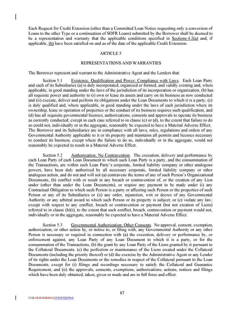 Each Request for Credit Extension (other than a Committed Loan Notice requesting only a conversion of Loans to the other Type or a continuation of SOFR Loans) submitted by the Borrower shall be deemed to be a representation and warranty that the applicable conditions specified in Sections 4 . 2 (a) and, if applicable, (b) have been satisfied on and as of the date of the applicable Credit Extension . ARTICLE 5 REPRESENTATIONS AND WARRANTIES The Borrower represent and warrant to the Administrative Agent and the Lenders that : Section 5 . 1 Existence, Qualification and Power ; Compliance with Laws . Each Loan Party and each of its Subsidiaries (a) is duly incorporated, organized or formed, and validly existing and, where applicable, in good standing under the laws of the jurisdiction of its incorporation or organization, (b) has all requisite power and authority to (i) own or lease its assets and carry on its business as now conducted and (ii) execute, deliver and perform its obligations under the Loan Documents to which it is a party, (c) is duly qualified and, where applicable, in good standing under the laws of each jurisdiction where its ownership, lease or operation of properties or the conduct of its business requires such qualification, and (d) has all requisite governmental licenses, authorizations, consents and approvals to operate its business as currently conducted ; except in each case referred to in clause (c) or (d), to the extent that failure to do so could not, individually or in the aggregate, reasonably be expected to have a Material Adverse Effect . The Borrower and its Subsidiaries are in compliance with all laws, rules, regulations and orders of any Governmental Authority applicable to it or its property and maintains all permits and licenses necessary to conduct its business, except where the failure to do so, individually or in the aggregate, would not reasonably be expected to result in a Material Adverse Effect . Section 5 . 2 Authorization ; No Contravention . The execution, delivery and performance by each Loan Party of each Loan Document to which such Loan Party is a party, and the consummation of the Transactions, are within such Loan Party’s corporate, limited liability company or other analogous powers, have been duly authorized by all necessary corporate, limited liability company or other analogous action, and do not and will not (a) contravene the terms of any of such Person’s Organizational Documents, (b) conflict with or result in any breach or contravention of, or the creation of any Lien under (other than under the Loan Documents), or require any payment to be made under (i) any Contractual Obligation to which such Person is a party or affecting such Person or the properties of such Person or any of its Subsidiaries or (ii) any order, injunction, writ or decree of any Governmental Authority or any arbitral award to which such Person or its property is subject ; or (c) violate any law ; except with respect to any conflict, breach or contravention or payment (but not creation of Liens) referred to in clause (b)(i), to the extent that such conflict, breach, contravention or payment would not, individually or in the aggregate, reasonably be expected to have a Material Adverse Effect . Section 5 . 3 Governmental Authorization ; Other Consents . No approval, consent, exemption, authorization, or other action by, or notice to, or filing with, any Governmental Authority or any other Person is necessary or required in connection with (a) the execution, delivery or performance by, or enforcement against, any Loan Party of any Loan Document to which it is a party, or for the consummation of the Transactions, (b) the grant by any Loan Party of the Liens granted by it pursuant to the Collateral Documents, (c) the perfection or maintenance of the Liens created under the Collateral Documents (including the priority thereof) or (d) the exercise by the Administrative Agent or any Lender of its rights under the Loan Documents or the remedies in respect of the Collateral pursuant to the Loan Documents, except for (i) filings and recordings necessary to satisfy the Collateral and Guarantee Requirement, and (ii) the approvals, consents, exemptions, authorizations, actions, notices and filings which have been duly obtained, taken, given or made and are in full force and effect . 87 NAI - 1543452693v1 1543452693v6