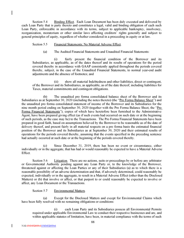 Section 5 . 4 Binding Effect . Each Loan Document has been duly executed and delivered by each Loan Party that is party thereto and constitutes a legal, valid and binding obligation of each such Loan Party, enforceable in accordance with its terms, subject to applicable bankruptcy, insolvency, reorganization, moratorium or other similar laws affecting creditors’ rights generally and subject to general principles of equity, regardless of whether considered in a proceeding in equity or at law . Section 5.5 Financial Statements; No Material Adverse Effect . (a) The Audited Financial Statements and Unaudited Financial Statements: (i) fairly present the financial condition of the Borrower and its Subsidiaries, as applicable, as of the dates thereof and its results of operations for the period covered thereby in accordance with GAAP consistently applied throughout the periods covered thereby, subject, in the case of the Unaudited Financial Statements, to normal year - end audit adjustments and the absence of footnotes ; and (ii) show all material Indebtedness and other liabilities, direct or contingent, of the Borrower and its Subsidiaries, as applicable, as of the date thereof, including liabilities for Taxes, material commitments and contingent obligations . (b) The unaudited pro forma consolidated balance sheet of the Borrower and its Subsidiaries as at September 30 , 2020 (including the notes thereto) (the “ Pro Forma Balance Sheet ”) and the unaudited pro forma consolidated statement of income of the Borrower and its Subsidiaries for the nine month period ending on September 30 , 2020 (together with the Pro Forma Balance Sheet, the “ Pro Forma Financial Statements ”), copies of which have heretofore been furnished to the Administrative Agent, have been prepared giving effect (as if such events had occurred on such date or at the beginning of such periods, as the case may be) to the Transactions . The Pro Forma Financial Statements have been prepared in good faith, based on assumptions believed by the Borrower to be reasonable as of the date of delivery thereof, and present fairly in all material respects on a pro forma basis the estimated financial position of the Borrower and its Subsidiaries as at September 30 , 2020 and their estimated results of operations for the periods covered thereby, assuming that the events specified in the preceding sentence had actually occurred at such date or at the beginning of the periods covered thereby . (c) Since December 31 , 2019 , there has been no event or circumstance, either individually or in the aggregate, that has had or would reasonably be expected to have a Material Adverse Effect . Section 5 . 6 Litigation . There are no actions, suits or proceedings by or before any arbitrator or Governmental Authority pending against any Loan Party or, to the knowledge of the Borrower, threatened against or affecting the Loan Parties or any of their Subsidiaries (a) as to which there is a reasonable possibility of an adverse determination and that, if adversely determined, could reasonably be expected, individually or in the aggregate, to result in a Material Adverse Effect (other than the Disclosed Matters) or (b) that involve or affect, or that purport to or could reasonably be expected to involve or affect, any Loan Document or the Transactions . Section 5.7 Environmental Matters . (a) Except for the Disclosed Matters and except for Environmental Claims which have been fully resolved with no remaining obligations or conditions : (i) each Loan Party and its Subsidiaries possess all Environmental Permits required under applicable Environmental Law to conduct their respective businesses and are, and within applicable statutes of limitation, have been, in material compliance with the terms of such 88 NAI - 1543452693v1 1543452693v6