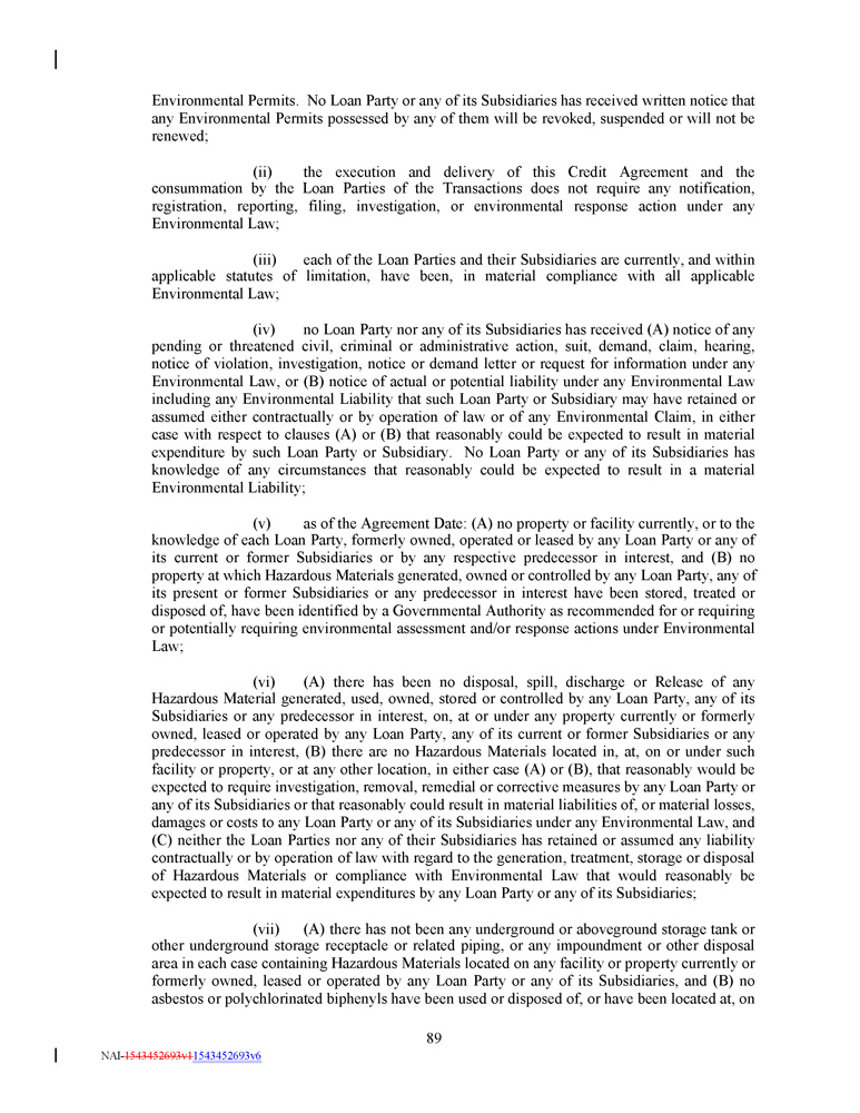 Environmental Permits . No Loan Party or any of its Subsidiaries has received written notice that any Environmental Permits possessed by any of them will be revoked, suspended or will not be renewed ; (ii) the execution and delivery of this Credit Agreement and the consummation by the Loan Parties of the Transactions does not require any notification, registration, reporting, filing, investigation, or environmental response action under any Environmental Law ; (iii) each of the Loan Parties and their Subsidiaries are currently, and within applicable statutes of limitation, have been, in material compliance with all applicable Environmental Law ; (iv) no Loan Party nor any of its Subsidiaries has received (A) notice of any pending or threatened civil, criminal or administrative action, suit, demand, claim, hearing, notice of violation, investigation, notice or demand letter or request for information under any Environmental Law, or (B) notice of actual or potential liability under any Environmental Law including any Environmental Liability that such Loan Party or Subsidiary may have retained or assumed either contractually or by operation of law or of any Environmental Claim, in either case with respect to clauses (A) or (B) that reasonably could be expected to result in material expenditure by such Loan Party or Subsidiary . No Loan Party or any of its Subsidiaries has knowledge of any circumstances that reasonably could be expected to result in a material Environmental Liability ; (v) as of the Agreement Date : (A) no property or facility currently, or to the knowledge of each Loan Party, formerly owned, operated or leased by any Loan Party or any of its current or former Subsidiaries or by any respective predecessor in interest, and (B) no property at which Hazardous Materials generated, owned or controlled by any Loan Party, any of its present or former Subsidiaries or any predecessor in interest have been stored, treated or disposed of, have been identified by a Governmental Authority as recommended for or requiring or potentially requiring environmental assessment and/or response actions under Environmental Law ; (vi) (A) there has been no disposal, spill, discharge or Release of any Hazardous Material generated, used, owned, stored or controlled by any Loan Party, any of its Subsidiaries or any predecessor in interest, on, at or under any property currently or formerly owned, leased or operated by any Loan Party, any of its current or former Subsidiaries or any predecessor in interest, (B) there are no Hazardous Materials located in, at, on or under such facility or property, or at any other location, in either case (A) or (B), that reasonably would be expected to require investigation, removal, remedial or corrective measures by any Loan Party or any of its Subsidiaries or that reasonably could result in material liabilities of, or material losses, damages or costs to any Loan Party or any of its Subsidiaries under any Environmental Law, and (C) neither the Loan Parties nor any of their Subsidiaries has retained or assumed any liability contractually or by operation of law with regard to the generation, treatment, storage or disposal of Hazardous Materials or compliance with Environmental Law that would reasonably be expected to result in material expenditures by any Loan Party or any of its Subsidiaries ; (vii) (A) there has not been any underground or aboveground storage tank or other underground storage receptacle or related piping, or any impoundment or other disposal area in each case containing Hazardous Materials located on any facility or property currently or formerly owned, leased or operated by any Loan Party or any of its Subsidiaries, and (B) no asbestos or polychlorinated biphenyls have been used or disposed of, or have been located at, on 89 NAI - 1543452693v1 1543452693v6
