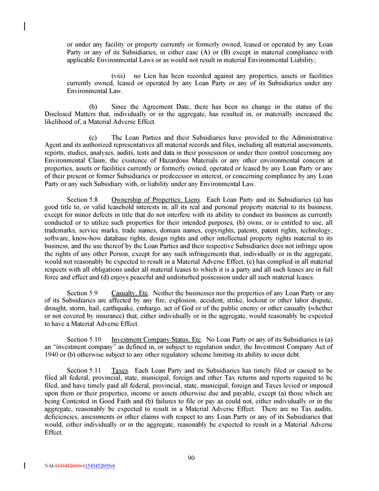 or under any facility or property currently or formerly owned, leased or operated by any Loan Party or any of its Subsidiaries, in either case (A) or (B) except in material compliance with applicable Environmental Laws or as would not result in material Environmental Liability ; (viii) no Lien has been recorded against any properties, assets or facilities currently owned, leased or operated by any Loan Party or any of its Subsidiaries under any Environmental Law . (b) Since the Agreement Date, there has been no change in the status of the Disclosed Matters that, individually or in the aggregate, has resulted in, or materially increased the likelihood of, a Material Adverse Effect . (c) The Loan Parties and their Subsidiaries have provided to the Administrative Agent and its authorized representatives all material records and files, including all material assessments, reports, studies, analyses, audits, tests and data in their possession or under their control concerning any Environmental Claim, the existence of Hazardous Materials or any other environmental concern at properties, assets or facilities currently or formerly owned, operated or leased by any Loan Party or any of their present or former Subsidiaries or predecessor in interest, or concerning compliance by any Loan Party or any such Subsidiary with, or liability under any Environmental Law . Section 5 . 8 Ownership of Properties ; Liens . Each Loan Party and its Subsidiaries (a) has good title to, or valid leasehold interests in, all its real and personal property material to its business, except for minor defects in title that do not interfere with its ability to conduct its business as currently conducted or to utilize such properties for their intended purposes, (b) owns, or is entitled to use, all trademarks, service marks, trade names, domain names, copyrights, patents, patent rights, technology, software, know - how database rights, design rights and other intellectual property rights material to its business, and the use thereof by the Loan Parties and their respective Subsidiaries does not infringe upon the rights of any other Person, except for any such infringements that, individually or in the aggregate, would not reasonably be expected to result in a Material Adverse Effect, (c) has complied in all material respects with all obligations under all material leases to which it is a party and all such leases are in full force and effect and (d) enjoys peaceful and undisturbed possession under all such material leases . Section 5 . 9 Casualty, Etc . Neither the businesses nor the properties of any Loan Party or any of its Subsidiaries are affected by any fire, explosion, accident, strike, lockout or other labor dispute, drought, storm, hail, earthquake, embargo, act of God or of the public enemy or other casualty (whether or not covered by insurance) that, either individually or in the aggregate, would reasonably be expected to have a Material Adverse Effect . Section 5 . 10 Investment Company Status, Etc . No Loan Party or any of its Subsidiaries is (a) an “investment company” as defined in, or subject to regulation under, the Investment Company Act of 1940 or (b) otherwise subject to any other regulatory scheme limiting its ability to incur debt . Section 5 . 11 Taxes . Each Loan Party and its Subsidiaries has timely filed or caused to be filed all federal, provincial, state, municipal, foreign and other Tax returns and reports required to be filed, and have timely paid all federal, provincial, state, municipal, foreign and Taxes levied or imposed upon them or their properties, income or assets otherwise due and payable, except (a) those which are being Contested in Good Faith and (b) failures to file or pay as could not, either individually or in the aggregate, reasonably be expected to result in a Material Adverse Effect . There are no Tax audits, deficiencies, assessments or other claims with respect to any Loan Party or any of its Subsidiaries that would, either individually or in the aggregate, reasonably be expected to result in a Material Adverse Effect . 90 NAI - 1543452693v1 1543452693v6