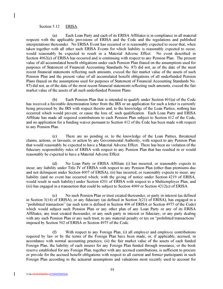 Section 5.12 91 NAI - 1543452693v1 1543452693v6 ERISA . (a) Each Loan Party and each of its ERISA Affiliates is in compliance in all material respects with the applicable provisions of ERISA and the Code and the regulations and published interpretations thereunder . No ERISA Event has occurred or is reasonably expected to occur that, when taken together with all other such ERISA Events for which liability is reasonably expected to occur, would reasonably be expected to result in a Material Adverse Effect . No event described in Section 4062 (e) of ERISA has occurred and is continuing with respect to any Pension Plan . The present value of all accumulated benefit obligations under each Pension Plan (based on the assumptions used for purposes of Statement of Financial Accounting Standards No . 87 ) did not, as of the date of the most recent financial statements reflecting such amounts, exceed the fair market value of the assets of such Pension Plan and the present value of all accumulated benefit obligations of all underfunded Pension Plans (based on the assumptions used for purposes of Statement of Financial Accounting Standards No . 87 ) did not, as of the date of the most recent financial statements reflecting such amounts, exceed the fair market value of the assets of all such underfunded Pension Plans . (b) Each Pension Plan that is intended to qualify under Section 401 (a) of the Code has received a favorable determination letter from the IRS or an application for such a letter is currently being processed by the IRS with respect thereto and, to the knowledge of the Loan Parties, nothing has occurred which would prevent, or cause the loss of, such qualification . Each Loan Party and ERISA Affiliate has made all required contributions to each Pension Plan subject to Section 412 of the Code, and no application for a funding waiver pursuant to Section 412 of the Code has been made with respect to any Pension Plan . (c) There are no pending or, to the knowledge of the Loan Parties, threatened claims, actions, or lawsuits, or action by any Governmental Authority, with respect to any Pension Plan that would reasonably be expected to have a Material Adverse Effect . There has been no violation of the fiduciary responsibility rules of ERISA with respect to any Pension Plan that has resulted in or would reasonably be expected to have a Material Adverse Effect . (d) No Loan Party or ERISA Affiliate (i) has incurred, or reasonably expects to incur, any liability under Title IV of ERISA with respect to any Pension Plan (other than premiums due and not delinquent under Section 4007 of ERISA), (ii) has incurred, or reasonably expects to incur, any liability (and no event has occurred which, with the giving of notice under Section 4219 of ERISA, would result in such liability) under Section 4201 of ERISA with respect to a Multiemployer Plan, and (iii) has engaged in a transaction that could be subject to Section 4069 or Section 4212 (c) of ERISA . (e) No such Pension Plan or trust created thereunder, or party in interest (as defined in Section 3 ( 14 ) of ERISA), or any fiduciary (as defined in Section 3 ( 21 ) of ERISA), has engaged in a “prohibited transaction” (as such term is defined in Section 406 of ERISA or Section 4975 of the Code) which would subject such Pension Plan or any other plan of any Loan Party or any of its ERISA Affiliates, any trust created thereunder, or any such party in interest or fiduciary, or any party dealing with any such Pension Plan or any such trust, to any material penalty or tax on “prohibited transactions” imposed by Section 502 of ERISA or Section 4975 of the Code . (f) With respect to any Foreign Plan, (i) all employer and employee contributions required by law or by the terms of the Foreign Plan have been made, or, if applicable, accrued, in accordance with normal accounting practices ; (ii) the fair market value of the assets of each funded Foreign Plan, the liability of each insurer for any Foreign Plan funded through insurance, or the book reserve established for any Foreign Plan, together with any accrued contributions, is sufficient to procure or provide for the accrued benefit obligations with respect to all current and former participants in such Foreign Plan according to the actuarial assumptions and valuations most recently used to account for