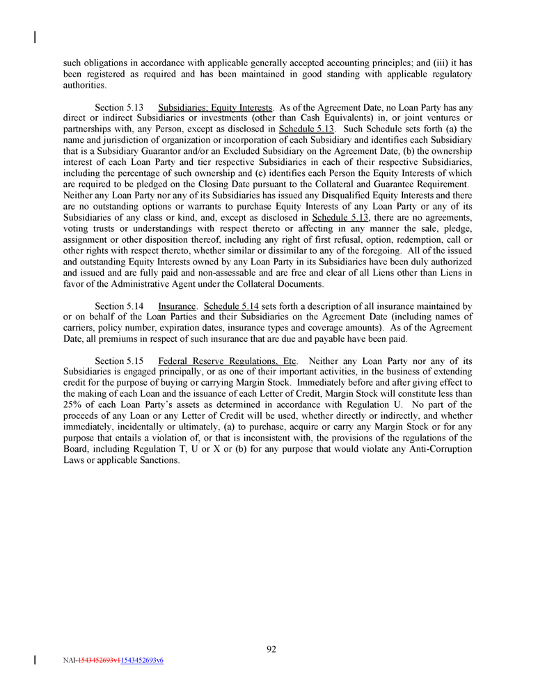 such obligations in accordance with applicable generally accepted accounting principles ; and (iii) it has been registered as required and has been maintained in good standing with applicable regulatory authorities . Section 5.13 Subsidiaries; Equity Interests . As of the Agreement Date, no Loan Party has any direct or indirect Subsidiaries or investments (other than Cash Equivalents) in, or joint ventures or partnerships with, any Person, except as disclosed in Schedule 5.13 . Such Schedule sets forth (a) the name and jurisdiction of organization or incorporation of each Subsidiary and identifies each Subsidiary that is a Subsidiary Guarantor and/or an Excluded Subsidiary on the Agreement Date, (b) the ownership interest of each Loan Party and tier respective Subsidiaries in each of their respective Subsidiaries, including the percentage of such ownership and (c) identifies each Person the Equity Interests of which are required to be pledged on the Closing Date pursuant to the Collateral and Guarantee Requirement. Neither any Loan Party nor any of its Subsidiaries has issued any Disqualified Equity Interests and there are no outstanding options or warrants to purchase Equity Interests of any Loan Party or any of its Subsidiaries of any class or kind, and, except as disclosed in Schedule 5.13 , there are no agreements, voting trusts or understandings with respect thereto or affecting in any manner the sale, pledge, assignment or other disposition thereof, including any right of first refusal, option, redemption, call or other rights with respect thereto, whether similar or dissimilar to any of the foregoing. All of the issued and outstanding Equity Interests owned by any Loan Party in its Subsidiaries have been duly authorized and issued and are fully paid and non - assessable and are free and clear of all Liens other than Liens in favor of the Administrative Agent under the Collateral Documents. Section 5 . 14 Insurance . Schedule 5 . 14 sets forth a description of all insurance maintained by or on behalf of the Loan Parties and their Subsidiaries on the Agreement Date (including names of carriers, policy number, expiration dates, insurance types and coverage amounts) . As of the Agreement Date, all premiums in respect of such insurance that are due and payable have been paid . Section 5 . 15 Federal Reserve Regulations, Etc . Neither any Loan Party nor any of its Subsidiaries is engaged principally, or as one of their important activities, in the business of extending credit for the purpose of buying or carrying Margin Stock . Immediately before and after giving effect to the making of each Loan and the issuance of each Letter of Credit, Margin Stock will constitute less than 25 % of each Loan Party’s assets as determined in accordance with Regulation U . No part of the proceeds of any Loan or any Letter of Credit will be used, whether directly or indirectly, and whether immediately, incidentally or ultimately, (a) to purchase, acquire or carry any Margin Stock or for any purpose that entails a violation of, or that is inconsistent with, the provisions of the regulations of the Board, including Regulation T, U or X or (b) for any purpose that would violate any Anti - Corruption Laws or applicable Sanctions . 92 NAI - 1543452693v1 1543452693v6