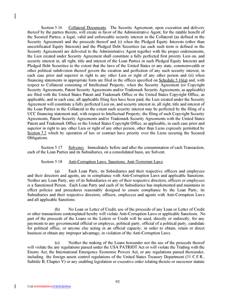 Section 5 . 16 Collateral Documents . The Security Agreement, upon execution and delivery thereof by the parties thereto, will create in favor of the Administrative Agent, for the ratable benefit of the Secured Parties, a legal, valid and enforceable security interest in the Collateral (as defined in the Security Agreement) and the proceeds thereof and (i) when the Pledged Equity Interests (other than uncertificated Equity Interests) and the Pledged Debt Securities (as each such term is defined in the Security Agreement) are delivered to the Administrative Agent together with the proper endorsements, the Lien created under Security Agreement shall constitute a fully perfected first priority Lien on, and security interest in, all right, title and interest of the Loan Parties in such Pledged Equity Interests and Pledged Debt Securities to the extent that the laws of the United States or any state, commonwealth or other political subdivision thereof govern the creation and perfection of any such security interest, in each case prior and superior in right to any other Lien or right of any other person and (ii) when financing statements in appropriate form are filed in the offices specified on Schedule 5 . 16 (a) and, with respect to Collateral consisting of Intellectual Property, when the Security Agreement (or Copyright Security Agreements, Patent Security Agreements and/or Trademark Security Agreements, as applicable) are filed with the United States Patent and Trademark Office or the United States Copyright Office, as applicable, and in each case, all applicable filing fees have been paid, the Lien created under the Security Agreement will constitute a fully perfected Lien on, and security interest in, all right, title and interest of the Loan Parties in the Collateral to the extent such security interest may be perfected by the filing of a UCC financing statement and, with respect to Intellectual Property, the filing of such Copyright Security Agreements, Patent Security Agreements and/or Trademark Security Agreements with the United States Patent and Trademark Office or the United States Copyright Office, as applicable, in each case prior and superior in right to any other Lien or right of any other person, other than Liens expressly permitted by Section 7 . 2 which by operation of law or contract have priority over the Liens securing the Secured Obligations . Section 5 . 17 Solvency . Immediately before and after the consummation of each Transaction, each of the Loan Parties and its Subsidiaries, on a consolidated basis, are Solvent . Section 5.18 Anti - Corruption Laws; Sanctions; Anti - Terrorism Laws . (a) Each Loan Party, its Subsidiaries and their respective officers and employees and their directors and agents, are in compliance with Anti - Corruption Laws and applicable Sanctions . Neither any Loan Party, any of its Subsidiaries or any of their respective directors, officers or employees is a Sanctioned Person . Each Loan Party and each of its Subsidiaries has implemented and maintains in effect policies and procedures reasonably designed to ensure compliance by the Loan Party, its Subsidiaries and their respective directors, officers, employees and agents with Anti - Corruption Laws and all applicable Sanctions . (b) No Loan or Letter of Credit, use of the proceeds of any Loan or Letter of Credit or other transactions contemplated hereby will violate Anti - Corruption Laws or applicable Sanctions . No part of the proceeds of the Loans or the Letters or Credit will be used, directly or indirectly, for any payments to any governmental official or employee, political party, official of a political party, candidate for political office, or anyone else acting in an official capacity, in order to obtain, retain or direct business or obtain any improper advantage, in violation of the Anti - Corruption Laws . (c) Neither the making of the Loans hereunder nor the use of the proceeds thereof will violate the any regulations passed under the USA PATRIOT Act or will violate the Trading with the Enemy Act, the International Emergency Economic Powers Act, or any regulations passed thereunder, including the foreign assets control regulations of the United States Treasury Department ( 31 C . F . R . , Subtitle B, Chapter V) or any enabling legislation or executive order relating thereto or successor statute 93 NAI - 1543452693v1 1543452693v6