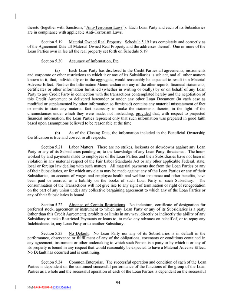 thereto (together with Sanctions, “ Anti - Terrorism Laws ”). Each Loan Party and each of its Subsidiaries are in compliance with applicable Anti - Terrorism Laws. Section 5 . 19 Material Owned Real Property . Schedule 5 . 19 lists completely and correctly as of the Agreement Date all Material Owned Real Property and the addresses thereof . One or more of the Loan Parties own in fee all the real property set forth on Schedule 5 . 19 . Section 5.20 Accuracy of Information, Etc . (a) Each Loan Party has disclosed to the Credit Parties all agreements, instruments and corporate or other restrictions to which it or any of its Subsidiaries is subject, and all other matters known to it, that, individually or in the aggregate, would reasonably be expected to result in a Material Adverse Effect . Neither the Information Memorandum nor any of the other reports, financial statements, certificates or other information furnished (whether in writing or orally) by or on behalf of any Loan Party to any Credit Party in connection with the transactions contemplated hereby and the negotiation of this Credit Agreement or delivered hereunder or under any other Loan Document (in each case as modified or supplemented by other information so furnished) contains any material misstatement of fact or omits to state any material fact necessary to make the statements therein, in the light of the circumstances under which they were made, not misleading, provided that, with respect to projected financial information, the Loan Parties represent only that such information was prepared in good faith based upon assumptions believed to be reasonable at the time . (b) As of the Closing Date, the information included in the Beneficial Ownership Certification is true and correct in all respects . Section 5 . 21 Labor Matters . There are no strikes, lockouts or slowdowns against any Loan Party or any of its Subsidiaries pending or, to the knowledge of any Loan Party, threatened . The hours worked by and payments made to employees of the Loan Parties and their Subsidiaries have not been in violation in any material respect of the Fair Labor Standards Act or any other applicable Federal, state, local or foreign law dealing with such matters . All material payments due from the Loan Parties or any of their Subsidiaries, or for which any claim may be made against any of the Loan Parties or any of their Subsidiaries, on account of wages and employee health and welfare insurance and other benefits, have been paid or accrued as a liability on the books of such Loan Party or such Subsidiary . The consummation of the Transactions will not give rise to any right of termination or right of renegotiation on the part of any union under any collective bargaining agreement to which any of the Loan Parties or any of their Subsidiaries is bound . Section 5 . 22 Absence of Certain Restrictions . No indenture, certificate of designation for preferred stock, agreement or instrument to which any Loan Party or any of its Subsidiaries is a party (other than this Credit Agreement), prohibits or limits in any way, directly or indirectly the ability of any Subsidiary to make Restricted Payments or loans to, to make any advance on behalf of, or to repay any Indebtedness to, any Loan Party or to another Subsidiary . Section 5 . 23 No Default . No Loan Party nor any of its Subsidiaries is in default in the performance, observance or fulfillment of any of the obligations, covenants or conditions contained in any agreement, instrument or other undertaking to which such Person is a party or by which it or any of its property is bound in any respect that would reasonably be expected to have a Material Adverse Effect . No Default has occurred and is continuing . Section 5 . 24 Common Enterprise . The successful operation and condition of each of the Loan Parties is dependent on the continued successful performance of the functions of the group of the Loan Parties as a whole and the successful operation of each of the Loan Parties is dependent on the successful 94 NAI - 1543452693v1 1543452693v6