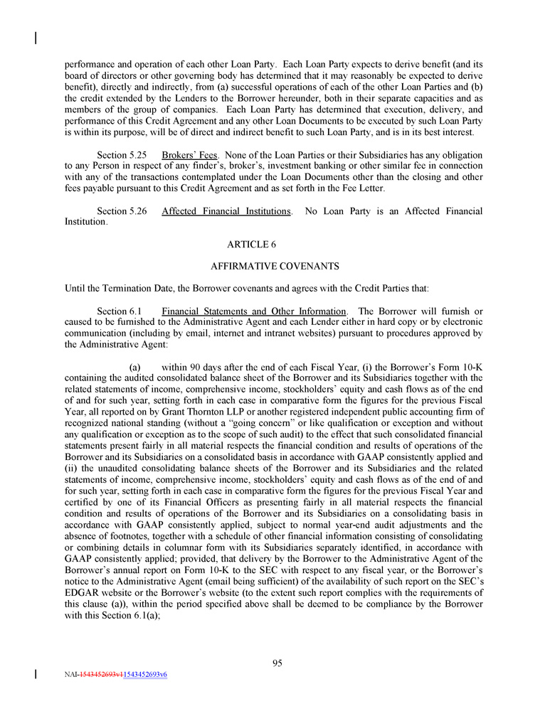 performance and operation of each other Loan Party . Each Loan Party expects to derive benefit (and its board of directors or other governing body has determined that it may reasonably be expected to derive benefit), directly and indirectly, from (a) successful operations of each of the other Loan Parties and (b) the credit extended by the Lenders to the Borrower hereunder, both in their separate capacities and as members of the group of companies . Each Loan Party has determined that execution, delivery, and performance of this Credit Agreement and any other Loan Documents to be executed by such Loan Party is within its purpose, will be of direct and indirect benefit to such Loan Party, and is in its best interest . Section 5 . 25 Brokers’ Fees . None of the Loan Parties or their Subsidiaries has any obligation to any Person in respect of any finder’s, broker’s, investment banking or other similar fee in connection with any of the transactions contemplated under the Loan Documents other than the closing and other fees payable pursuant to this Credit Agreement and as set forth in the Fee Letter . Section 5 . 26 Affected Financial Institutions . No Loan Party is an Affected Financial Institution . ARTICLE 6 AFFIRMATIVE COVENANTS Until the Termination Date, the Borrower covenants and agrees with the Credit Parties that : Section 6 . 1 Financial Statements and Other Information . The Borrower will furnish or caused to be furnished to the Administrative Agent and each Lender either in hard copy or by electronic communication (including by email, internet and intranet websites) pursuant to procedures approved by the Administrative Agent : (a) within 90 days after the end of each Fiscal Year, (i) the Borrower’s Form 10 - K containing the audited consolidated balance sheet of the Borrower and its Subsidiaries together with the related statements of income, comprehensive income, stockholders’ equity and cash flows as of the end of and for such year, setting forth in each case in comparative form the figures for the previous Fiscal Year, all reported on by Grant Thornton LLP or another registered independent public accounting firm of recognized national standing (without a “going concern” or like qualification or exception and without any qualification or exception as to the scope of such audit) to the effect that such consolidated financial statements present fairly in all material respects the financial condition and results of operations of the Borrower and its Subsidiaries on a consolidated basis in accordance with GAAP consistently applied and (ii) the unaudited consolidating balance sheets of the Borrower and its Subsidiaries and the related statements of income, comprehensive income, stockholders’ equity and cash flows as of the end of and for such year, setting forth in each case in comparative form the figures for the previous Fiscal Year and certified by one of its Financial Officers as presenting fairly in all material respects the financial condition and results of operations of the Borrower and its Subsidiaries on a consolidating basis in accordance with GAAP consistently applied, subject to normal year - end audit adjustments and the absence of footnotes, together with a schedule of other financial information consisting of consolidating or combining details in columnar form with its Subsidiaries separately identified, in accordance with GAAP consistently applied ; provided, that delivery by the Borrower to the Administrative Agent of the Borrower’s annual report on Form 10 - K to the SEC with respect to any fiscal year, or the Borrower’s notice to the Administrative Agent (email being sufficient) of the availability of such report on the SEC’s EDGAR website or the Borrower’s website (to the extent such report complies with the requirements of this clause (a)), within the period specified above shall be deemed to be compliance by the Borrower with this Section 6 . 1 (a) ; 95 NAI - 1543452693v1 1543452693v6