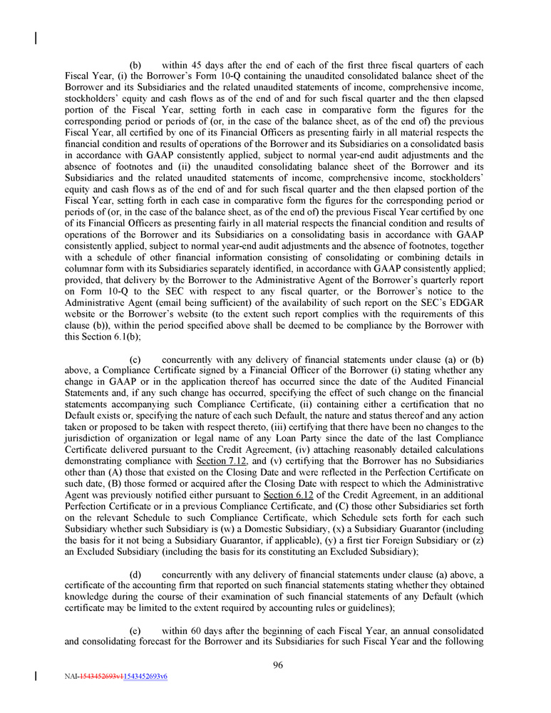 (b) within 45 days after the end of each of the first three fiscal quarters of each Fiscal Year, (i) the Borrower’s Form 10 - Q containing the unaudited consolidated balance sheet of the Borrower and its Subsidiaries and the related unaudited statements of income, comprehensive income, stockholders’ equity and cash flows as of the end of and for such fiscal quarter and the then elapsed portion of the Fiscal Year, setting forth in each case in comparative form the figures for the corresponding period or periods of (or, in the case of the balance sheet, as of the end of) the previous Fiscal Year, all certified by one of its Financial Officers as presenting fairly in all material respects the financial condition and results of operations of the Borrower and its Subsidiaries on a consolidated basis in accordance with GAAP consistently applied, subject to normal year - end audit adjustments and the absence of footnotes and (ii) the unaudited consolidating balance sheet of the Borrower and its Subsidiaries and the related unaudited statements of income, comprehensive income, stockholders’ equity and cash flows as of the end of and for such fiscal quarter and the then elapsed portion of the Fiscal Year, setting forth in each case in comparative form the figures for the corresponding period or periods of (or, in the case of the balance sheet, as of the end of) the previous Fiscal Year certified by one of its Financial Officers as presenting fairly in all material respects the financial condition and results of operations of the Borrower and its Subsidiaries on a consolidating basis in accordance with GAAP consistently applied, subject to normal year - end audit adjustments and the absence of footnotes, together with a schedule of other financial information consisting of consolidating or combining details in columnar form with its Subsidiaries separately identified, in accordance with GAAP consistently applied ; provided, that delivery by the Borrower to the Administrative Agent of the Borrower’s quarterly report on Form 10 - Q to the SEC with respect to any fiscal quarter, or the Borrower’s notice to the Administrative Agent (email being sufficient) of the availability of such report on the SEC’s EDGAR website or the Borrower’s website (to the extent such report complies with the requirements of this clause (b)), within the period specified above shall be deemed to be compliance by the Borrower with this Section 6 . 1 (b) ; (c) concurrently with any delivery of financial statements under clause (a) or (b) above, a Compliance Certificate signed by a Financial Officer of the Borrower (i) stating whether any change in GAAP or in the application thereof has occurred since the date of the Audited Financial Statements and, if any such change has occurred, specifying the effect of such change on the financial statements accompanying such Compliance Certificate, (ii) containing either a certification that no Default exists or, specifying the nature of each such Default, the nature and status thereof and any action taken or proposed to be taken with respect thereto, (iii) certifying that there have been no changes to the jurisdiction of organization or legal name of any Loan Party since the date of the last Compliance Certificate delivered pursuant to the Credit Agreement, (iv) attaching reasonably detailed calculations demonstrating compliance with Section 7 . 12 , and (v) certifying that the Borrower has no Subsidiaries other than (A) those that existed on the Closing Date and were reflected in the Perfection Certificate on such date, (B) those formed or acquired after the Closing Date with respect to which the Administrative Agent was previously notified either pursuant to Section 6 . 12 of the Credit Agreement, in an additional Perfection Certificate or in a previous Compliance Certificate, and (C) those other Subsidiaries set forth on the relevant Schedule to such Compliance Certificate, which Schedule sets forth for each such Subsidiary whether such Subsidiary is (w) a Domestic Subsidiary, (x) a Subsidiary Guarantor (including the basis for it not being a Subsidiary Guarantor, if applicable), (y) a first tier Foreign Subsidiary or (z) an Excluded Subsidiary (including the basis for its constituting an Excluded Subsidiary) ; (d) concurrently with any delivery of financial statements under clause (a) above, a certificate of the accounting firm that reported on such financial statements stating whether they obtained knowledge during the course of their examination of such financial statements of any Default (which certificate may be limited to the extent required by accounting rules or guidelines) ; (e) within 60 days after the beginning of each Fiscal Year, an annual consolidated and consolidating forecast for the Borrower and its Subsidiaries for such Fiscal Year and the following 96 NAI - 1543452693v1 1543452693v6