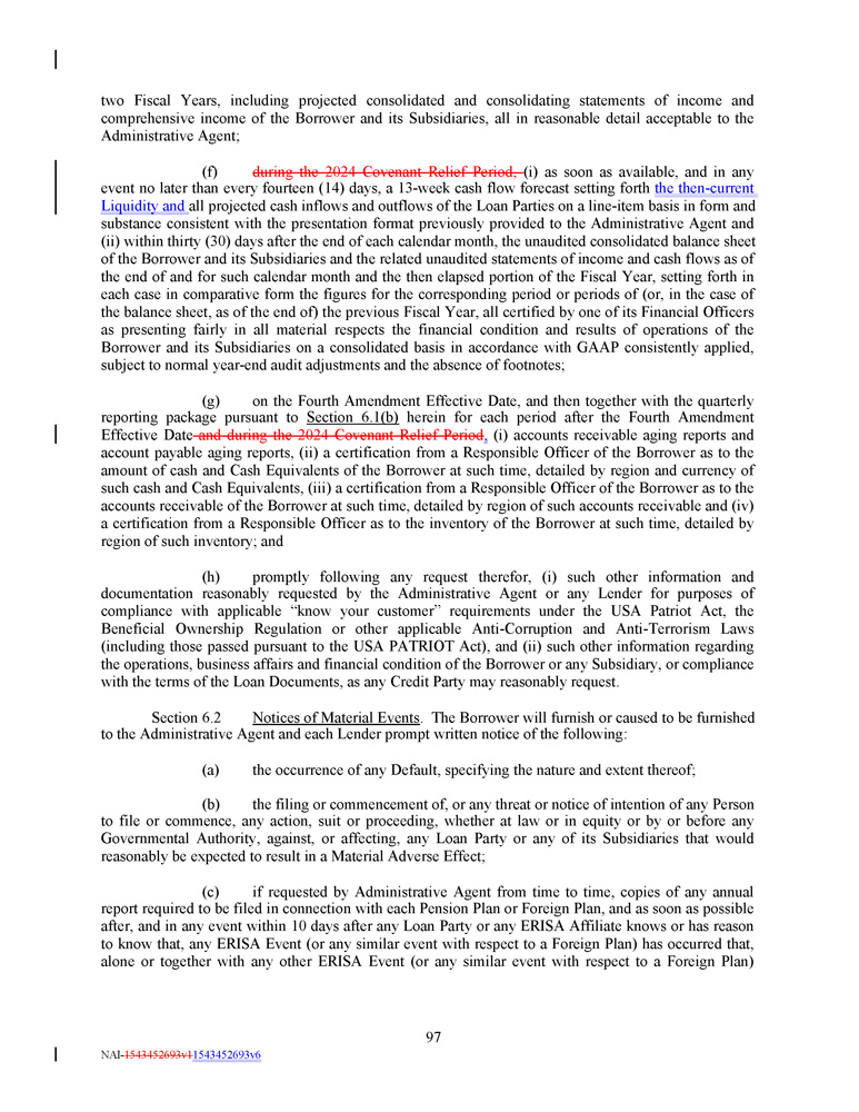 two Fiscal Years, including projected consolidated and consolidating statements of income and comprehensive income of the Borrower and its Subsidiaries, all in reasonable detail acceptable to the Administrative Agent ; (f) during the 2024 Covenant Relief Period, (i) as soon as available, and in any event no later than every fourteen ( 14 ) days, a 13 - week cash flow forecast setting forth the then - current Liquidity and all projected cash inflows and outflows of the Loan Parties on a line - item basis in form and substance consistent with the presentation format previously provided to the Administrative Agent and (ii) within thirty ( 30 ) days after the end of each calendar month, the unaudited consolidated balance sheet of the Borrower and its Subsidiaries and the related unaudited statements of income and cash flows as of the end of and for such calendar month and the then elapsed portion of the Fiscal Year, setting forth in each case in comparative form the figures for the corresponding period or periods of (or, in the case of the balance sheet, as of the end of) the previous Fiscal Year, all certified by one of its Financial Officers as presenting fairly in all material respects the financial condition and results of operations of the Borrower and its Subsidiaries on a consolidated basis in accordance with GAAP consistently applied, subject to normal year - end audit adjustments and the absence of footnotes ; (g) on the Fourth Amendment Effective Date, and then together with the quarterly reporting package pursuant to Section 6 . 1 (b) herein for each period after the Fourth Amendment Effective Date and during the 2024 Covenant Relief Period , (i) accounts receivable aging reports and account payable aging reports, (ii) a certification from a Responsible Officer of the Borrower as to the amount of cash and Cash Equivalents of the Borrower at such time, detailed by region and currency of such cash and Cash Equivalents, (iii) a certification from a Responsible Officer of the Borrower as to the accounts receivable of the Borrower at such time, detailed by region of such accounts receivable and (iv) a certification from a Responsible Officer as to the inventory of the Borrower at such time, detailed by region of such inventory ; and (h) promptly following any request therefor, (i) such other information and documentation reasonably requested by the Administrative Agent or any Lender for purposes of compliance with applicable “know your customer” requirements under the USA Patriot Act, the Beneficial Ownership Regulation or other applicable Anti - Corruption and Anti - Terrorism Laws (including those passed pursuant to the USA PATRIOT Act), and (ii) such other information regarding the operations, business affairs and financial condition of the Borrower or any Subsidiary, or compliance with the terms of the Loan Documents, as any Credit Party may reasonably request . Section 6.2 Notices of Material Events . The Borrower will furnish or caused to be furnished to the Administrative Agent and each Lender prompt written notice of the following: (a) the occurrence of any Default, specifying the nature and extent thereof; (b) the filing or commencement of, or any threat or notice of intention of any Person to file or commence, any action, suit or proceeding, whether at law or in equity or by or before any Governmental Authority, against, or affecting, any Loan Party or any of its Subsidiaries that would reasonably be expected to result in a Material Adverse Effect ; (c) if requested by Administrative Agent from time to time, copies of any annual report required to be filed in connection with each Pension Plan or Foreign Plan, and as soon as possible after, and in any event within 10 days after any Loan Party or any ERISA Affiliate knows or has reason to know that, any ERISA Event (or any similar event with respect to a Foreign Plan) has occurred that, alone or together with any other ERISA Event (or any similar event with respect to a Foreign Plan) 97 NAI - 1543452693v1 1543452693v6