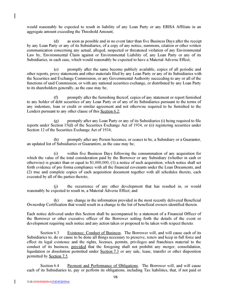 would reasonably be expected to result in liability of any Loan Party or any ERISA Affiliate in an aggregate amount exceeding the Threshold Amount ; (d) as soon as possible and in no event later than five Business Days after the receipt by any Loan Party or any of its Subsidiaries, of a copy of any notice, summons, citation or other written communication concerning any actual, alleged, suspected or threatened violation of any Environmental Law by, Environmental Claim against or Environmental Liability of, any Loan Party or any of its Subsidiaries, in each case, which would reasonably be expected to have a Material Adverse Effect ; (e) promptly after the same become publicly available, copies of all periodic and other reports, proxy statements and other materials filed by any Loan Party or any of its Subsidiaries with the Securities and Exchange Commission, or any Governmental Authority succeeding to any or all of the functions of said Commission, or with any national securities exchange, or distributed by any Loan Party to its shareholders generally, as the case may be ; (f) promptly after the furnishing thereof, copies of any statement or report furnished to any holder of debt securities of any Loan Party or of any of its Subsidiaries pursuant to the terms of any indenture, loan or credit or similar agreement and not otherwise required to be furnished to the Lenders pursuant to any other clause of this Section 6 . 2 ; (g) promptly after any Loan Party or any of its Subsidiaries (i) being required to file reports under Section 15 (d) of the Securities Exchange Act of 1934 , or (ii) registering securities under Section 12 of the Securities Exchange Act of 1934 ; (h) promptly after any Person becomes, or ceases to be, a Subsidiary or a Guarantor, an updated list of Subsidiaries or Guarantors, as the case may be; (i) within five Business Days following the consummation of any acquisition for which the value of the total consideration paid by the Borrower or any Subsidiary (whether in cash or otherwise) is greater than or equal to $ 1 , 000 , 000 , ( 1 ) a notice of such acquisition, which notice shall set forth evidence of pro forma compliance with all the financial covenants under the Loan Documents, and (2) true and complete copies of each acquisition document together with all schedules thereto, each executed by all of the parties thereto ; (j) the occurrence of any other development that has resulted in, or would reasonably be expected to result in, a Material Adverse Effect; and (k) any change in the information provided in the most recently delivered Beneficial Ownership Certification that would result in a change to the list of beneficial owners identified therein. Each notice delivered under this Section shall be accompanied by a statement of a Financial Officer of the Borrower or other executive officer of the Borrower setting forth the details of the event or development requiring such notice and any action taken or proposed to be taken with respect thereto . Section 6 . 3 Existence ; Conduct of Business . The Borrower will, and will cause each of its Subsidiaries to, do or cause to be done all things necessary to preserve, renew and keep in full force and effect its legal existence and the rights, licenses, permits, privileges and franchises material to the conduct of its business, provided that the foregoing shall not prohibit any merger, consolidation, liquidation or dissolution permitted under Section 7 . 3 or any sale, lease, transfer or other disposition permitted by Section 7 . 5 . Section 6 . 4 Payment and Performance of Obligations . The Borrower will, and will cause each of its Subsidiaries to, pay or perform its obligations, including Tax liabilities, that, if not paid or 98 NAI - 1543452693v1 1543452693v6