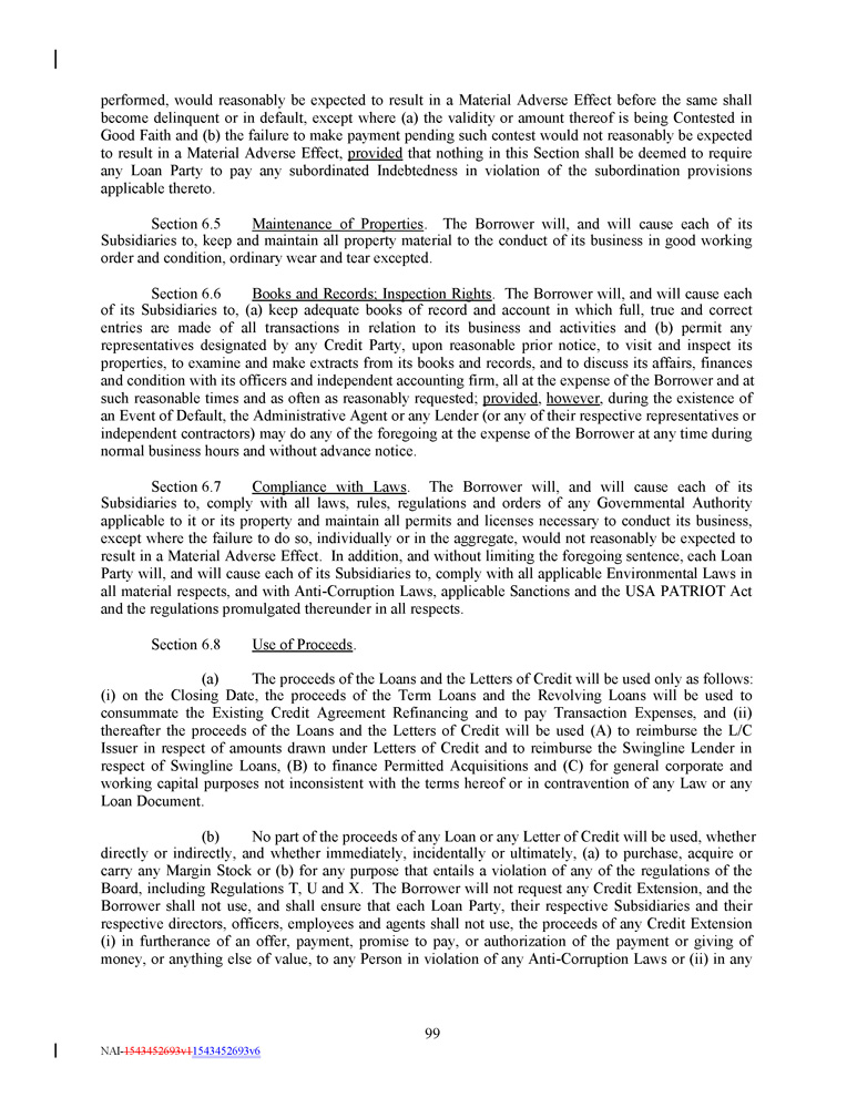 performed, would reasonably be expected to result in a Material Adverse Effect before the same shall become delinquent or in default, except where (a) the validity or amount thereof is being Contested in Good Faith and (b) the failure to make payment pending such contest would not reasonably be expected to result in a Material Adverse Effect, provided that nothing in this Section shall be deemed to require any Loan Party to pay any subordinated Indebtedness in violation of the subordination provisions applicable thereto . Section 6 . 5 Maintenance of Properties . The Borrower will, and will cause each of its Subsidiaries to, keep and maintain all property material to the conduct of its business in good working order and condition, ordinary wear and tear excepted . Section 6 . 6 Books and Records ; Inspection Rights . The Borrower will, and will cause each of its Subsidiaries to, (a) keep adequate books of record and account in which full, true and correct entries are made of all transactions in relation to its business and activities and (b) permit any representatives designated by any Credit Party, upon reasonable prior notice, to visit and inspect its properties, to examine and make extracts from its books and records, and to discuss its affairs, finances and condition with its officers and independent accounting firm, all at the expense of the Borrower and at such reasonable times and as often as reasonably requested ; provided , however , during the existence of an Event of Default, the Administrative Agent or any Lender (or any of their respective representatives or independent contractors) may do any of the foregoing at the expense of the Borrower at any time during normal business hours and without advance notice . Section 6 . 7 Compliance with Laws . The Borrower will, and will cause each of its Subsidiaries to, comply with all laws, rules, regulations and orders of any Governmental Authority applicable to it or its property and maintain all permits and licenses necessary to conduct its business, except where the failure to do so, individually or in the aggregate, would not reasonably be expected to result in a Material Adverse Effect . In addition, and without limiting the foregoing sentence, each Loan Party will, and will cause each of its Subsidiaries to, comply with all applicable Environmental Laws in all material respects, and with Anti - Corruption Laws, applicable Sanctions and the USA PATRIOT Act and the regulations promulgated thereunder in all respects . Section 6.8 Use of Proceeds . (a) The proceeds of the Loans and the Letters of Credit will be used only as follows : (i) on the Closing Date, the proceeds of the Term Loans and the Revolving Loans will be used to consummate the Existing Credit Agreement Refinancing and to pay Transaction Expenses, and (ii) thereafter the proceeds of the Loans and the Letters of Credit will be used (A) to reimburse the L/C Issuer in respect of amounts drawn under Letters of Credit and to reimburse the Swingline Lender in respect of Swingline Loans, (B) to finance Permitted Acquisitions and (C) for general corporate and working capital purposes not inconsistent with the terms hereof or in contravention of any Law or any Loan Document . (b) No part of the proceeds of any Loan or any Letter of Credit will be used, whether directly or indirectly, and whether immediately, incidentally or ultimately, (a) to purchase, acquire or carry any Margin Stock or (b) for any purpose that entails a violation of any of the regulations of the Board, including Regulations T, U and X . The Borrower will not request any Credit Extension, and the Borrower shall not use, and shall ensure that each Loan Party, their respective Subsidiaries and their respective directors, officers, employees and agents shall not use, the proceeds of any Credit Extension (i) in furtherance of an offer, payment, promise to pay, or authorization of the payment or giving of money, or anything else of value, to any Person in violation of any Anti - Corruption Laws or (ii) in any 99 NAI - 1543452693v1 1543452693v6