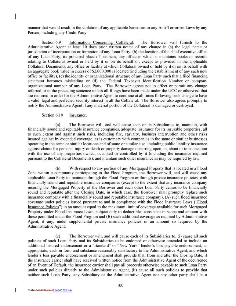 manner that would result in the violation of any applicable Sanctions or any Anti - Terrorism Laws by any Person, including any Credit Party. Section 6 . 9 Information Concerning Collateral . The Borrower will furnish to the Administrative Agent at least 10 days prior written notice of any change in (a) the legal name or jurisdiction of incorporation or formation of any Loan Party, (b) the location of the chief executive office of any Loan Party, its principal place of business, any office in which it maintains books or records relating to Collateral owned or held by it or on its behalf or, except as provided in the applicable Collateral Documents, any office or facility at which Collateral owned or held by it or on its behalf with an aggregate book value in excess of $ 2 , 000 , 000 is located (including the establishment of any such new office or facility), (c) the identity or organizational structure of any Loan Party such that a filed financing statement becomes misleading or (d) the Federal Taxpayer Identification Number or company organizational number of any Loan Party . The Borrower agrees not to effect or permit any change referred to in the preceding sentence unless all filings have been made under the UCC or otherwise that are required in order for the Administrative Agent to continue at all times following such change to have a valid, legal and perfected security interest in all the Collateral . The Borrower also agrees promptly to notify the Administrative Agent if any material portion of the Collateral is damaged or destroyed . Section 6.10 Insurance . (a) The Borrower will, and will cause each of its Subsidiaries to, maintain, with financially sound and reputable insurance companies, adequate insurance for its insurable properties, all to such extent and against such risks, including fire, casualty, business interruption and other risks insured against by extended coverage, as is customary with companies in the same or similar businesses operating in the same or similar locations and of same or similar size, including public liability insurance against claims for personal injury or death or property damage occurring upon, in, about or in connection with the use of any properties owned, occupied or controlled by it (including the insurance required pursuant to the Collateral Documents) ; and maintain such other insurance as may be required by law . (b) With respect to any portion of any Mortgaged Property that is located in a Flood Zone within a community participating in the Flood Program, the Borrower will, and will cause any applicable Loan Party to, maintain through the Flood Program or through private insurance policies, with financially sound and reputable insurance companies (except to the extent that any insurance company insuring the Mortgaged Property of the Borrower and each other Loan Party ceases to be financially sound and reputable after the Closing Date, in which case, the Borrower shall promptly replace such insurance company with a financially sound and reputable insurance company), (A) such flood insurance coverage under policies issued pursuant to and in compliance with the Flood Insurance Laws (“ Flood Insurance Policies ”) in an amount equal to the maximum limit of coverage available for such Mortgaged Property under Flood Insurance Laws, subject only to deductibles consistent in scope and amount with those permitted under the Flood Program and (B) such additional coverage as required by Administrative Agent, if any, under supplemental private insurance policies in an amount so required by the Administrative Agent . (c) The Borrower will, and will cause each of its Subsidiaries to, (i) cause all such policies of such Loan Party and its Subsidiaries to be endorsed or otherwise amended to include an additional insured endorsement or a “standard” or “New York” lender’s loss payable endorsement, as appropriate, each in form and substance reasonably satisfactory to the Administrative Agent, and which lender’s loss payable endorsement or amendment shall provide that, from and after the Closing Date, if the insurance carrier shall have received written notice from the Administrative Agent of the occurrence of an Event of Default, the insurance carrier shall pay all proceeds otherwise payable to such Loan Party under such policies directly to the Administrative Agent, (ii) cause all such policies to provide that neither such Loan Party, any Subsidiary or the Administrative Agent nor any other party shall be a 100 NAI - 1543452693v1 1543452693v6