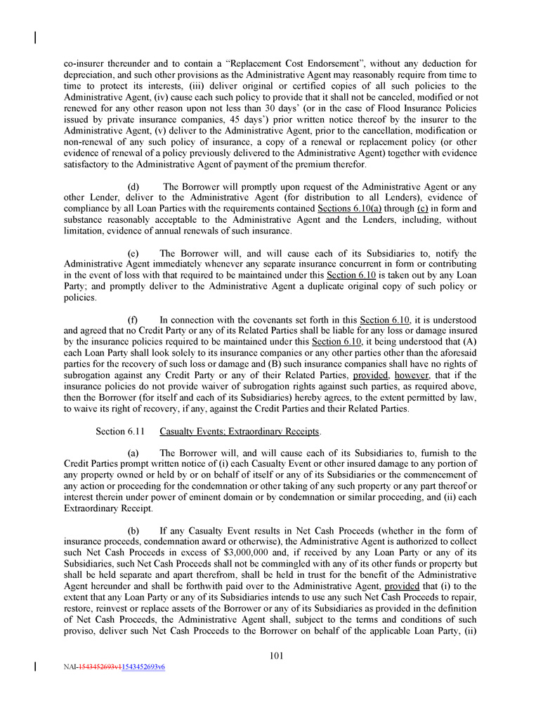 co - insurer thereunder and to contain a “Replacement Cost Endorsement”, without any deduction for depreciation, and such other provisions as the Administrative Agent may reasonably require from time to time to protect its interests, (iii) deliver original or certified copies of all such policies to the Administrative Agent, (iv) cause each such policy to provide that it shall not be canceled, modified or not renewed for any other reason upon not less than 30 days’ (or in the case of Flood Insurance Policies issued by private insurance companies, 45 days’) prior written notice thereof by the insurer to the Administrative Agent, (v) deliver to the Administrative Agent, prior to the cancellation, modification or non - renewal of any such policy of insurance, a copy of a renewal or replacement policy (or other evidence of renewal of a policy previously delivered to the Administrative Agent) together with evidence satisfactory to the Administrative Agent of payment of the premium therefor . (d) The Borrower will promptly upon request of the Administrative Agent or any other Lender, deliver to the Administrative Agent (for distribution to all Lenders), evidence of compliance by all Loan Parties with the requirements contained Sections 6 . 10 (a) through (c) in form and substance reasonably acceptable to the Administrative Agent and the Lenders, including, without limitation, evidence of annual renewals of such insurance . (e) The Borrower will, and will cause each of its Subsidiaries to, notify the Administrative Agent immediately whenever any separate insurance concurrent in form or contributing in the event of loss with that required to be maintained under this Section 6 . 10 is taken out by any Loan Party ; and promptly deliver to the Administrative Agent a duplicate original copy of such policy or policies . (f) In connection with the covenants set forth in this Section 6 . 10 , it is understood and agreed that no Credit Party or any of its Related Parties shall be liable for any loss or damage insured by the insurance policies required to be maintained under this Section 6 . 10 , it being understood that (A) each Loan Party shall look solely to its insurance companies or any other parties other than the aforesaid parties for the recovery of such loss or damage and (B) such insurance companies shall have no rights of subrogation against any Credit Party or any of their Related Parties, provided , however , that if the insurance policies do not provide waiver of subrogation rights against such parties, as required above, then the Borrower (for itself and each of its Subsidiaries) hereby agrees, to the extent permitted by law, to waive its right of recovery, if any, against the Credit Parties and their Related Parties . Section 6.11 Casualty Events; Extraordinary Receipts . (a) The Borrower will, and will cause each of its Subsidiaries to, furnish to the Credit Parties prompt written notice of (i) each Casualty Event or other insured damage to any portion of any property owned or held by or on behalf of itself or any of its Subsidiaries or the commencement of any action or proceeding for the condemnation or other taking of any such property or any part thereof or interest therein under power of eminent domain or by condemnation or similar proceeding, and (ii) each Extraordinary Receipt . (b) If any Casualty Event results in Net Cash Proceeds (whether in the form of insurance proceeds, condemnation award or otherwise), the Administrative Agent is authorized to collect such Net Cash Proceeds in excess of $ 3 , 000 , 000 and, if received by any Loan Party or any of its Subsidiaries, such Net Cash Proceeds shall not be commingled with any of its other funds or property but shall be held separate and apart therefrom, shall be held in trust for the benefit of the Administrative Agent hereunder and shall be forthwith paid over to the Administrative Agent, provided that (i) to the extent that any Loan Party or any of its Subsidiaries intends to use any such Net Cash Proceeds to repair, restore, reinvest or replace assets of the Borrower or any of its Subsidiaries as provided in the definition of Net Cash Proceeds, the Administrative Agent shall, subject to the terms and conditions of such proviso, deliver such Net Cash Proceeds to the Borrower on behalf of the applicable Loan Party, (ii) 101 NAI - 1543452693v1 1543452693v6