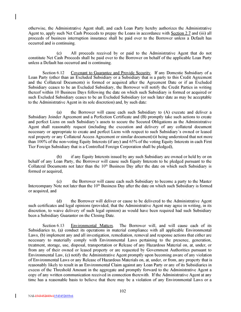 otherwise, the Administrative Agent shall, and each Loan Party hereby authorizes the Administrative Agent to, apply such Net Cash Proceeds to prepay the Loans in accordance with Section 2 . 7 and (iii) all proceeds of business interruption insurance shall be paid over to the Borrower unless a Default has occurred and is continuing . (c) All proceeds received by or paid to the Administrative Agent that do not constitute Net Cash Proceeds shall be paid over to the Borrower on behalf of the applicable Loan Party unless a Default has occurred and is continuing . Section 6 . 12 Covenant to Guarantee and Provide Security . If any Domestic Subsidiary of a Loan Party (other than an Excluded Subsidiary or a Subsidiary that is a party to this Credit Agreement and the Collateral Documents) is formed or acquired after the Agreement Date or if an Excluded Subsidiary ceases to be an Excluded Subsidiary, the Borrower will notify the Credit Parties in writing thereof within 10 Business Days following the date on which such Subsidiary is formed or acquired or such Excluded Subsidiary ceases to be an Excluded Subsidiary (or such later date as may be acceptable to the Administrative Agent in its sole discretion) and, by such date : (a) the Borrower will cause each such Subsidiary to (A) execute and deliver a Subsidiary Joinder Agreement and a Perfection Certificate and (B) promptly take such actions to create and perfect Liens on such Subsidiary’s assets to secure the Secured Obligations as the Administrative Agent shall reasonably request (including the execution and delivery of any collateral document necessary or appropriate to create and perfect Liens with respect to such Subsidiary’s owned or leased real property or any Collateral Access Agreement or similar document) (it being understood that not more than 100 % of the non - voting Equity Interests (if any) and 65 % of the voting Equity Interests in each First Tier Foreign Subsidiary that is a Controlled Foreign Corporation shall be pledged), (b) if any Equity Interests issued by any such Subsidiary are owned or held by or on behalf of any Loan Party, the Borrower will cause such Equity Interests to be pledged pursuant to the Collateral Documents not later than the 10 th Business Day after the date on which such Subsidiary is formed or acquired, (c) the Borrower will cause each such Subsidiary to become a party to the Master Intercompany Note not later than the 10 th Business Day after the date on which such Subsidiary is formed or acquired, and (d) the Borrower will deliver or cause to be delivered to the Administrative Agent such certificates and legal opinions (provided, that the Administrative Agent may agree in writing, in its discretion, to waive delivery of such legal opinion) as would have been required had such Subsidiary been a Subsidiary Guarantor on the Closing Date . Section 6 . 13 Environmental Matters . The Borrower will, and will cause each of its Subsidiaries to, (a) conduct its operations in material compliance with all applicable Environmental Laws, (b) implement any and all investigation, remediation, removal and response actions that either are necessary to materially comply with Environmental Laws pertaining to the presence, generation, treatment, storage, use, disposal, transportation or Release of any Hazardous Material on, at, under, or from any of their owned or leased property or are requested by Government Authorities pursuant to Environmental Law, (c) notify the Administrative Agent promptly upon becoming aware of any violation of Environmental Laws or any Release of Hazardous Materials on, at, under, or from, any property that is reasonably likely to result in an Environmental Claim against any Loan Party or any of its Subsidiaries in excess of the Threshold Amount in the aggregate and promptly forward to the Administrative Agent a copy of any written communication received in connection therewith . If the Administrative Agent at any time has a reasonable basis to believe that there may be a violation of any Environmental Laws or a 102 NAI - 1543452693v1 1543452693v6