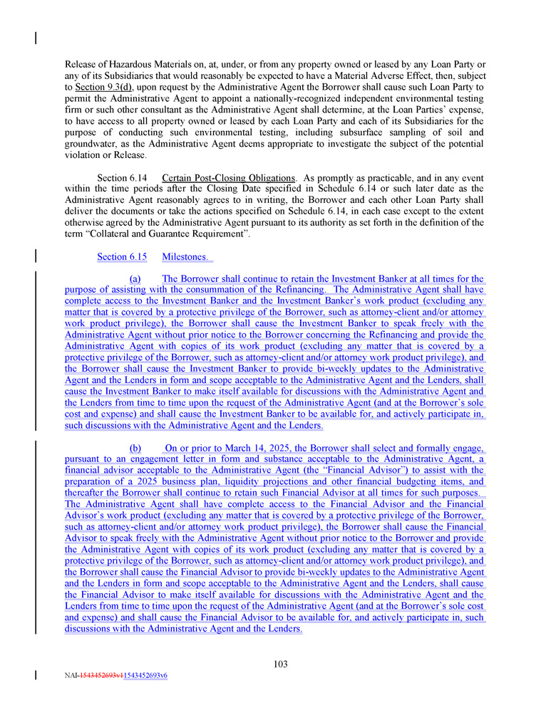 Release of Hazardous Materials on, at, under, or from any property owned or leased by any Loan Party or any of its Subsidiaries that would reasonably be expected to have a Material Adverse Effect, then, subject to Section 9 . 3 (d) , upon request by the Administrative Agent the Borrower shall cause such Loan Party to permit the Administrative Agent to appoint a nationally - recognized independent environmental testing firm or such other consultant as the Administrative Agent shall determine, at the Loan Parties’ expense, to have access to all property owned or leased by each Loan Party and each of its Subsidiaries for the purpose of conducting such environmental testing, including subsurface sampling of soil and groundwater, as the Administrative Agent deems appropriate to investigate the subject of the potential violation or Release . Section 6 . 14 Certain Post - Closing Obligations . As promptly as practicable, and in any event within the time periods after the Closing Date specified in Schedule 6 . 14 or such later date as the Administrative Agent reasonably agrees to in writing, the Borrower and each other Loan Party shall deliver the documents or take the actions specified on Schedule 6 . 14 , in each case except to the extent otherwise agreed by the Administrative Agent pursuant to its authority as set forth in the definition of the term “Collateral and Guarantee Requirement” . Section 6.15 Milestones. (a) The Borrower shall continue to retain the Investment Banker at all times for the purpose of assisting with the consummation of the Refinancing . The Administrative Agent shall have complete access to the Investment Banker and the Investment Banker’s work product (excluding any matter that is covered by a protective privilege of the Borrower, such as attorney - client and/or attorney work product privilege), the Borrower shall cause the Investment Banker to speak freely with the Administrative Agent without prior notice to the Borrower concerning the Refinancing and provide the Administrative Agent with copies of its work product (excluding any matter that is covered by a protective privilege of the Borrower, such as attorney - client and/or attorney work product privilege), and the Borrower shall cause the Investment Banker to provide bi - weekly updates to the Administrative Agent and the Lenders in form and scope acceptable to the Administrative Agent and the Lenders, shall cause the Investment Banker to make itself available for discussions with the Administrative Agent and the Lenders from time to time upon the request of the Administrative Agent (and at the Borrower’s sole cost and expense) and shall cause the Investment Banker to be available for, and actively participate in, such discussions with the Administrative Agent and the Lenders . (b) On or prior to March 14 , 2025 , the Borrower shall select and formally engage, pursuant to an engagement letter in form and substance acceptable to the Administrative Agent, a financial advisor acceptable to the Administrative Agent (the “Financial Advisor”) to assist with the preparation of a 2025 business plan, liquidity projections and other financial budgeting items, and thereafter the Borrower shall continue to retain such Financial Advisor at all times for such purposes . The Administrative Agent shall have complete access to the Financial Advisor and the Financial Advisor’s work product (excluding any matter that is covered by a protective privilege of the Borrower, such as attorney - client and/or attorney work product privilege), the Borrower shall cause the Financial Advisor to speak freely with the Administrative Agent without prior notice to the Borrower and provide the Administrative Agent with copies of its work product (excluding any matter that is covered by a protective privilege of the Borrower, such as attorney - client and/or attorney work product privilege), and the Borrower shall cause the Financial Advisor to provide bi - weekly updates to the Administrative Agent and the Lenders in form and scope acceptable to the Administrative Agent and the Lenders, shall cause the Financial Advisor to make itself available for discussions with the Administrative Agent and the Lenders from time to time upon the request of the Administrative Agent (and at the Borrower’s sole cost and expense) and shall cause the Financial Advisor to be available for, and actively participate in, such discussions with the Administrative Agent and the Lenders . 103 NAI - 1543452693v1 1543452693v6