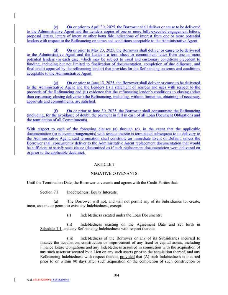 (c) On or prior to April 30 , 2025 , the Borrower shall deliver or cause to be delivered to the Administrative Agent and the Lenders copies of one or more fully - executed engagement letters, proposal letters, letters of intent or other bona fide indications of interest from one or more potential lenders with respect to the Refinancing on terms and conditions acceptable to the Administrative Agent . (d) On or prior to May 23 , 2025 , the Borrower shall deliver or cause to be delivered to the Administrative Agent and the Lenders a term sheet or commitment letter from one or more potential lenders (in each case, which may be subject to usual and customary conditions precedent to funding, including but not limited to finalization of documentation, completion of due diligence, and final credit approval by the refinancing lender) that provides for the Refinancing on terms and conditions acceptable to the Administrative Agent . (e) On or prior to June 13 , 2025 , the Borrower shall deliver or cause to be delivered to the Administrative Agent and the Lenders (i) a statement of sources and uses with respect to the proceeds of the Refinancing and (ii) evidence that the refinancing lender’s conditions to closing (other than customary closing deliveries) the Refinancing, including, without limitation, obtaining of necessary approvals and commitments, are satisfied . (f) On or prior to June 30 , 2025 , the Borrower shall consummate the Refinancing (including, for the avoidance of doubt, the payment in full in cash of all Loan Document Obligations and the termination of all Commitments) . With respect to each of the foregoing clauses (a) through (e), in the event that the applicable documentation (or relevant arrangements) with respect thereto is terminated subsequent to its delivery to the Administrative Agent, said termination shall constitute an immediate Event of Default, unless the Borrower shall concurrently deliver to the Administrative Agent replacement documentation that would be sufficient to satisfy such clause (determined as if such replacement documentation were delivered on or prior to the applicable deadline) . ARTICLE 7 NEGATIVE COVENANTS Until the Termination Date, the Borrower covenants and agrees with the Credit Parties that: Section 7.1 Indebtedness; Equity Interests . (a) The Borrower will not, and will not permit any of its Subsidiaries to, create, incur, assume or permit to exist any Indebtedness, except : (i) Indebtedness created under the Loan Documents; (ii) Indebtedness existing on the Agreement Date and set forth in Schedule 7 . 1 , and any Refinancing Indebtedness with respect thereto ; (iii) Indebtedness of the Borrower or any of its Subsidiaries incurred to finance the acquisition, construction or improvement of any fixed or capital assets, including Finance Lease Obligations and any Indebtedness assumed in connection with the acquisition of any such assets or secured by a Lien on any such assets prior to the acquisition thereof, and any Refinancing Indebtedness with respect thereto, provided that (A) such Indebtedness is incurred prior to or within 90 days after such acquisition or the completion of such construction or 104 NAI - 1543452693v1 1543452693v6