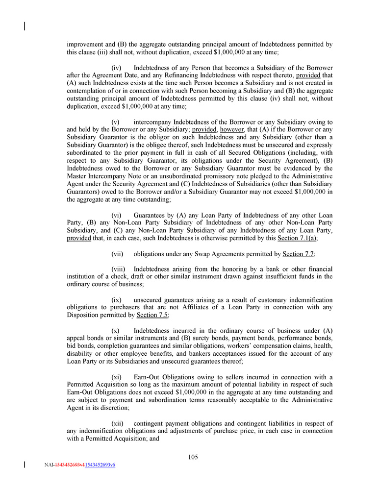 improvement and (B) the aggregate outstanding principal amount of Indebtedness permitted by this clause (iii) shall not, without duplication, exceed $1,000,000 at any time; (iv) Indebtedness of any Person that becomes a Subsidiary of the Borrower after the Agreement Date, and any Refinancing Indebtedness with respect thereto, provided that (A) such Indebtedness exists at the time such Person becomes a Subsidiary and is not created in contemplation of or in connection with such Person becoming a Subsidiary and (B) the aggregate outstanding principal amount of Indebtedness permitted by this clause (iv) shall not, without duplication, exceed $ 1 , 000 , 000 at any time ; (v) intercompany Indebtedness of the Borrower or any Subsidiary owing to and held by the Borrower or any Subsidiary ; provided , however , that (A) if the Borrower or any Subsidiary Guarantor is the obligor on such Indebtedness and any Subsidiary (other than a Subsidiary Guarantor) is the obligee thereof, such Indebtedness must be unsecured and expressly subordinated to the prior payment in full in cash of all Secured Obligations (including, with respect to any Subsidiary Guarantor, its obligations under the Security Agreement), (B) Indebtedness owed to the Borrower or any Subsidiary Guarantor must be evidenced by the Master Intercompany Note or an unsubordinated promissory note pledged to the Administrative Agent under the Security Agreement and (C) Indebtedness of Subsidiaries (other than Subsidiary Guarantors) owed to the Borrower and/or a Subsidiary Guarantor may not exceed $ 1 , 000 , 000 in the aggregate at any time outstanding ; (vi) Guarantees by (A) any Loan Party of Indebtedness of any other Loan Party, (B) any Non - Loan Party Subsidiary of Indebtedness of any other Non - Loan Party Subsidiary, and (C) any Non - Loan Party Subsidiary of any Indebtedness of any Loan Party, provided that, in each case, such Indebtedness is otherwise permitted by this Section 7 . 1 (a) ; (vii) obligations under any Swap Agreements permitted by Section 7.7 ; (viii) Indebtedness arising from the honoring by a bank or other financial institution of a check, draft or other similar instrument drawn against insufficient funds in the ordinary course of business ; (ix) unsecured guarantees arising as a result of customary indemnification obligations to purchasers that are not Affiliates of a Loan Party in connection with any Disposition permitted by Section 7 . 5 ; (x) Indebtedness incurred in the ordinary course of business under (A) appeal bonds or similar instruments and (B) surety bonds, payment bonds, performance bonds, bid bonds, completion guarantees and similar obligations, workers’ compensation claims, health, disability or other employee benefits, and bankers acceptances issued for the account of any Loan Party or its Subsidiaries and unsecured guarantees thereof ; (xi) Earn - Out Obligations owing to sellers incurred in connection with a Permitted Acquisition so long as the maximum amount of potential liability in respect of such Earn - Out Obligations does not exceed $ 1 , 000 , 000 in the aggregate at any time outstanding and are subject to payment and subordination terms reasonably acceptable to the Administrative Agent in its discretion ; (xii) contingent payment obligations and contingent liabilities in respect of any indemnification obligations and adjustments of purchase price, in each case in connection with a Permitted Acquisition ; and 105 NAI - 1543452693v1 1543452693v6