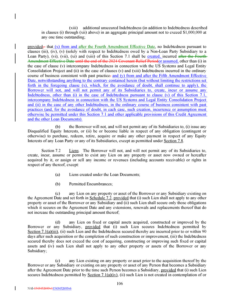 (xiii) additional unsecured Indebtedness (in addition to Indebtedness described in clauses (i) through (xii) above) in an aggregate principal amount not to exceed $ 1 , 000 , 000 at any one time outstanding ; provided , that (x) from and after the Fourth Amendment Effective Date , no Indebtedness pursuant to clauses (iii), (iv), (v) (solely with respect to Indebtedness owed by a Non - Loan Party Subsidiary to a Loan Party), (vi), (vii), (xi) and (xiii) of this Section 7 . 1 shall be created, incurred after the Fourth Amendment Effective Date until the end of the 2024 Covenant Relief Period or assumed, other than (i) in the case of clause (v) intercompany Indebtedness in connection with the US Systems and Legal Entity Consolidation Project and (ii) in the case of clauses (v) and (xiii) Indebtedness incurred in the ordinary course of business consistent with past practice . and (y) from and after the Fifth Amendment Effective Date, notwithstanding anything to the contrary contained herein (but without limiting the restrictions set forth in the foregoing clause (x), which, for the avoidance of doubt, shall continue to apply), the Borrower will not, and will not permit any of its Subsidiaries to, create, incur or assume any Indebtedness, other than (i) in the case of Indebtedness pursuant to clause (v) of this Section 7 . 1 , intercompany Indebtedness in connection with the US Systems and Legal Entity Consolidation Project and (ii) in the case of any other Indebtedness, in the ordinary course of business consistent with past practices (and, for the avoidance of doubt, in each case, such creation, incurrence or assumption must otherwise be permitted under this Section 7 . 1 and other applicable provisions of this Credit Agreement and the other Loan Documents) . (b) the Borrower will not, and will not permit any of its Subsidiaries to, (i) issue any Disqualified Equity Interests, or (ii) be or become liable in respect of any obligation (contingent or otherwise) to purchase, redeem, retire, acquire or make any other payment in respect of any Equity Interests of any Loan Party or any of its Subsidiaries, except as permitted under Section 7 . 8 . Section 7 . 2 Liens . The Borrower will not, and will not permit any of its Subsidiaries to, create, incur, assume or permit to exist any Lien on any property or asset now owned or hereafter acquired by it, or assign or sell any income or revenues (including accounts receivable) or rights in respect of any thereof, except : (a) Liens created under the Loan Documents; (b) Permitted Encumbrances; (c) any Lien on any property or asset of the Borrower or any Subsidiary existing on the Agreement Date and set forth in Schedule 7 . 2 , provided that (i) such Lien shall not apply to any other property or asset of the Borrower or any Subsidiary and (ii) such Lien shall secure only those obligations which it secures on the Agreement Date and any extensions, renewals and replacements thereof that do not increase the outstanding principal amount thereof ; (d) any Lien on fixed or capital assets acquired, constructed or improved by the Borrower or any Subsidiary, provided that (i) such Lien secures Indebtedness permitted by Section 7 . 1 (a)(iii) , (ii) such Lien and the Indebtedness secured thereby are incurred prior to or within 90 days after such acquisition or the completion of such construction or improvement, (iii) the Indebtedness secured thereby does not exceed the cost of acquiring, constructing or improving such fixed or capital assets and (iv) such Lien shall not apply to any other property or assets of the Borrower or any Subsidiary ; (e) any Lien existing on any property or asset prior to the acquisition thereof by the Borrower or any Subsidiary or existing on any property or asset of any Person that becomes a Subsidiary after the Agreement Date prior to the time such Person becomes a Subsidiary, provided that (i) such Lien secures Indebtedness permitted by Section 7 . 1 (a)(iv) , (ii) such Lien is not created in contemplation of or 106 NAI - 1543452693v1 1543452693v6