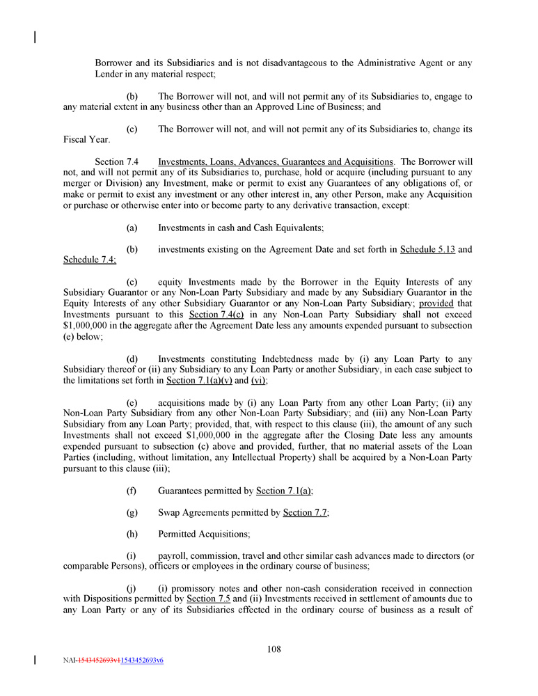 Borrower and its Subsidiaries and is not disadvantageous to the Administrative Agent or any Lender in any material respect; (b) The Borrower will not, and will not permit any of its Subsidiaries to, engage to any material extent in any business other than an Approved Line of Business ; and (c) The Borrower will not, and will not permit any of its Subsidiaries to, change its Fiscal Year. Section 7 . 4 Investments, Loans, Advances, Guarantees and Acquisitions . The Borrower will not, and will not permit any of its Subsidiaries to, purchase, hold or acquire (including pursuant to any merger or Division) any Investment, make or permit to exist any Guarantees of any obligations of, or make or permit to exist any investment or any other interest in, any other Person, make any Acquisition or purchase or otherwise enter into or become party to any derivative transaction, except : (a) Investments in cash and Cash Equivalents; (b) investments existing on the Agreement Date and set forth in Schedule 5.13 and Schedule 7.4; (c) equity Investments made by the Borrower in the Equity Interests of any Subsidiary Guarantor or any Non - Loan Party Subsidiary and made by any Subsidiary Guarantor in the Equity Interests of any other Subsidiary Guarantor or any Non - Loan Party Subsidiary ; provided that Investments pursuant to this Section 7 . 4 (c) in any Non - Loan Party Subsidiary shall not exceed $ 1 , 000 , 000 in the aggregate after the Agreement Date less any amounts expended pursuant to subsection (e) below ; (d) Investments constituting Indebtedness made by (i) any Loan Party to any Subsidiary thereof or (ii) any Subsidiary to any Loan Party or another Subsidiary, in each case subject to the limitations set forth in Section 7 . 1 (a)(v) and (vi) ; (e) acquisitions made by (i) any Loan Party from any other Loan Party ; (ii) any Non - Loan Party Subsidiary from any other Non - Loan Party Subsidiary ; and (iii) any Non - Loan Party Subsidiary from any Loan Party ; provided, that, with respect to this clause (iii), the amount of any such Investments shall not exceed $ 1 , 000 , 000 in the aggregate after the Closing Date less any amounts expended pursuant to subsection (c) above and provided, further, that no material assets of the Loan Parties (including, without limitation, any Intellectual Property) shall be acquired by a Non - Loan Party pursuant to this clause (iii) ; (f) Guarantees permitted by Section 7.1(a) ; (g) Swap Agreements permitted by Section 7.7 ; (h) Permitted Acquisitions; (i) payroll, commission, travel and other similar cash advances made to directors (or comparable Persons), officers or employees in the ordinary course of business ; (j) (i) promissory notes and other non - cash consideration received in connection with Dispositions permitted by Section 7 . 5 and (ii) Investments received in settlement of amounts due to any Loan Party or any of its Subsidiaries effected in the ordinary course of business as a result of 108 NAI - 1543452693v1 1543452693v6