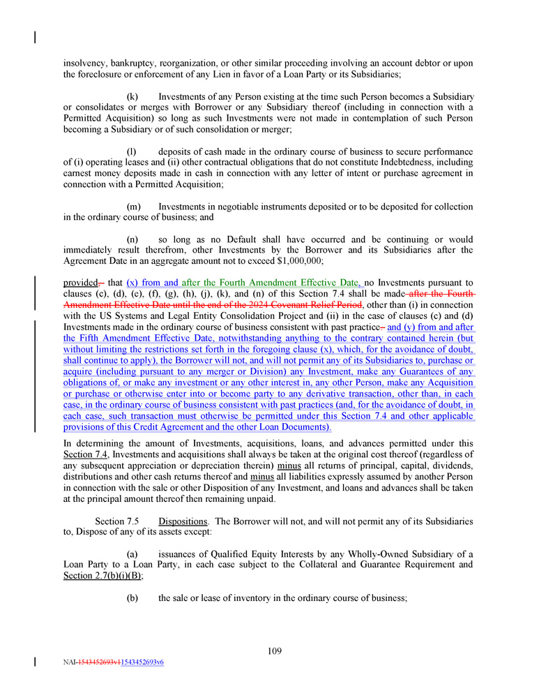 insolvency, bankruptcy, reorganization, or other similar proceeding involving an account debtor or upon the foreclosure or enforcement of any Lien in favor of a Loan Party or its Subsidiaries ; (k) Investments of any Person existing at the time such Person becomes a Subsidiary or consolidates or merges with Borrower or any Subsidiary thereof (including in connection with a Permitted Acquisition) so long as such Investments were not made in contemplation of such Person becoming a Subsidiary or of such consolidation or merger ; (l) deposits of cash made in the ordinary course of business to secure performance of (i) operating leases and (ii) other contractual obligations that do not constitute Indebtedness, including earnest money deposits made in cash in connection with any letter of intent or purchase agreement in connection with a Permitted Acquisition ; (m) Investments in negotiable instruments deposited or to be deposited for collection in the ordinary course of business ; and (n) so long as no Default shall have occurred and be continuing or would immediately result therefrom, other Investments by the Borrower and its Subsidiaries after the Agreement Date in an aggregate amount not to exceed $ 1 , 000 , 000 ; provided , that (x) from and after the Fourth Amendment Effective Date , no Investments pursuant to clauses (c), (d), (e), (f), (g), (h), (j), (k), and (n) of this Section 7 . 4 shall be made after the Fourth Amendment Effective Date until the end of the 2024 Covenant Relief Period , other than (i) in connection with the US Systems and Legal Entity Consolidation Project and (ii) in the case of clauses (c) and (d) Investments made in the ordinary course of business consistent with past practice . and (y) from and after the Fifth Amendment Effective Date, notwithstanding anything to the contrary contained herein (but without limiting the restrictions set forth in the foregoing clause (x), which, for the avoidance of doubt, shall continue to apply), the Borrower will not, and will not permit any of its Subsidiaries to, purchase or acquire (including pursuant to any merger or Division) any Investment, make any Guarantees of any obligations of, or make any investment or any other interest in, any other Person, make any Acquisition or purchase or otherwise enter into or become party to any derivative transaction, other than, in each case, in the ordinary course of business consistent with past practices (and, for the avoidance of doubt, in each case, such transaction must otherwise be permitted under this Section 7.4 and other applicable provisions of this Credit Agreement and the other Loan Documents) . In determining the amount of Investments, acquisitions, loans, and advances permitted under this Section 7 . 4 , Investments and acquisitions shall always be taken at the original cost thereof (regardless of any subsequent appreciation or depreciation therein) minus all returns of principal, capital, dividends, distributions and other cash returns thereof and minus all liabilities expressly assumed by another Person in connection with the sale or other Disposition of any Investment, and loans and advances shall be taken at the principal amount thereof then remaining unpaid . 109 NAI - 1543452693v1 1543452693v6 Section 7.5 Dispositions . The Borrower will not, and will not permit any of its Subsidiaries to, Dispose of any of its assets except: (a) issuances of Qualified Equity Interests by any Wholly - Owned Subsidiary of a Loan Party to a Loan Party, in each case subject to the Collateral and Guarantee Requirement and Section 2 . 7 (b)(i)(B) ; (b) the sale or lease of inventory in the ordinary course of business;