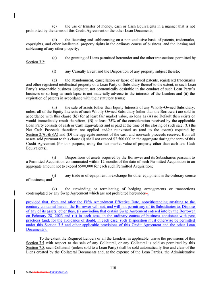 (c) the use or transfer of money, cash or Cash Equivalents in a manner that is not prohibited by the terms of this Credit Agreement or the other Loan Documents ; (d) the licensing and sublicensing on a non - exclusive basis of patents, trademarks, copyrights, and other intellectual property rights in the ordinary course of business, and the leasing and subleasing of any other property ; (e) the granting of Liens permitted hereunder and the other transactions permitted by Section 7.2 ; (f) any Casualty Event and the Disposition of any property subject thereto; (g) the abandonment, cancellation or lapse of issued patents, registered trademarks and other registered intellectual property of a Loan Party or Subsidiary thereof to the extent, in such Loan Party’s reasonable business judgment, not economically desirable in the conduct of such Loan Party’s business or so long as such lapse is not materially adverse to the interests of the Lenders and (ii) the expiration of patents in accordance with their statutory terms ; (h) the sale of assets (other than Equity Interests of any Wholly - Owned Subsidiary, unless all of the Equity Interests of such Wholly - Owned Subsidiary (other than the Borrower) are sold in accordance with this clause (h)) for at least fair market value, so long as (A) no Default then exists or would immediately result therefrom, (B) at least 75 % of the consideration received by the applicable Loan Party consists of cash or Cash Equivalents and is paid at the time of the closing of such sale, (C) the Net Cash Proceeds therefrom are applied and/or reinvested as (and to the extent) required by Section 2 . 7 (b)(i)(A) and (D) the aggregate amount of the cash and non - cash proceeds received from all assets sold pursuant to this clause (i) shall not exceed $ 2 , 500 , 000 in the aggregate during the term of this Credit Agreement (for this purpose, using the fair market value of property other than cash and Cash Equivalents) ; (i) Dispositions of assets acquired by the Borrower and its Subsidiaries pursuant to a Permitted Acquisition consummated within 12 months of the date of such Permitted Acquisition in an aggregate amount not to exceed $ 500 , 000 for each such Permitted Acquisition ; (j) any trade in of equipment in exchange for other equipment in the ordinary course of business ; and (k) the unwinding or terminating of hedging arrangements or transactions contemplated by any Swap Agreement which are not prohibited hereunder . ; provided that, from and after the Fifth Amendment Effective Date, notwithstanding anything to the contrary contained herein, the Borrower will not, and will not permit any of its Subsidiaries to, Dispose of any of its assets, other than, (i) unwinding that certain Swap Agreement entered into by the Borrower on February 28 , 2023 and (ii) in each case, in the ordinary course of business consistent with past practices (and, for the avoidance of doubt, in each case, such Disposition must otherwise be permitted under this Section 7 . 5 and other applicable provisions of this Credit Agreement and the other Loan Documents) . To the extent the Required Lenders or all the Lenders, as applicable, waive the provisions of this Section 7 . 5 with respect to the sale of any Collateral, or any Collateral is sold as permitted by this Section 7 . 5 , such Collateral (unless sold to a Loan Party) shall be sold automatically free and clear of the Liens created by the Collateral Documents and, at the expense of the Loan Parties, the Administrative 110 NAI - 1543452693v1 1543452693v6
